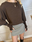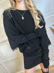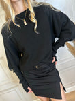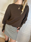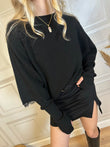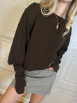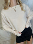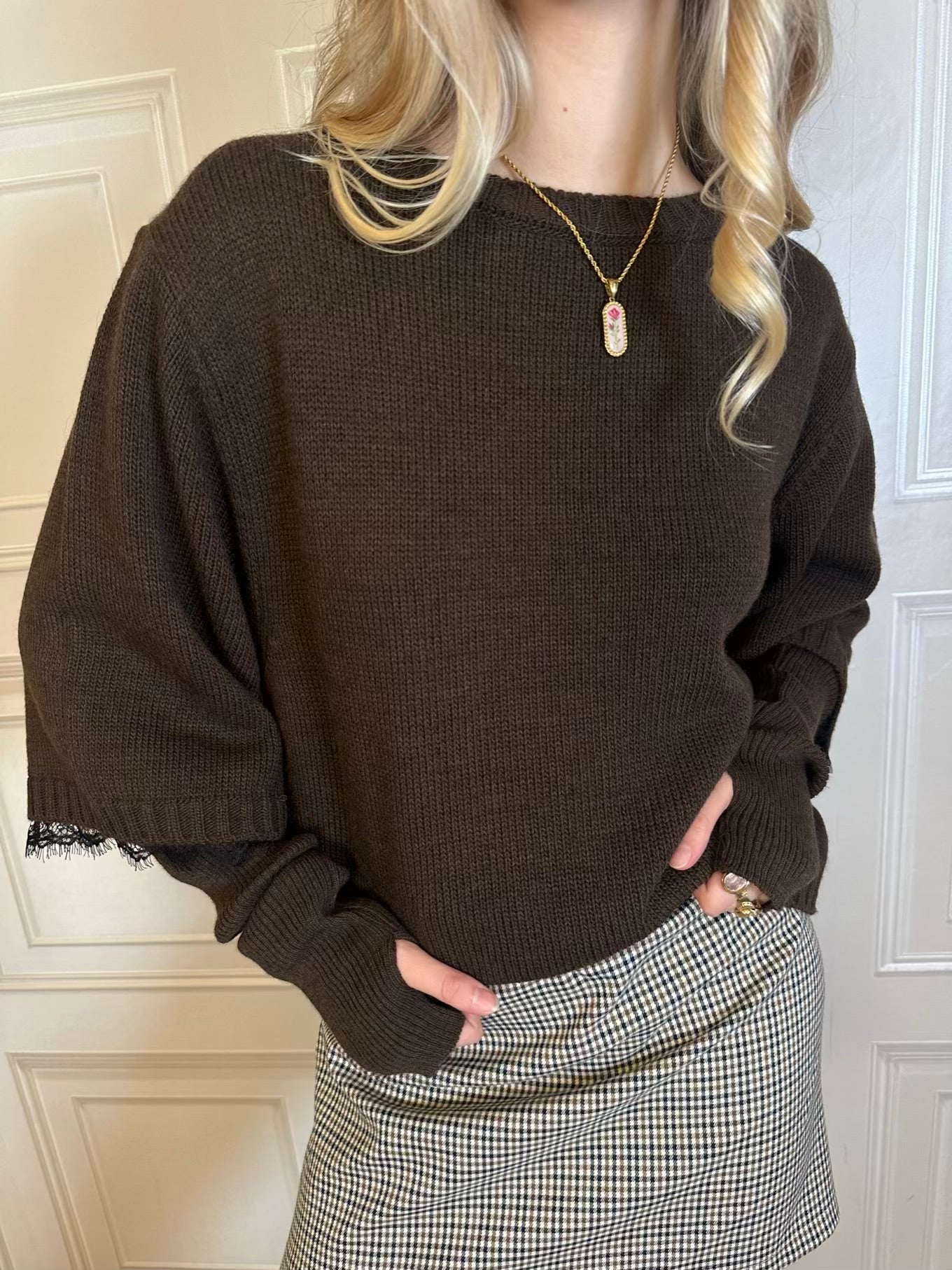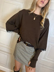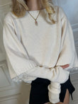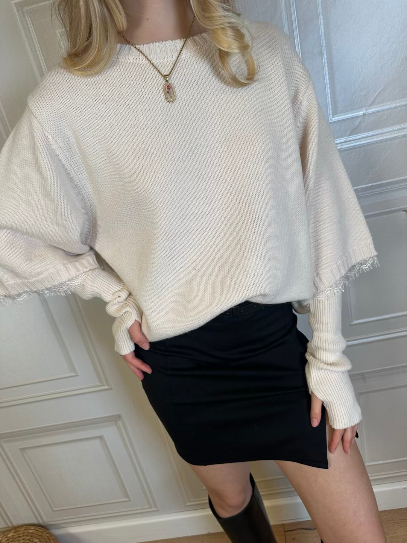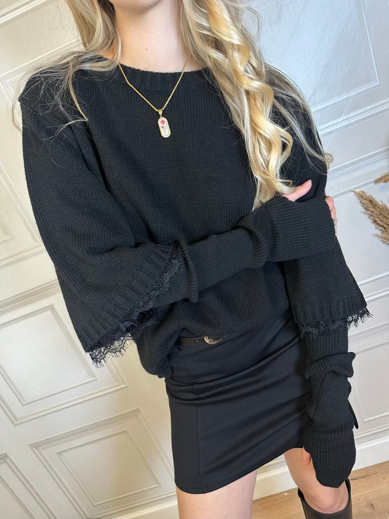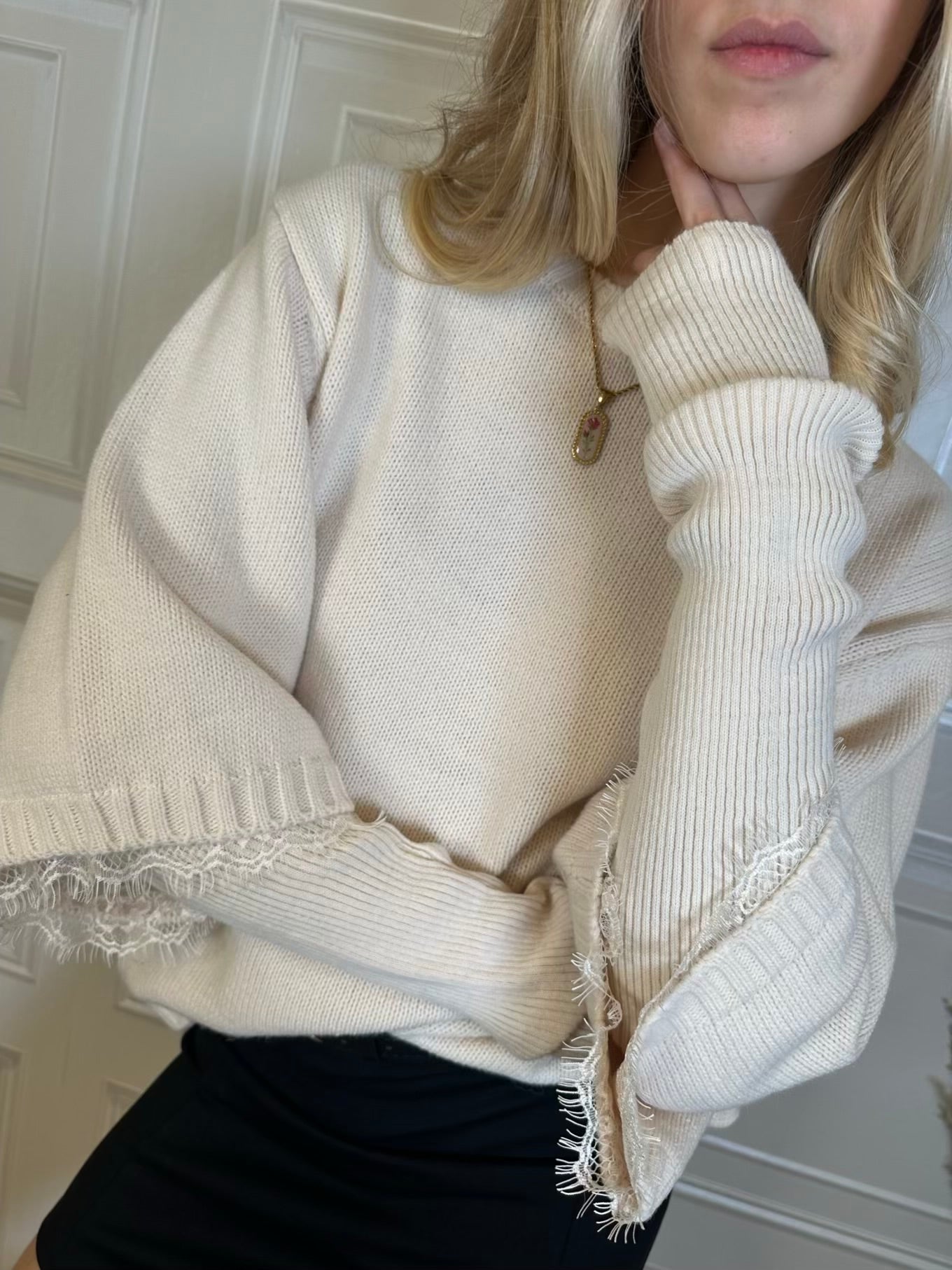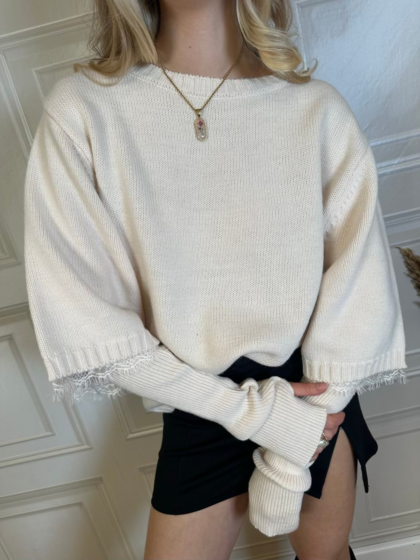 Maglia modello a scatoletta. Manica a tre quarti bordata in pizzo e manicotti. Taglia unica. Vestibilità leggermente morbida.