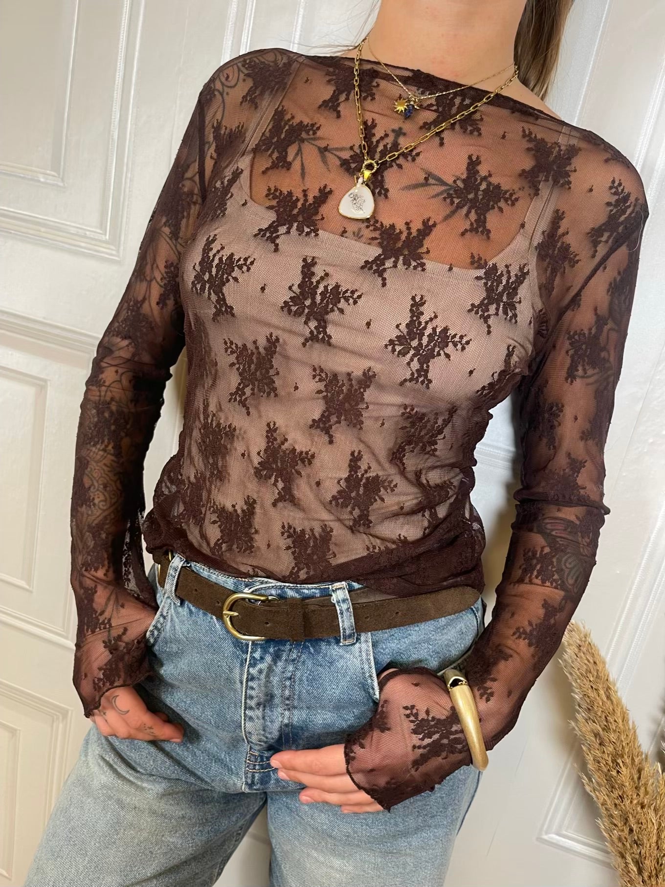 Maglia girocollo in pizzo a manica lunga.
