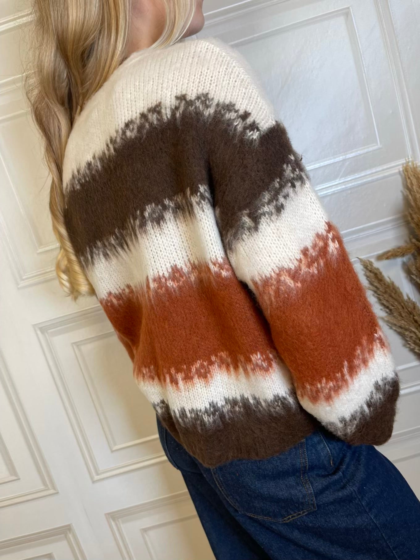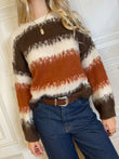 Maglione a righe sui toni del coccio, burro e moro.