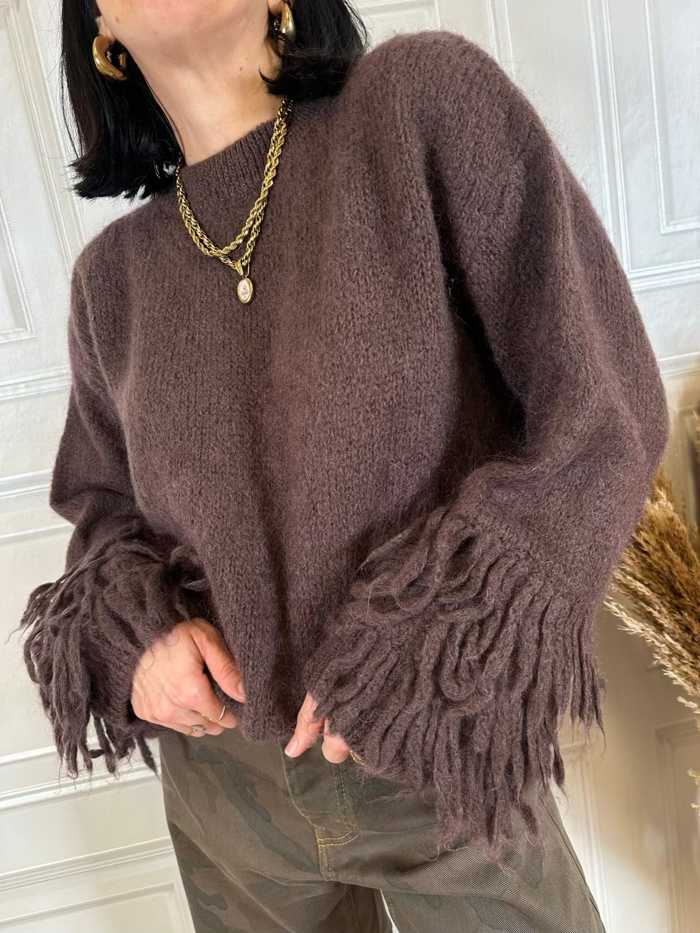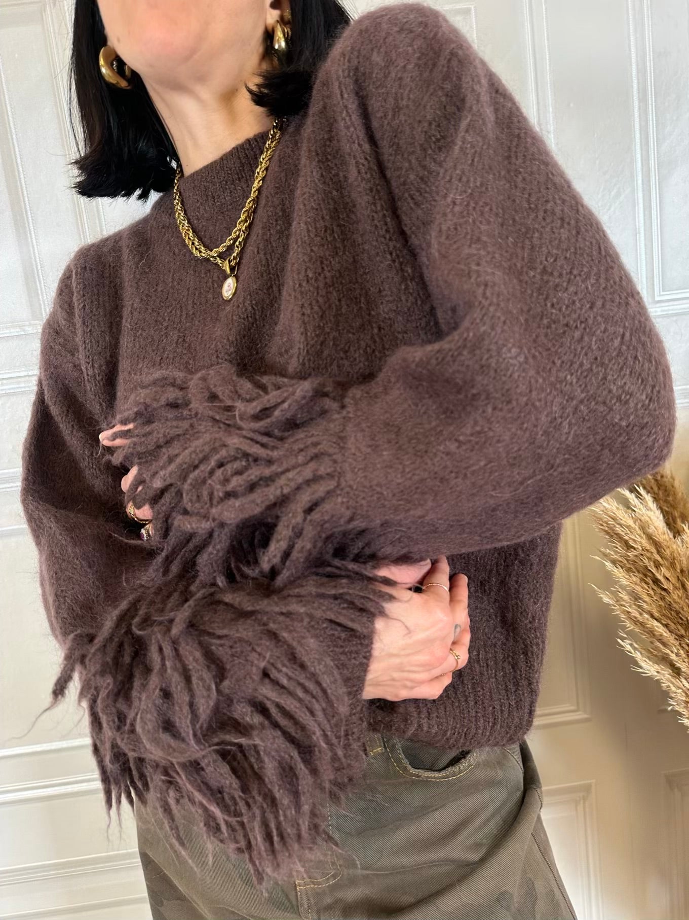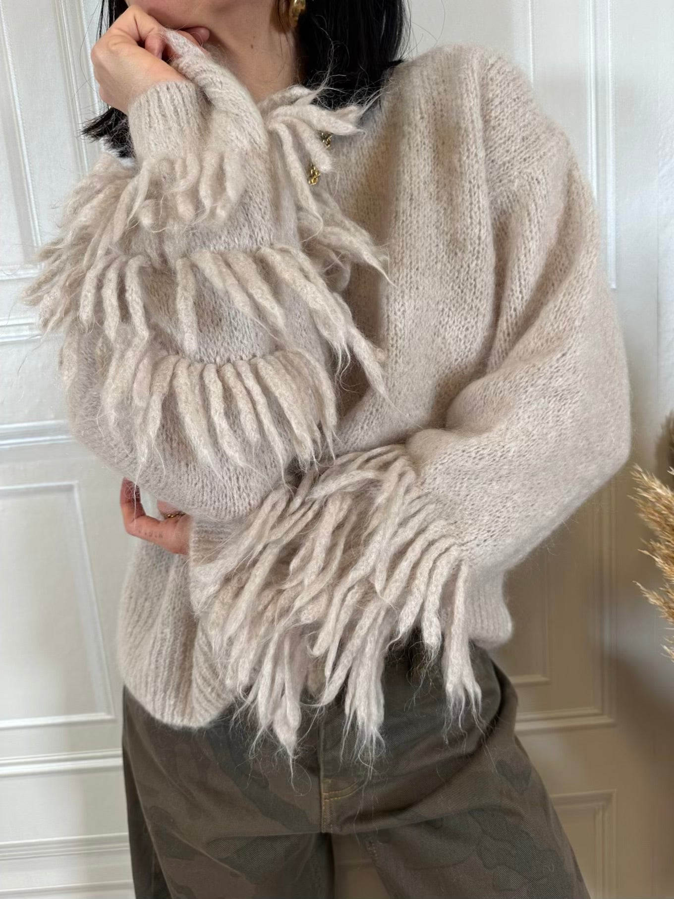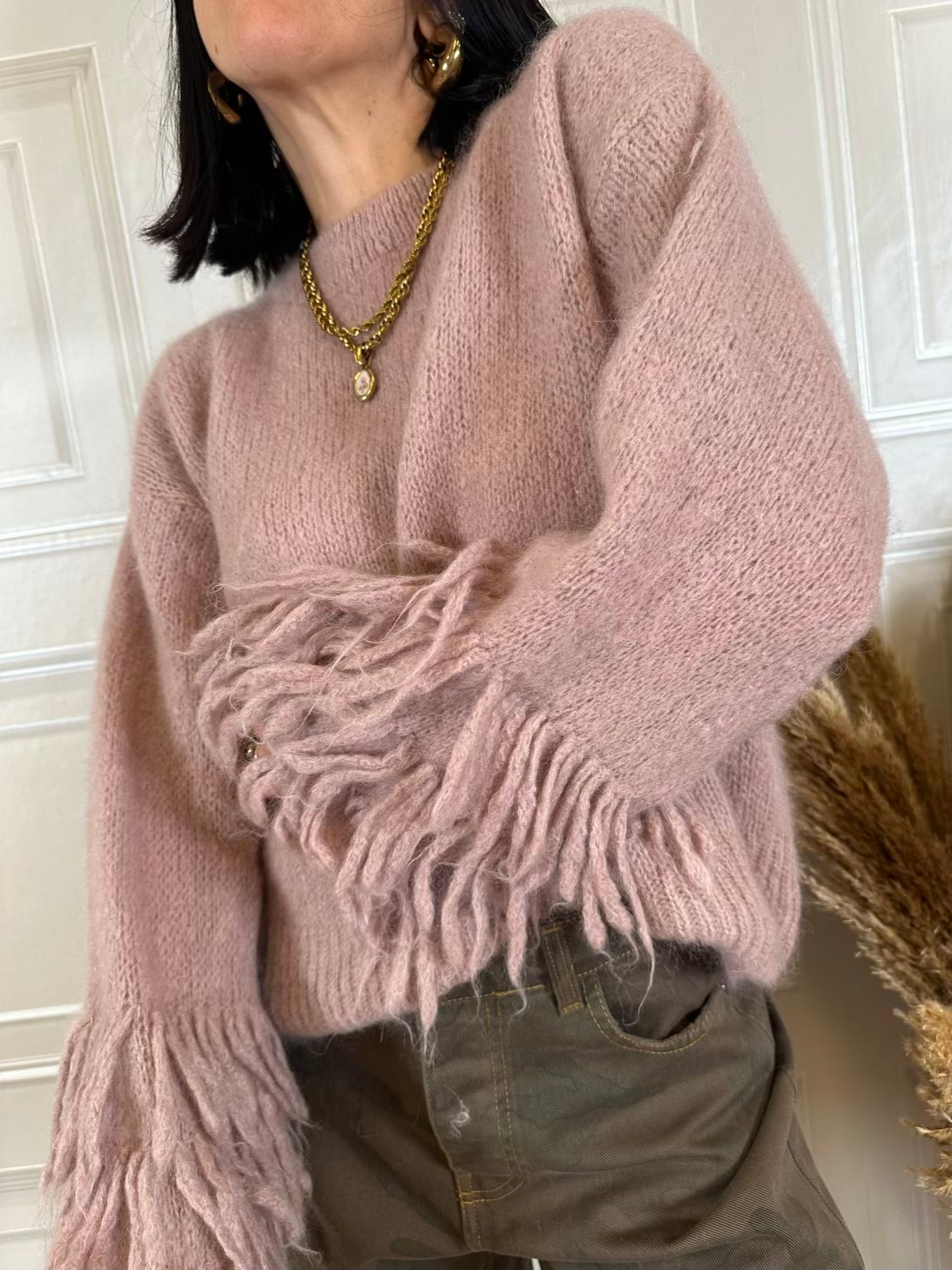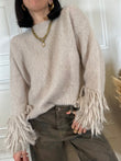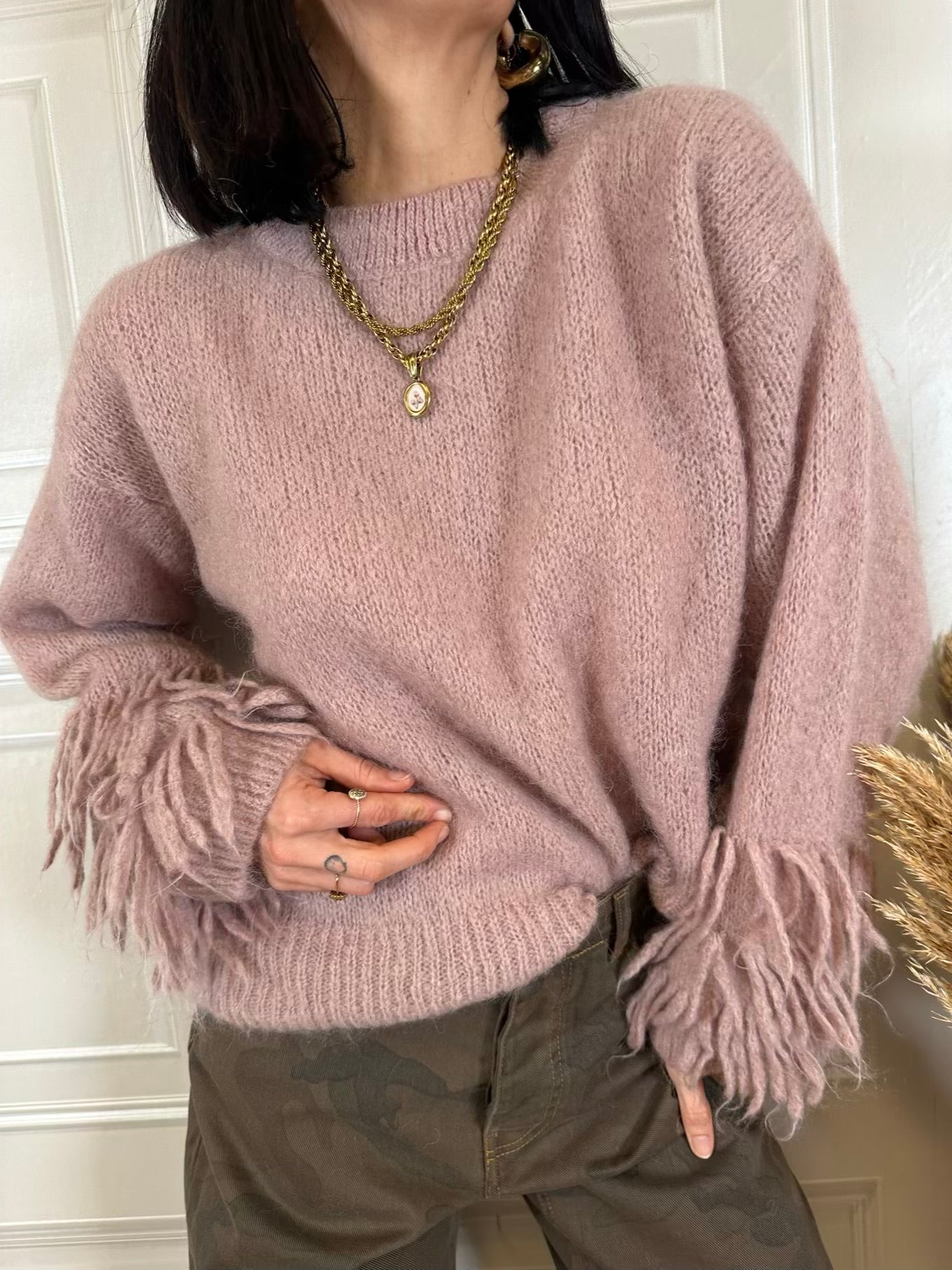 Maglione over a girocollo in mohair, particolarità di frange sul polso.