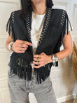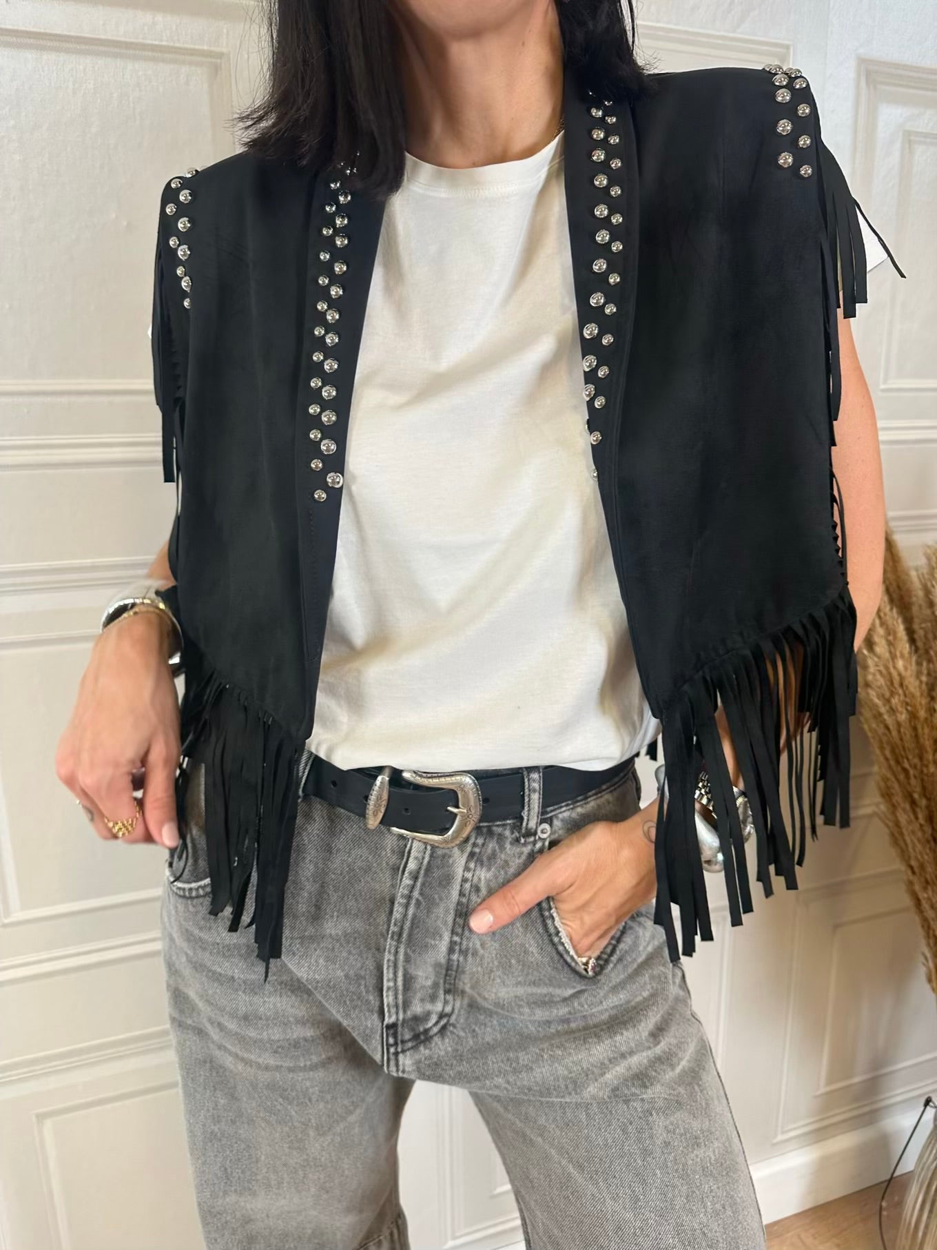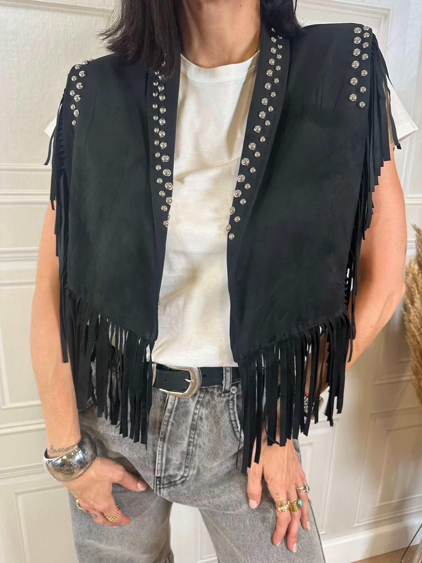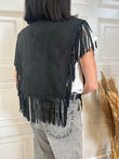 Mantellina in dainetto colore nero. Frange sul giro manica e fondo. Spalline imbottite.