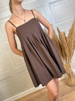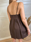Abito corto tinta unita. Modello con pinces cucite su corpetto e gonna balloon. Allacciatura con zip su retro. Spallina sottile regolabile il collo. in foto Taglia S, vestibilità regolare.