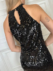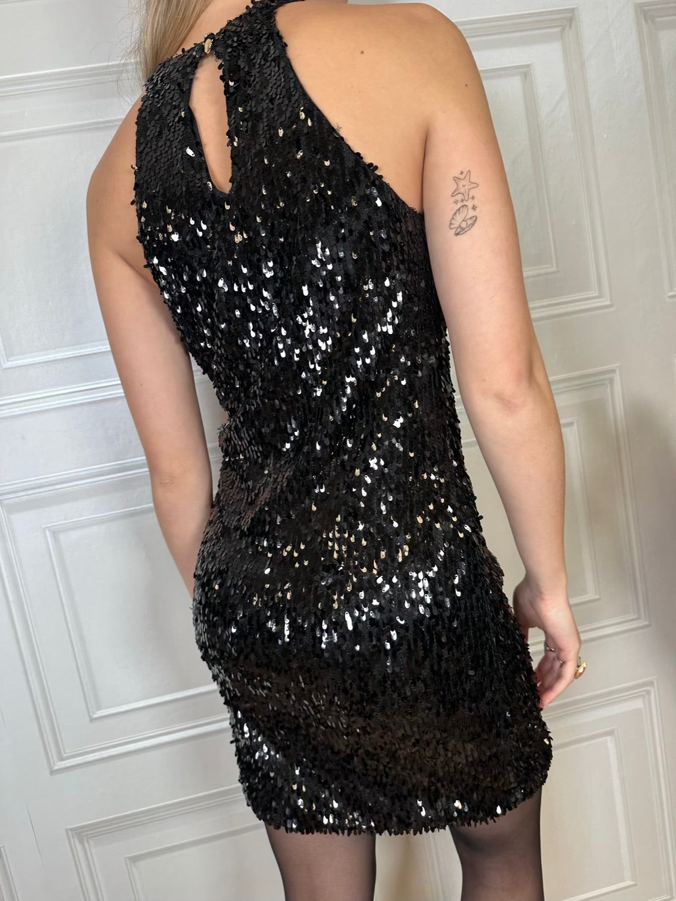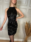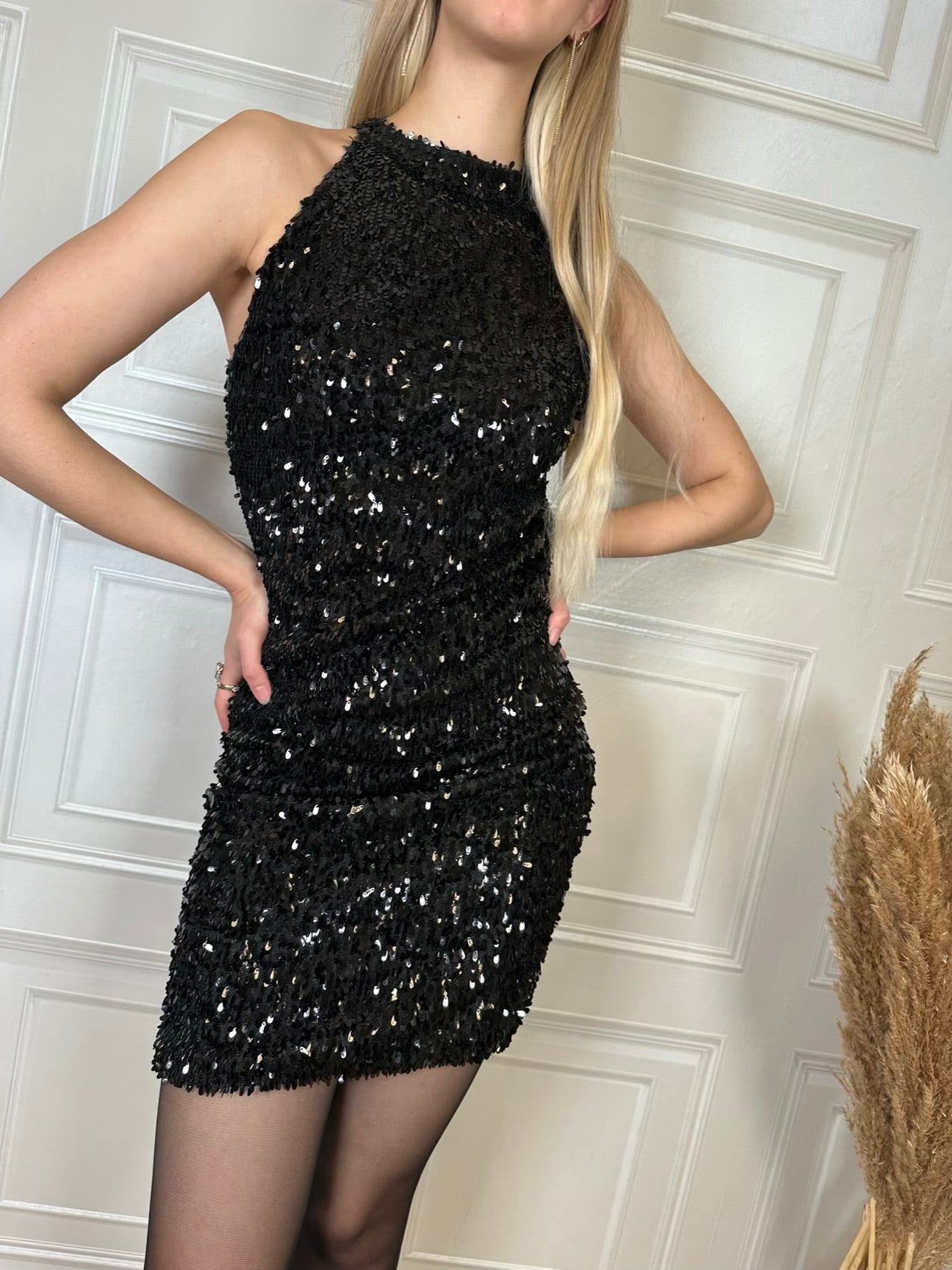 Mini abito in tessuto ricoperto di paillettes a goccia. Modello con scollo vogatore. Chiusura con doppio bottoncino sul retro. Foderato all’interno.