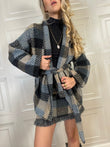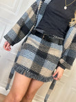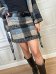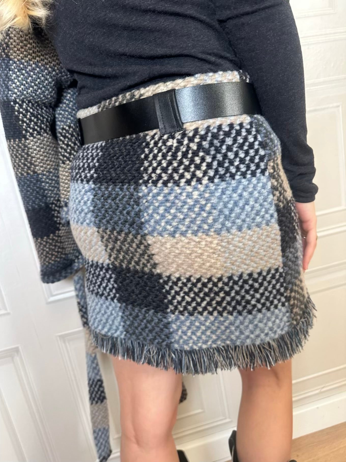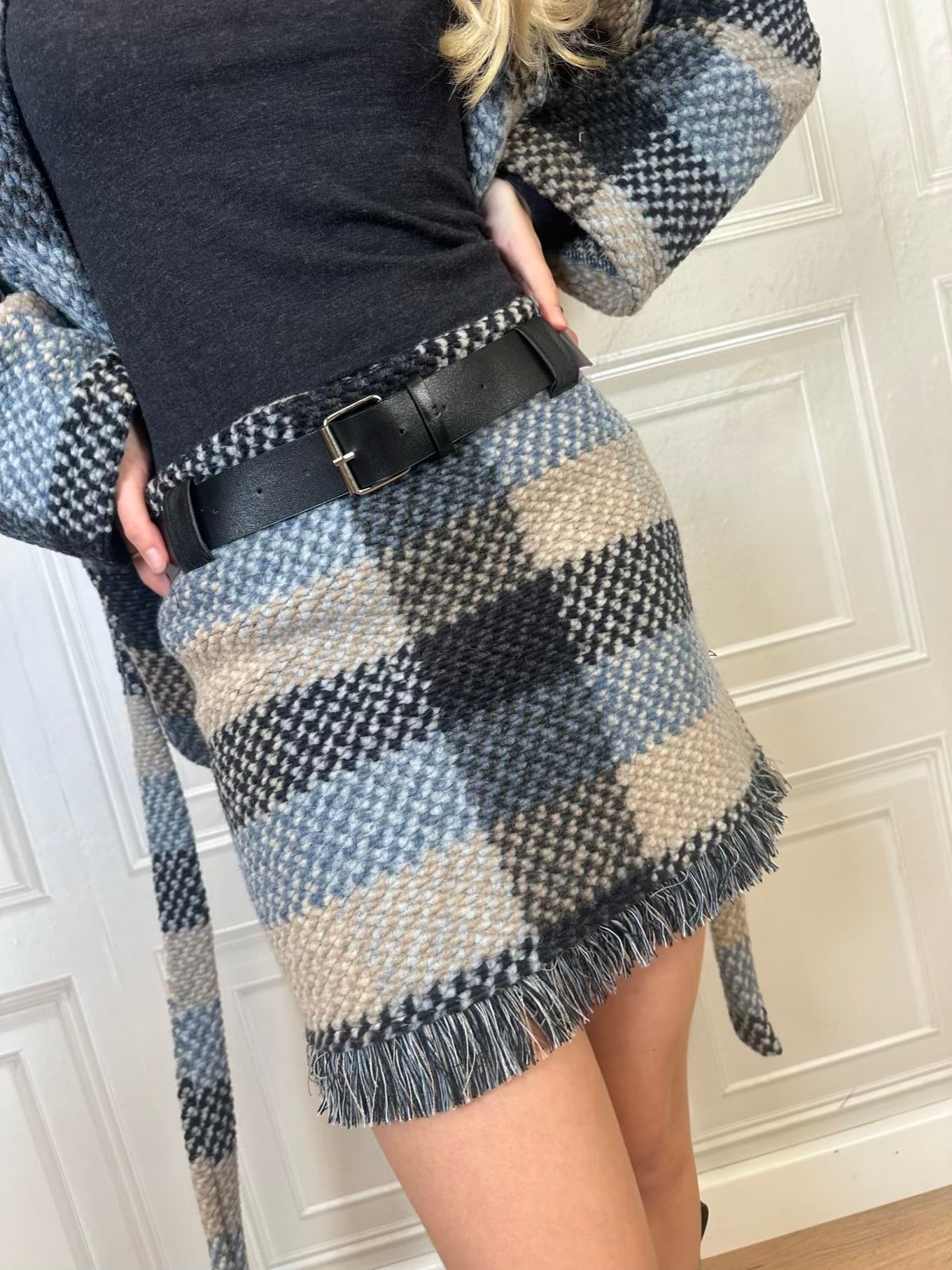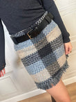 Gonna fantasia check in morbida maglia con frange sul fondo. tonalità del celeste, nero e taupe. Passanti in ecopelle e cintura in ecopelle nera compresa. Chiusura laterale con zip. In foto taglia S.