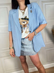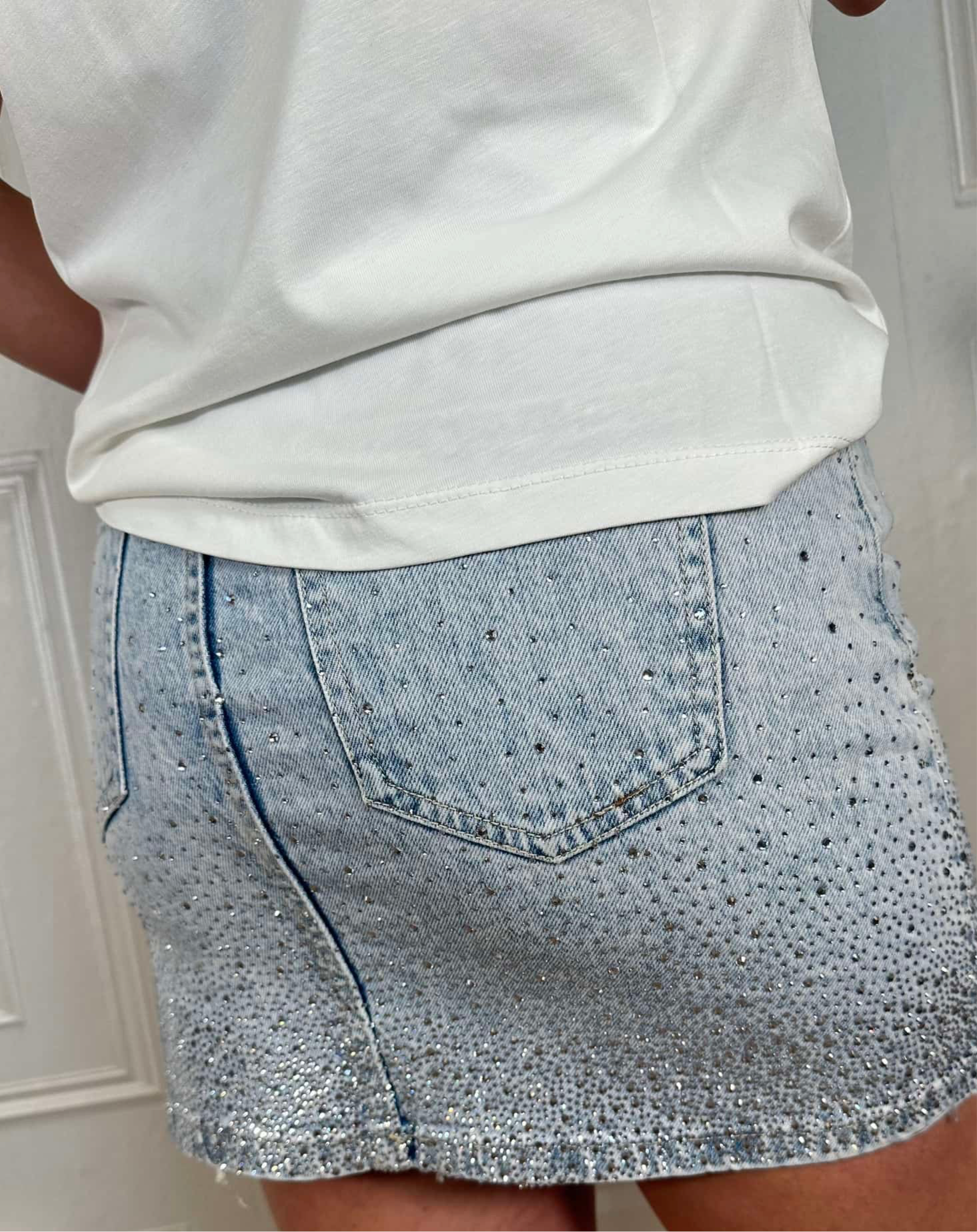 Minigonna di jeans lavaggio chiaro con pioggia di strass. 5 tasche con chiusura con zip e bottone.