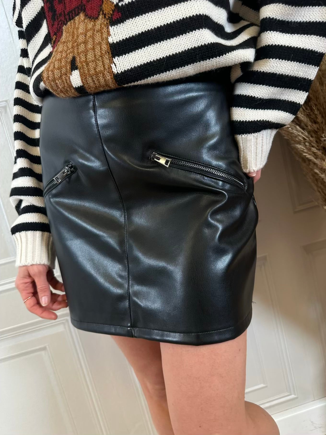 Minigonna ecopelle con cucitura su fronte e retro. Modello con taschini finti con zip obliqua. Chiusura con zip laterale. In foto taglia S, vestibilita’ regolare. Lunghezza 38cm circa