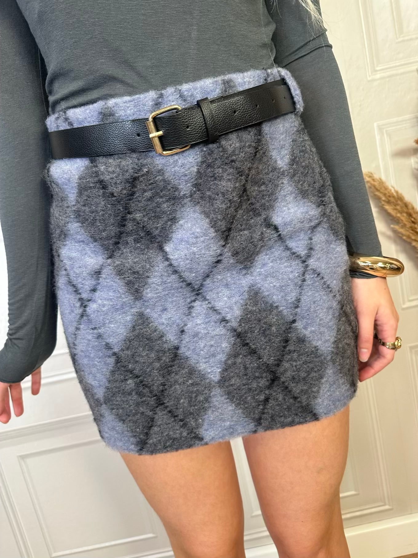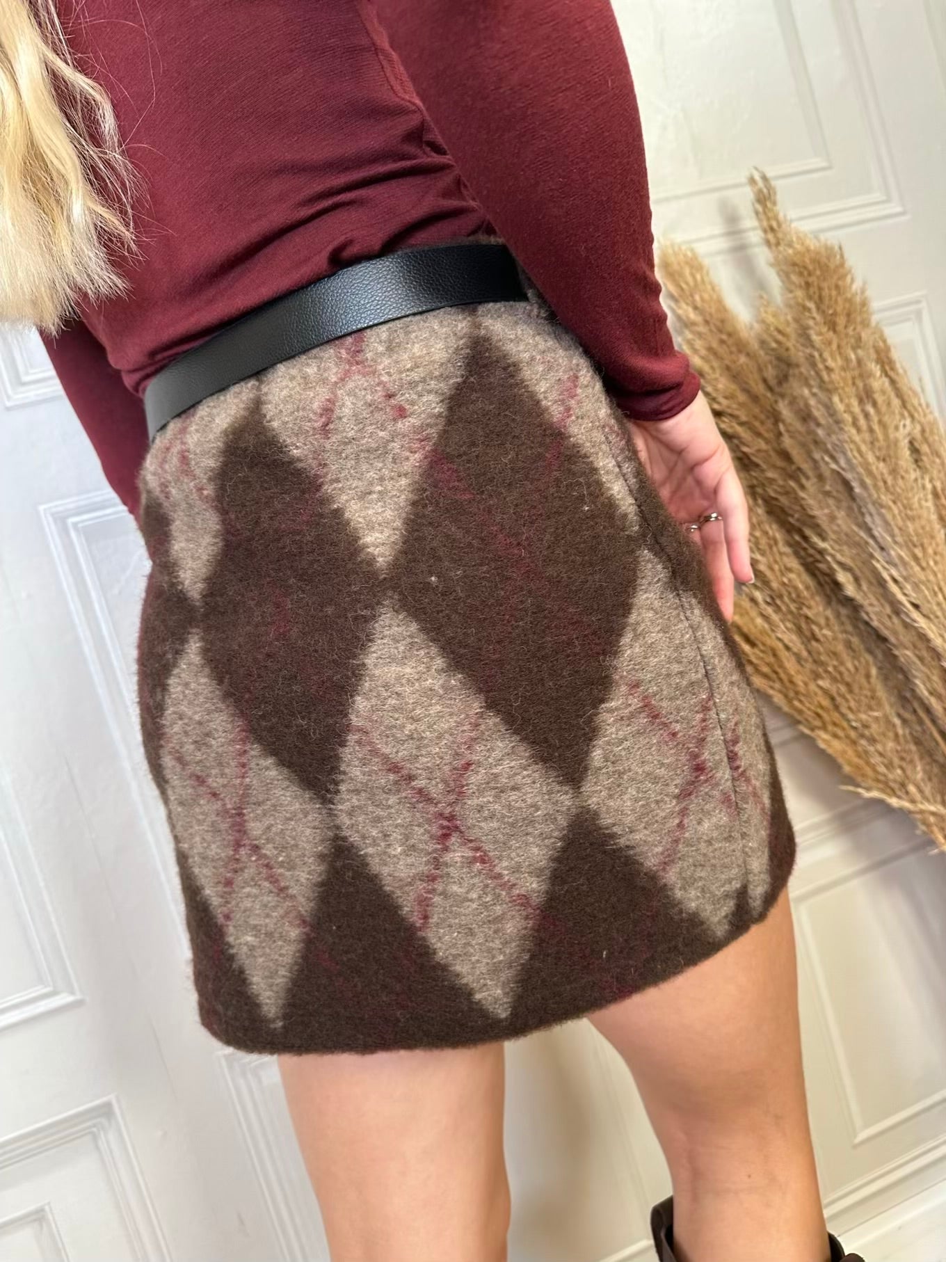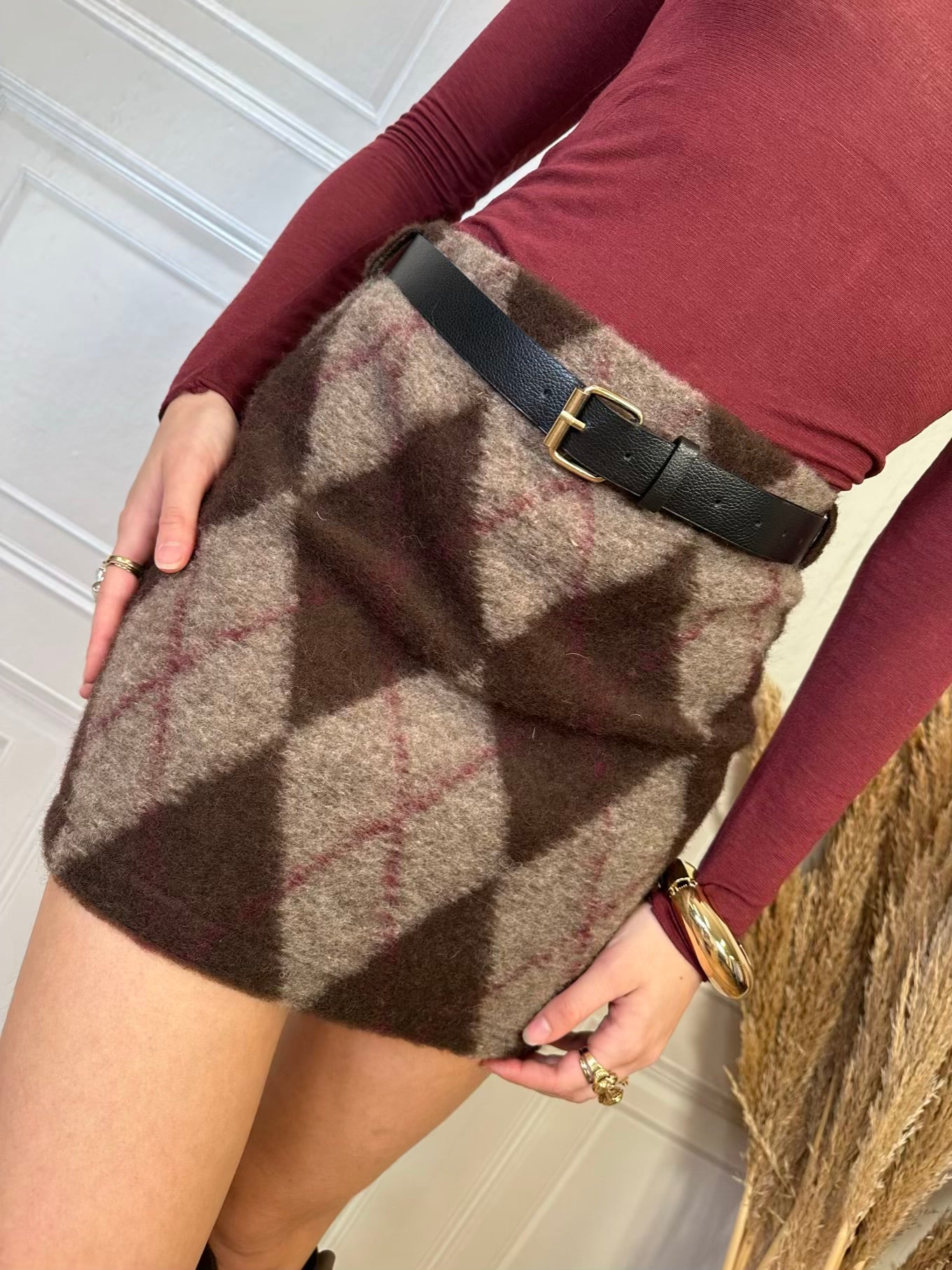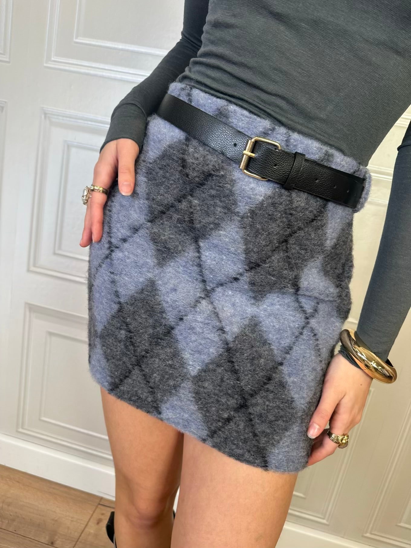 Minigonna a fantasia losanghe in pannetto. Elastico in vita e cintura in eco pelle, con fibbia dorata compresa.