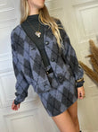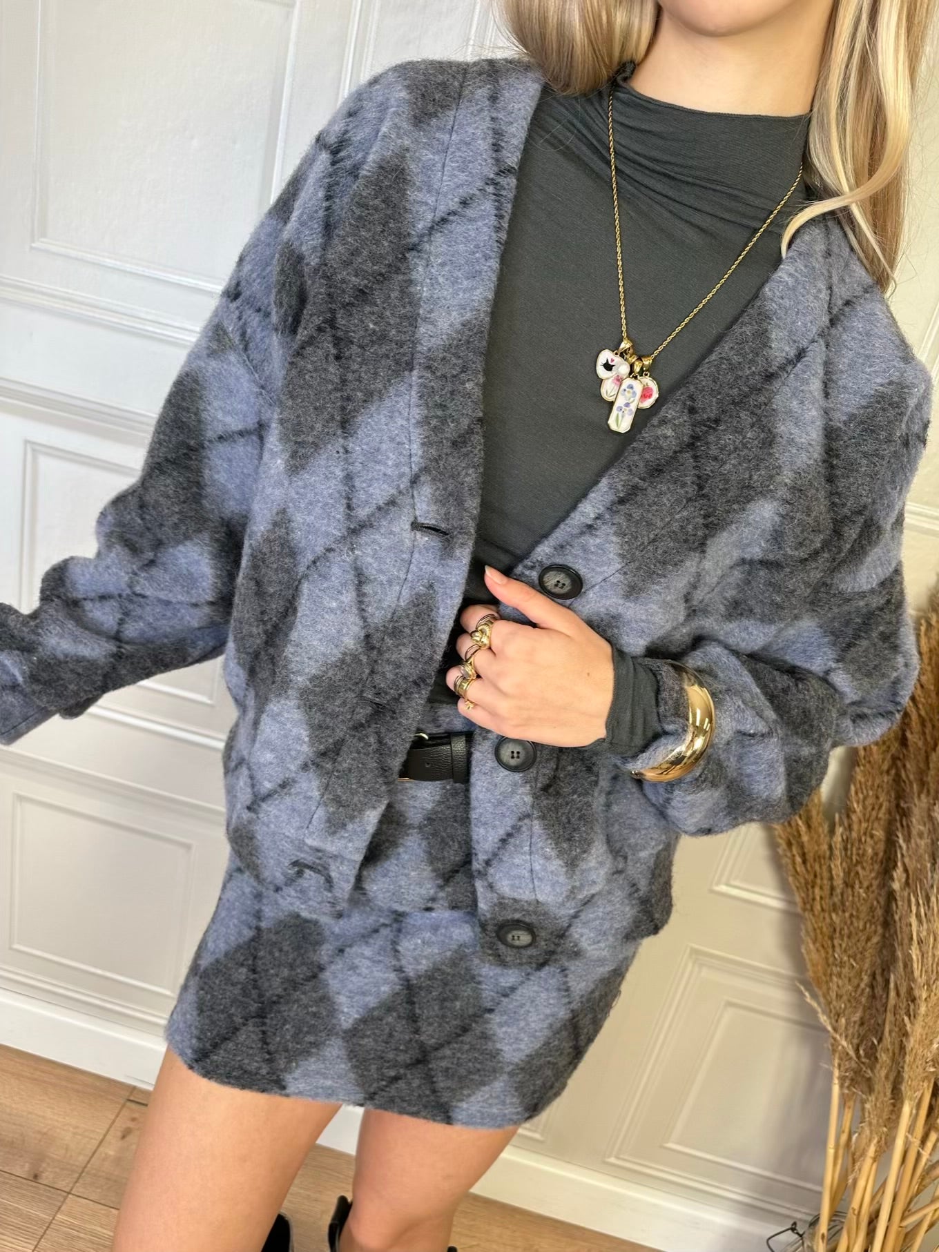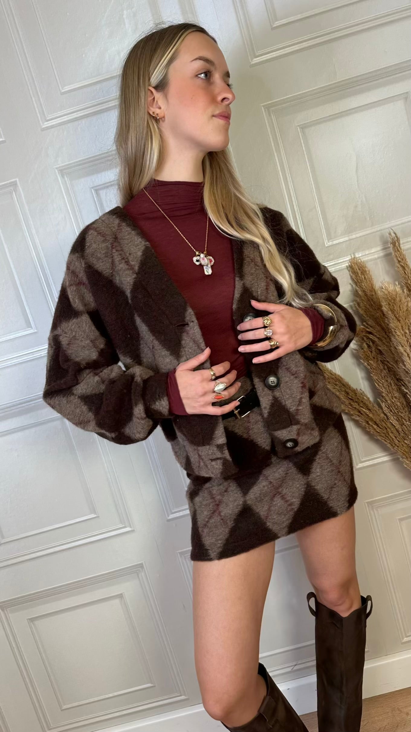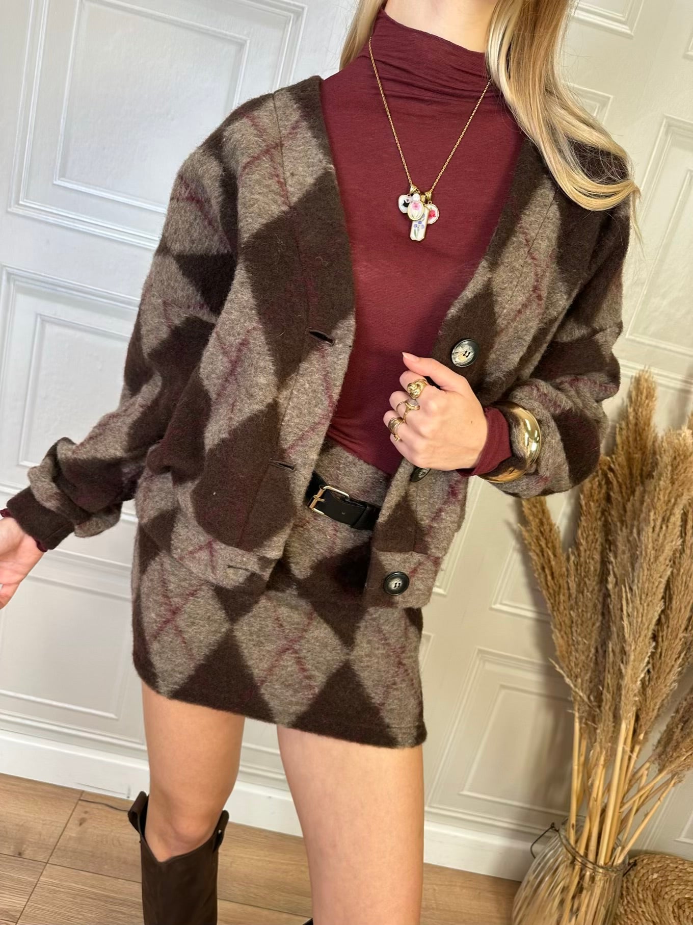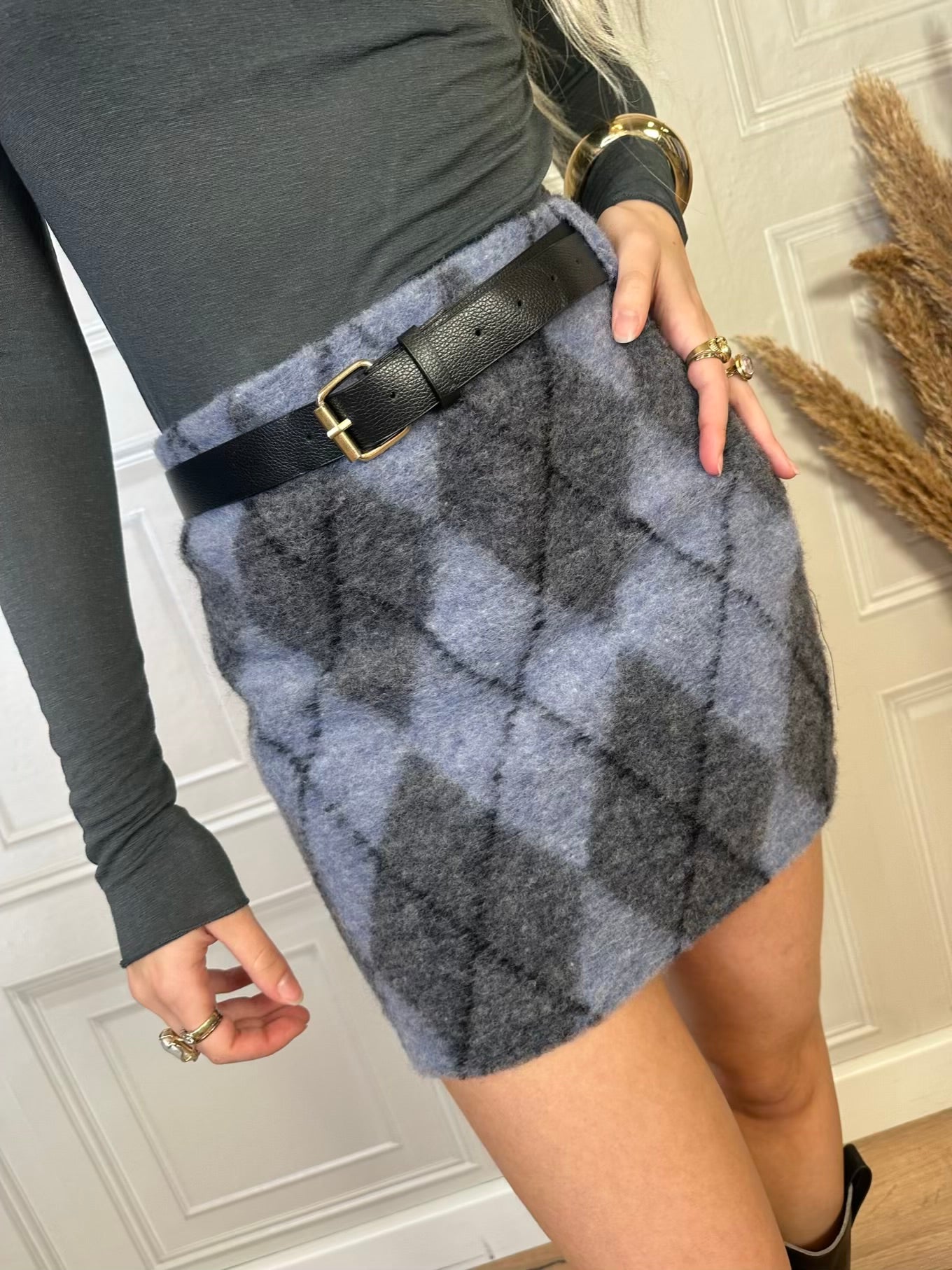 Minigonna a fantasia losanghe in pannetto. Elastico in vita e cintura in eco pelle, con fibbia dorata compresa.