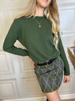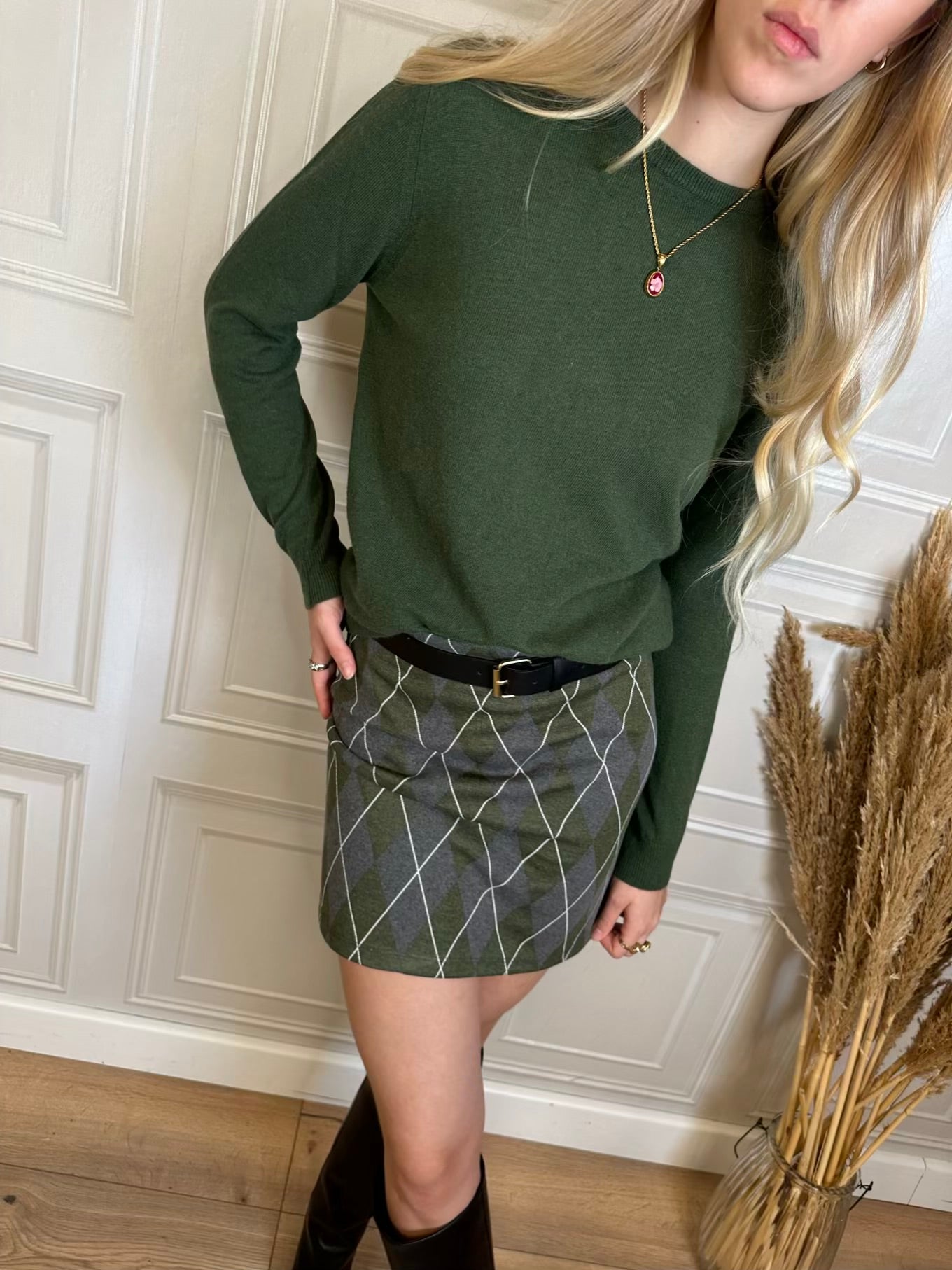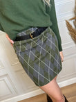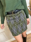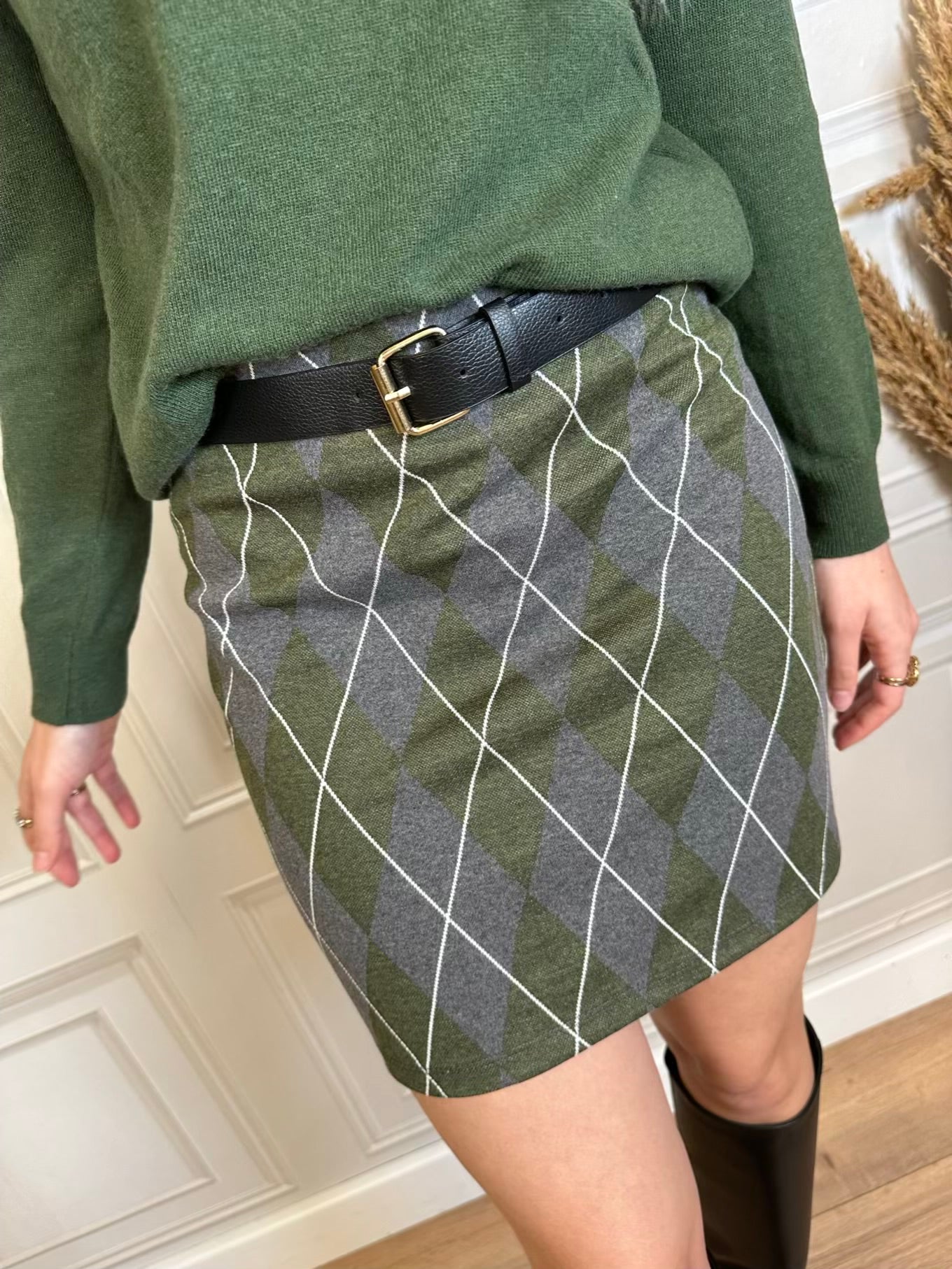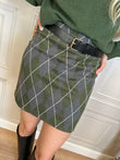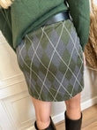 Minigonna a fantasia losanghe sui toni del verde, grigio e bianco. Elastico in vita. Cintura in eco pelle compresa.
