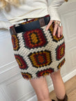 Gonna fantasia Navajo in morbida maglia con frangette sul fondo tonalità del panna, moro, senape, India. Passanti in ecopelle e cintura in ecopelle nera compresa. Chiusura laterale con zip. In foto taglia S.