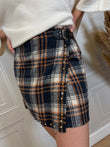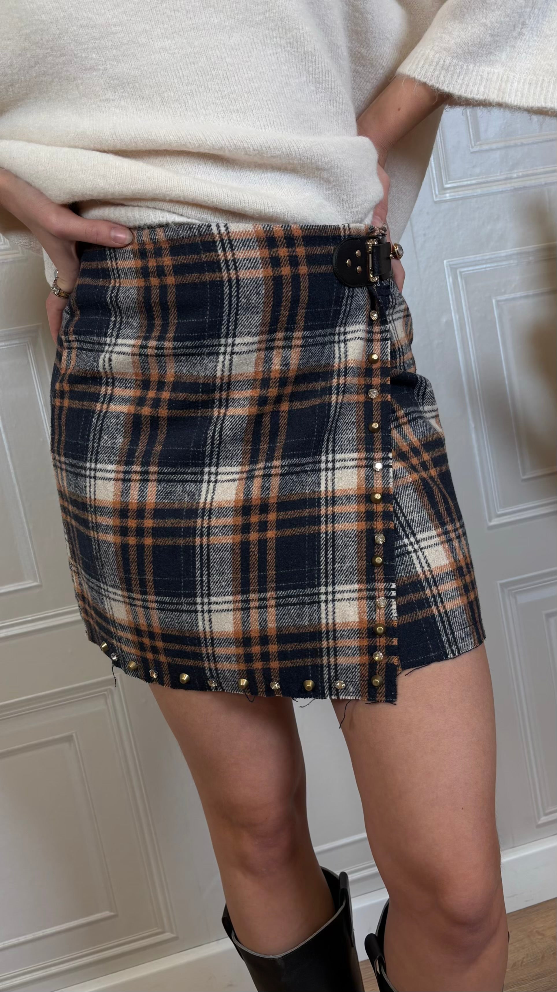 Gonna Check modello portafoglio profilata con borchie e strass nelle tonalità del blu mattone e burro. Chiusura laterale con fibbia con borchie e bottone interno. In foto taglia S.