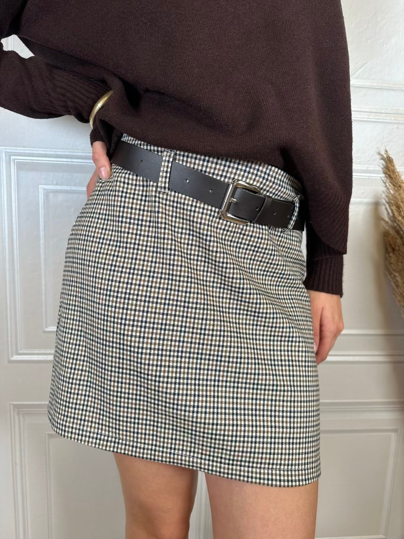 Minigonna a quadretti. Chiusura con zip laterale e cintura compresa con fibbia dorata.