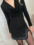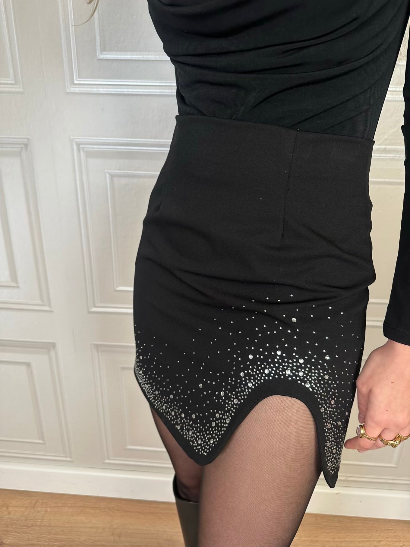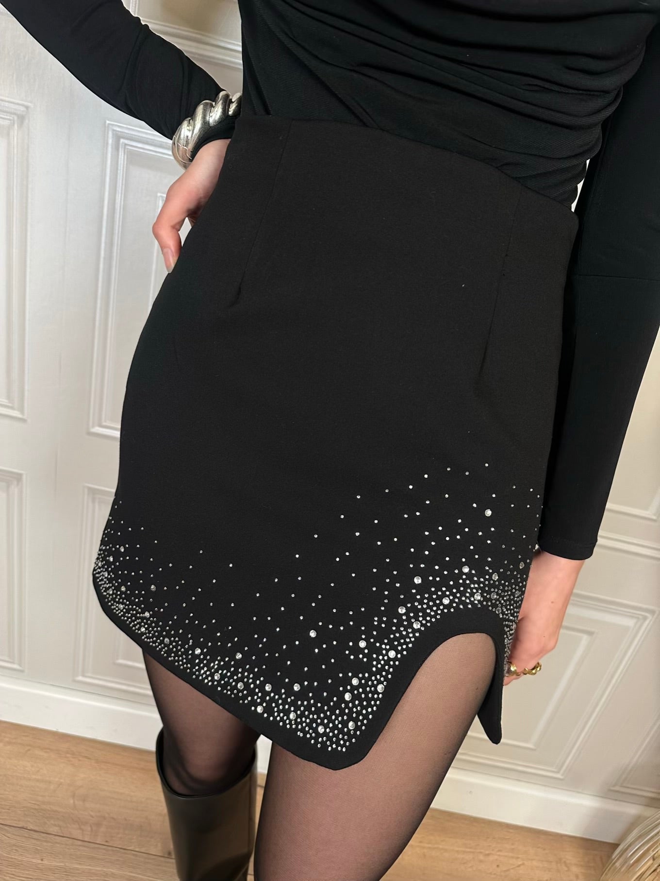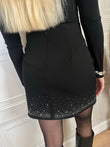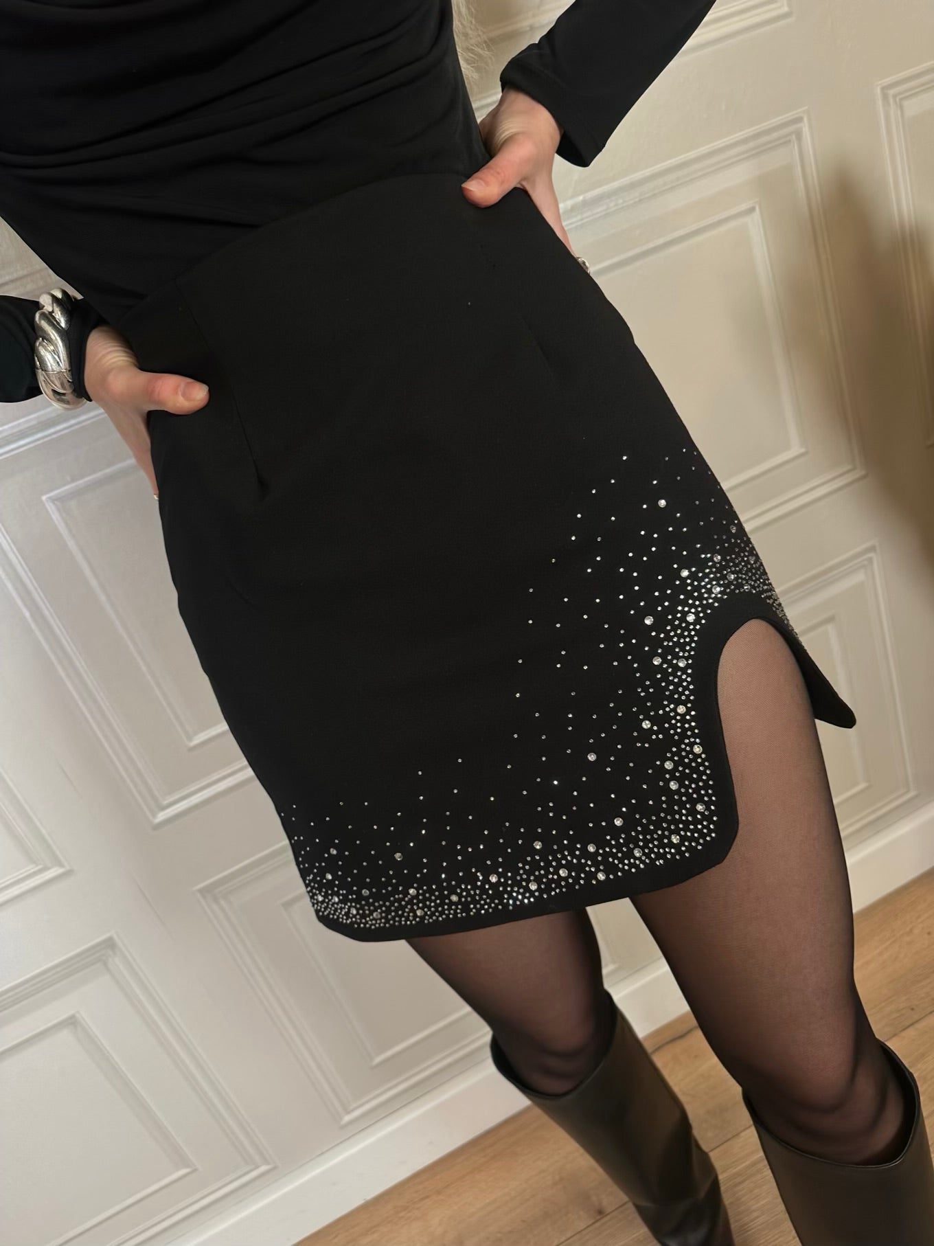 Minigonna in tessuto nero con fondo tempestato di strass. Modello con spacco laterale sul fondo e chiusura con zip sul retro. Foderata all’interno.