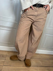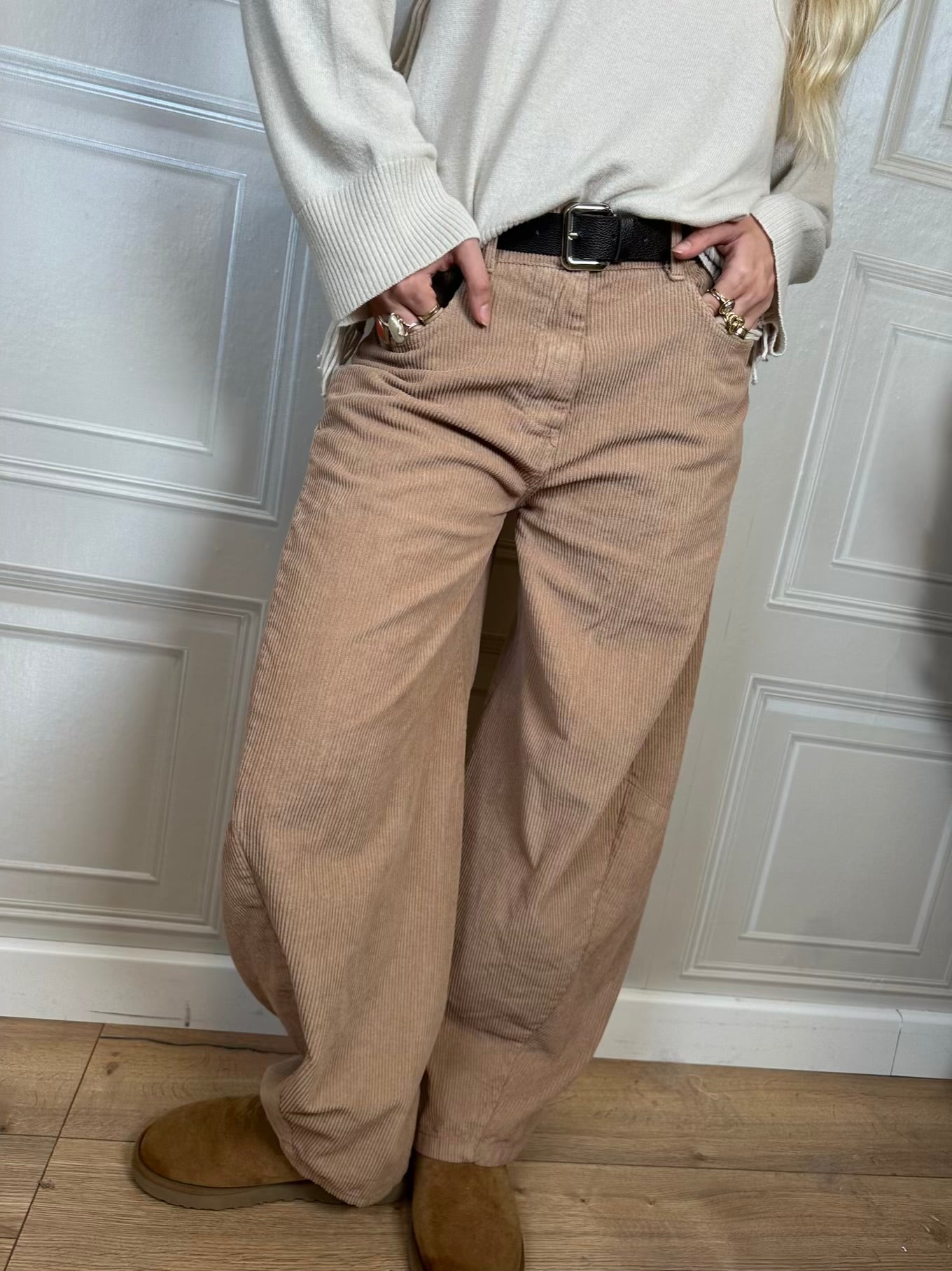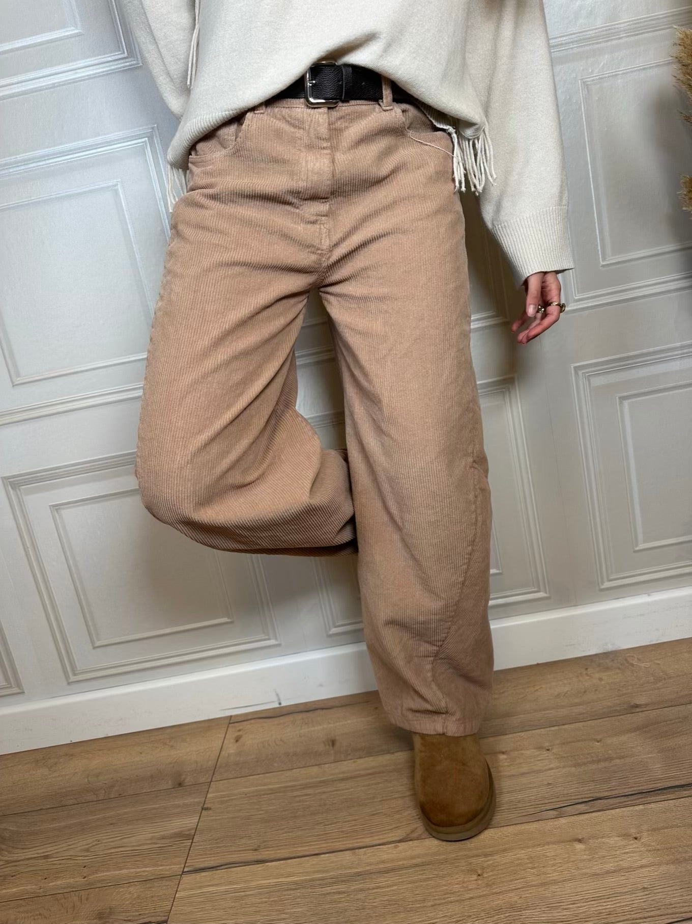 Pantalone modello barrel fit a coste di velluto. 5 tasche con chiusura con zip e bottone. Cucitura in sbieco lungo gamba. cintura compresa.