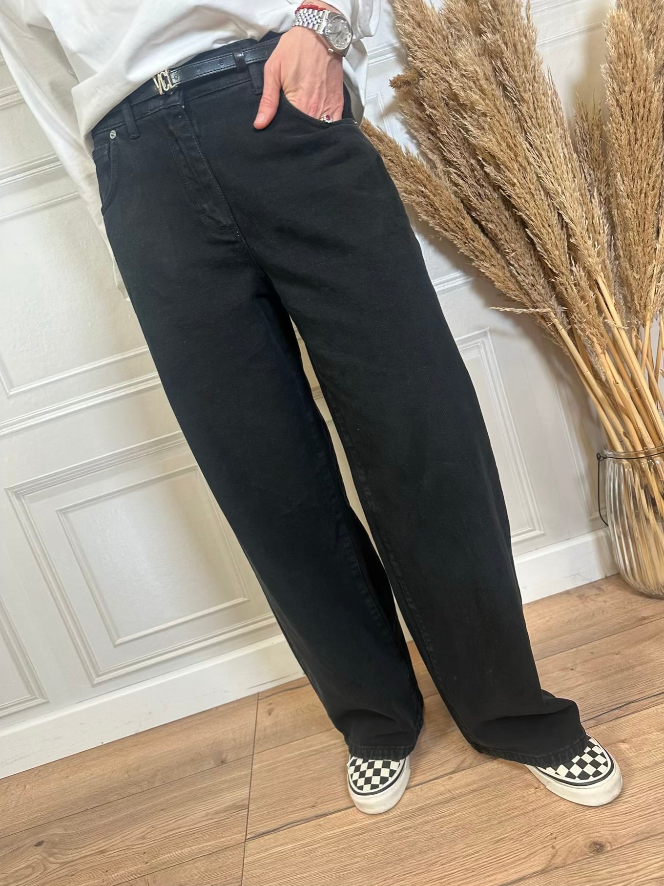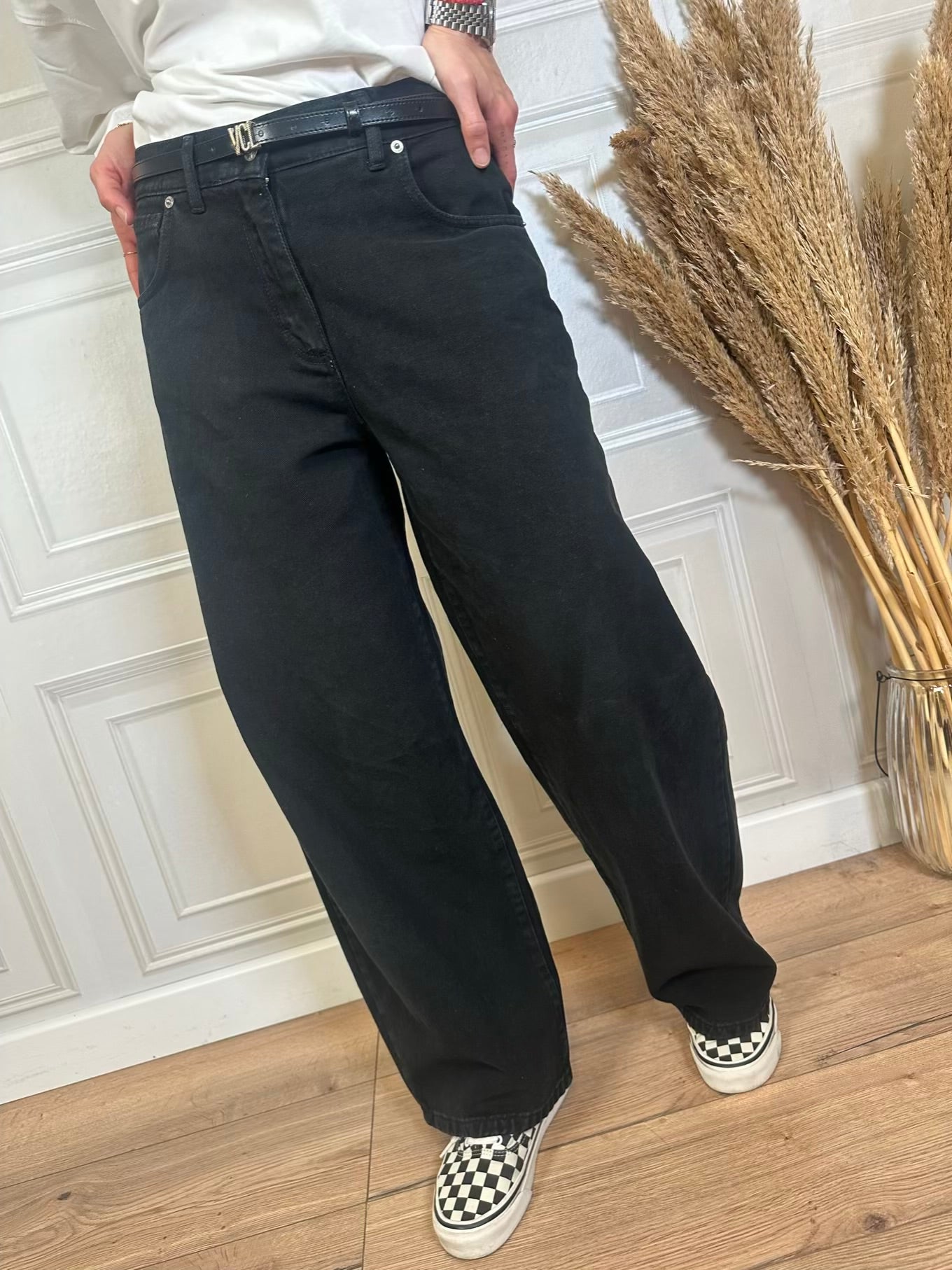 Pantalone bella modello gamba ampia e vita medio bassa.