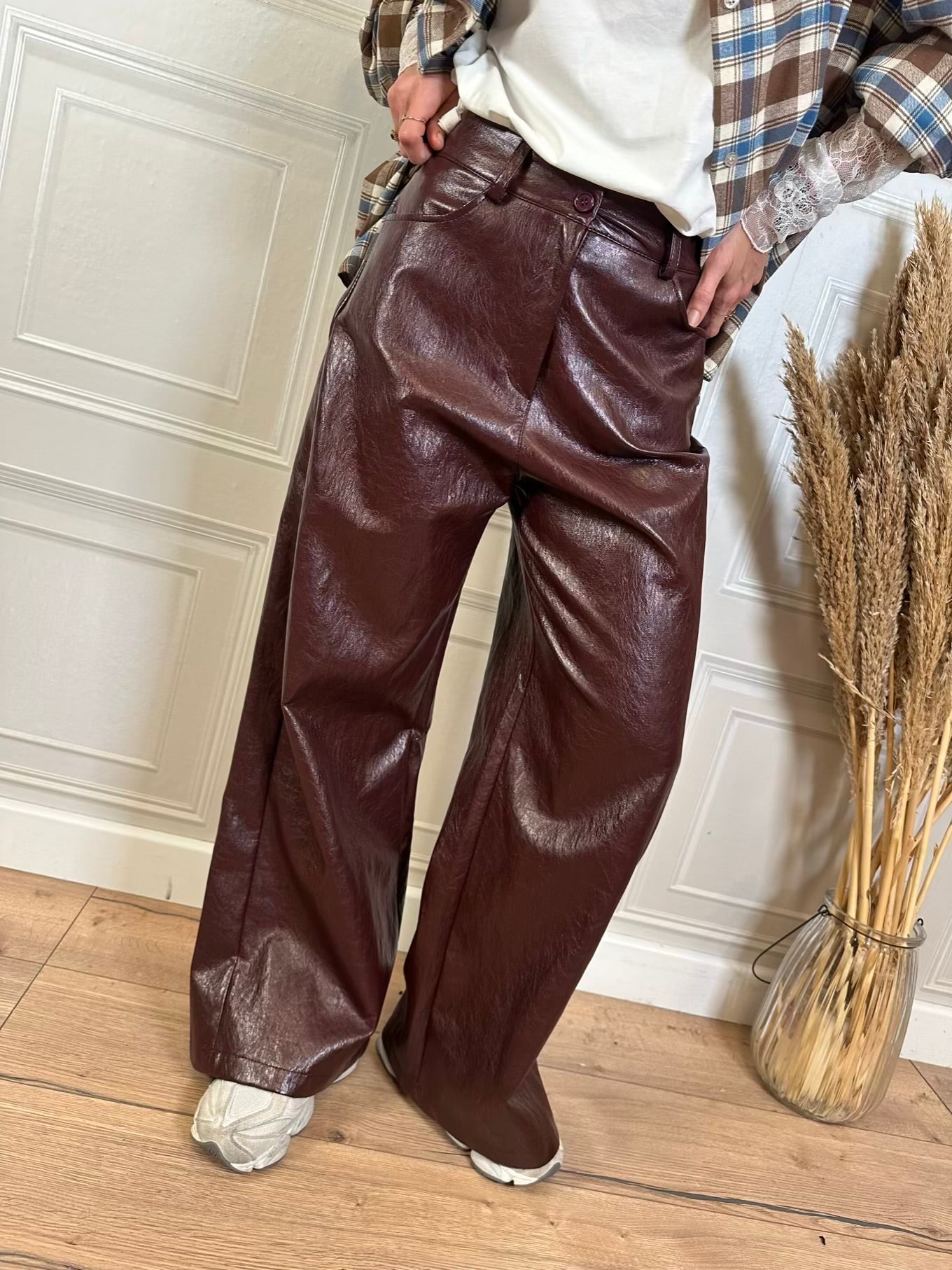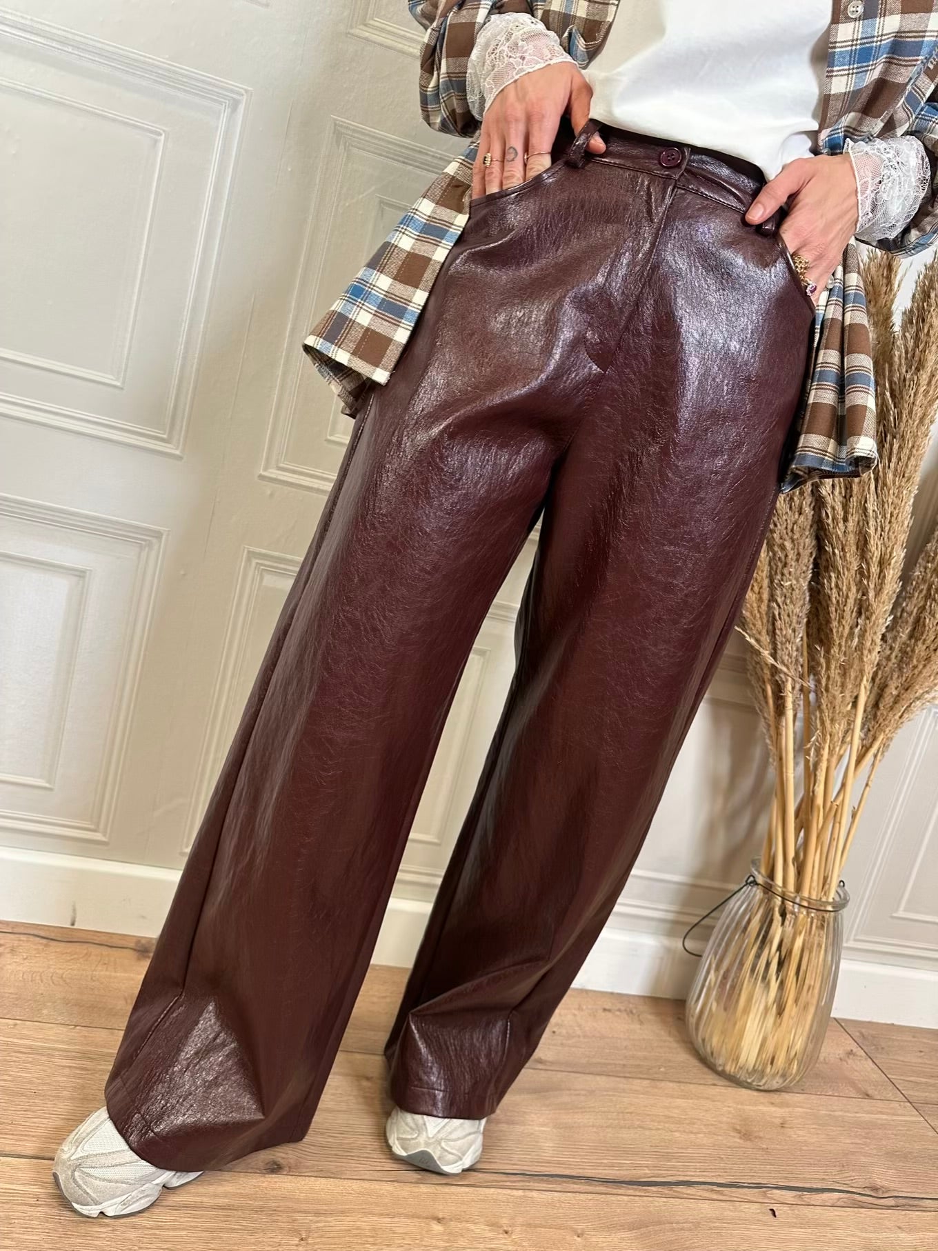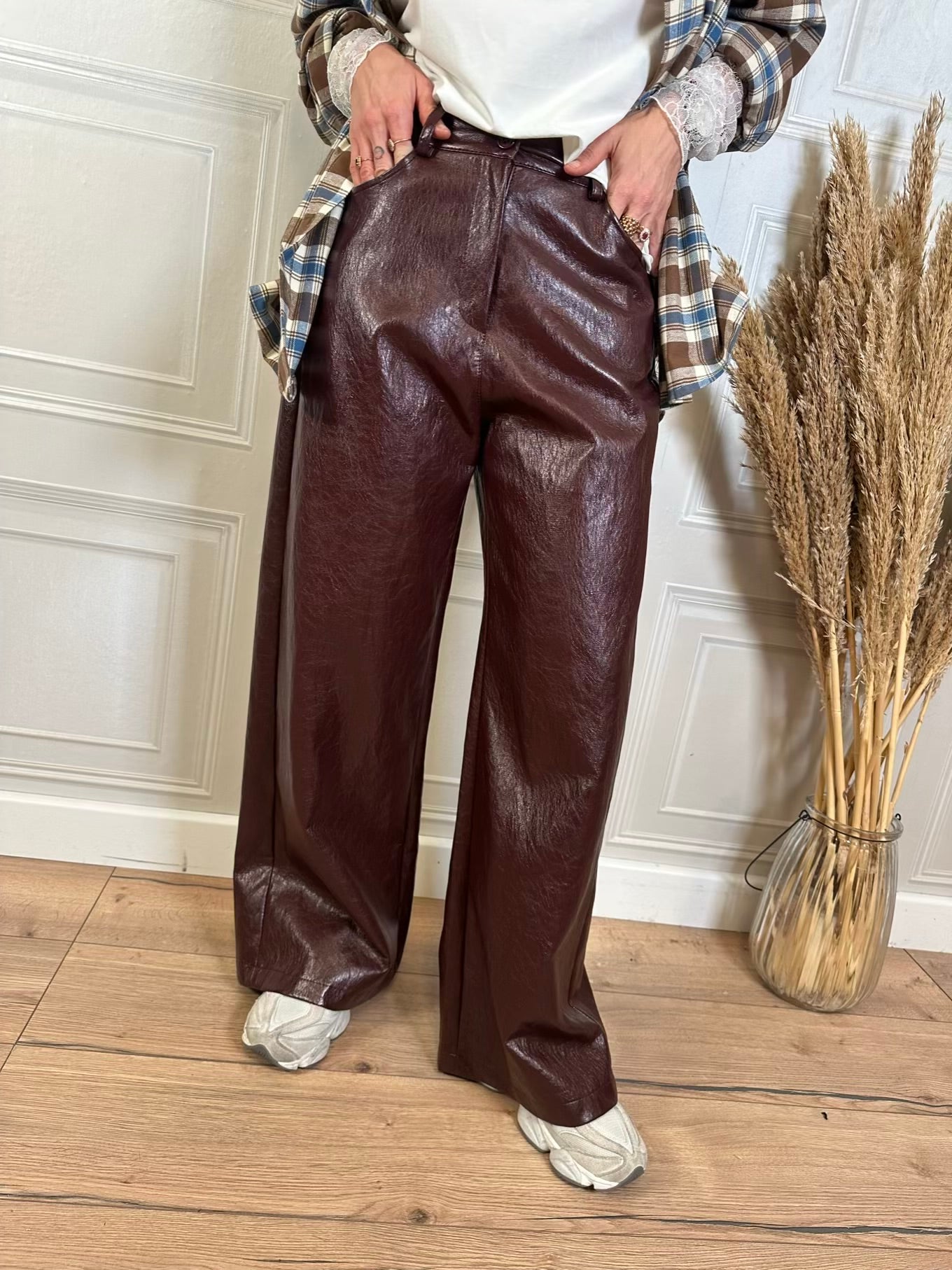 Pantalone largo in ecopelle effetto invecchiato. Modello gamba palazzo, quattro tasche, chiusura con zip e bottoncino.