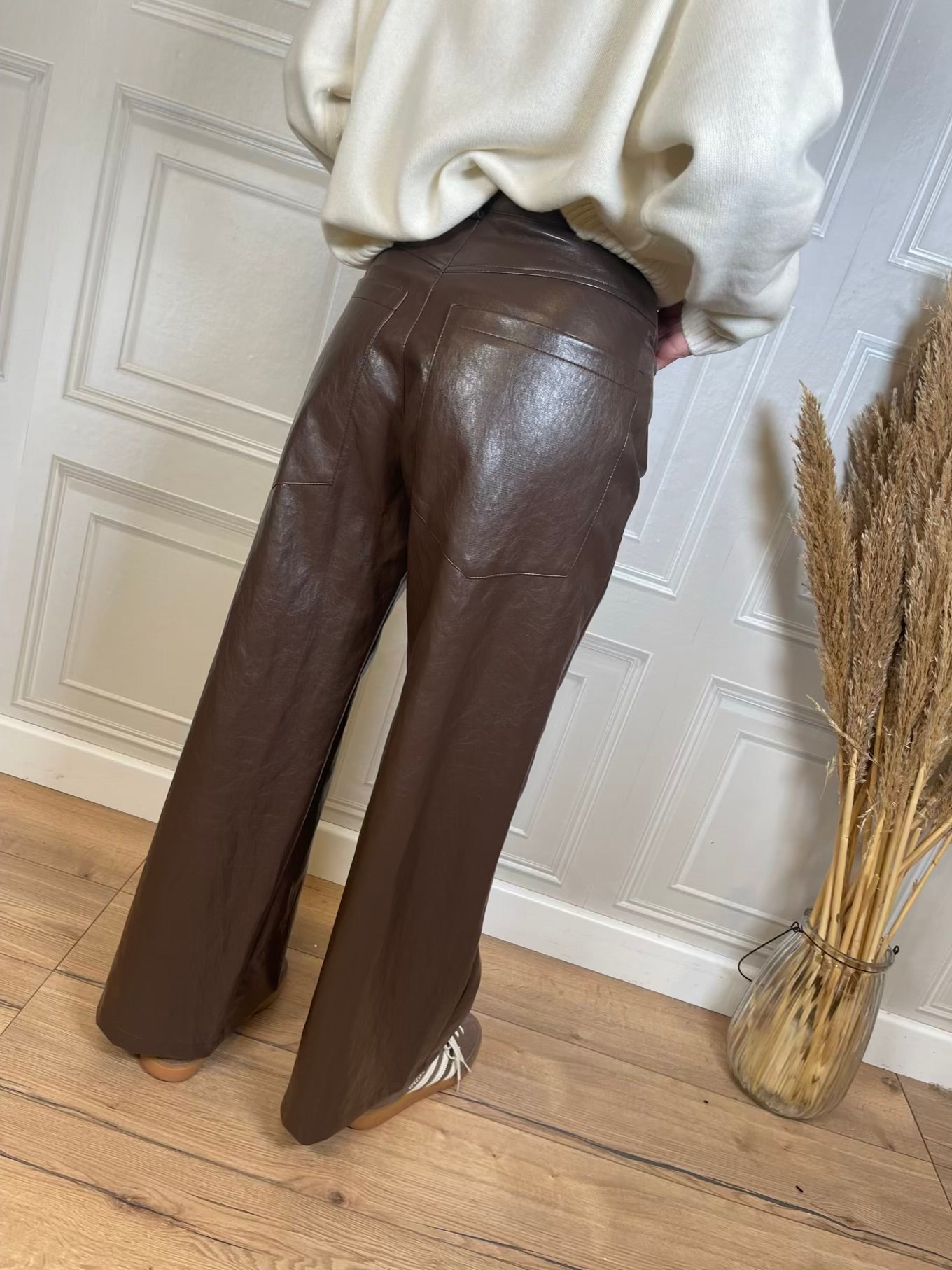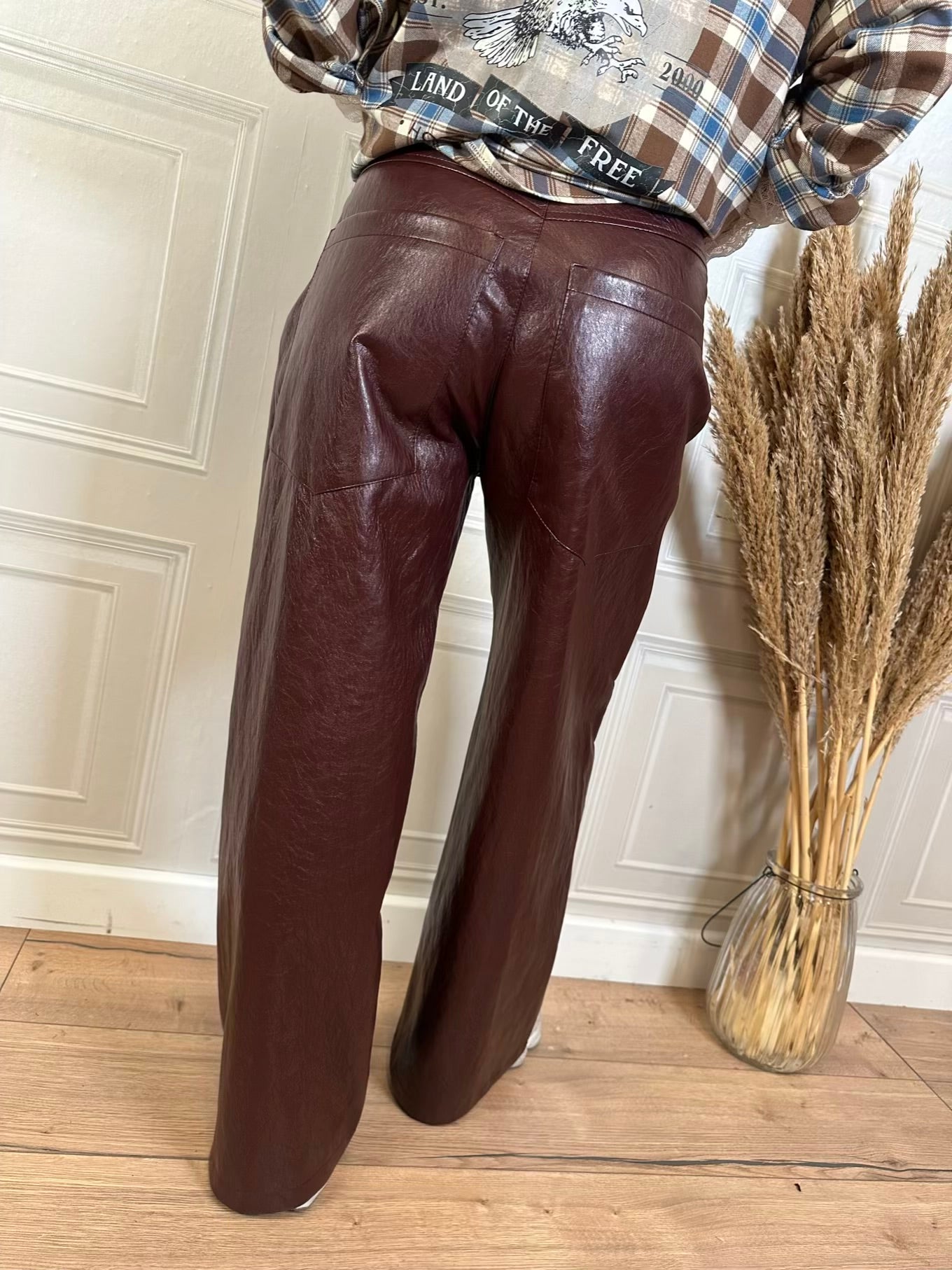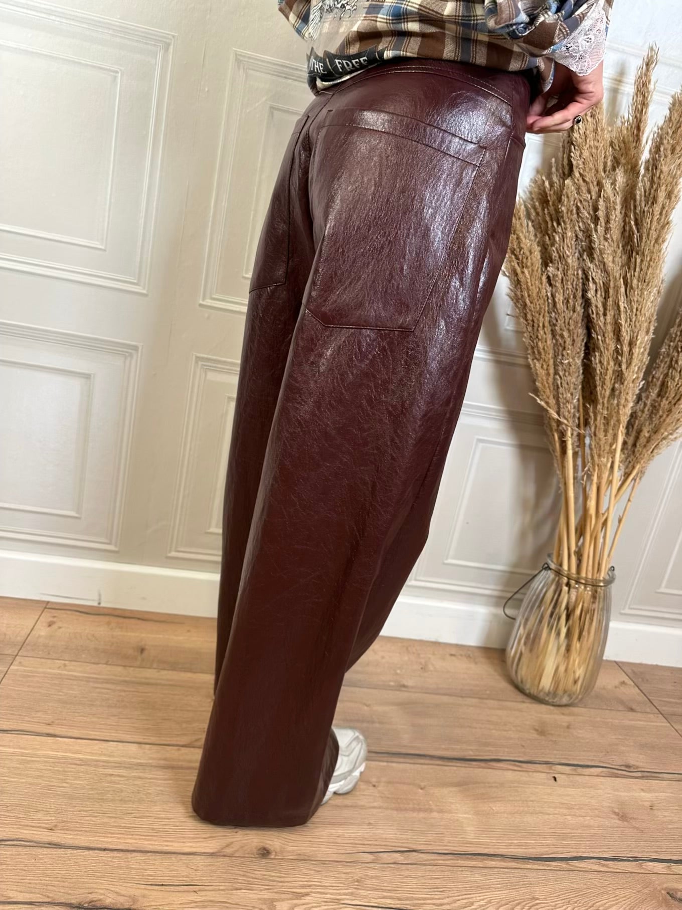 Pantalone largo in ecopelle effetto invecchiato. Modello gamba palazzo, quattro tasche, chiusura con zip e bottoncino.
