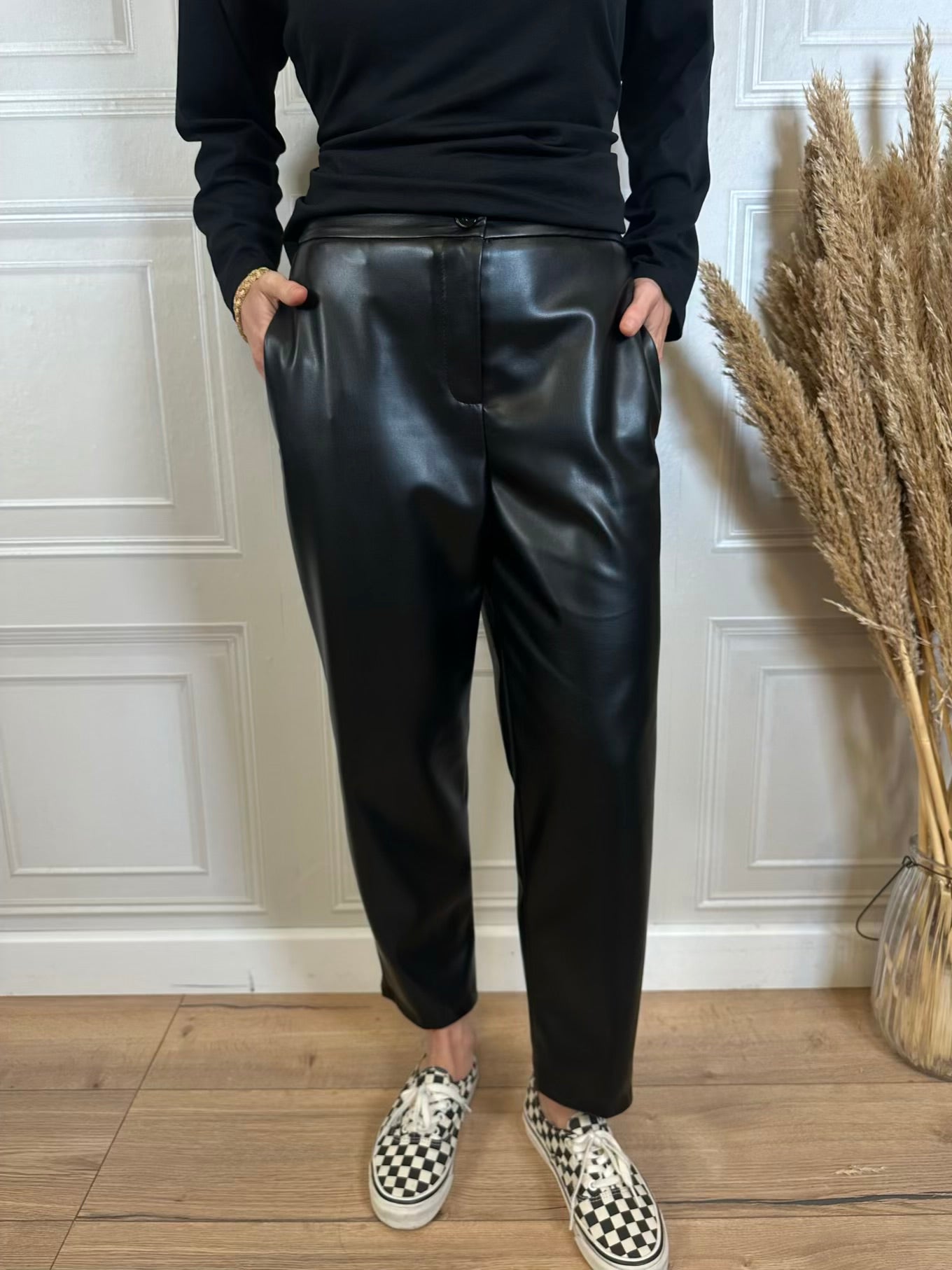 Pantalone ecopelle. Modello a palazzo con chiusura a bottone, zip e due tasche laterali.