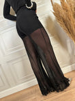 Pantalone color nero Haveone. Modello velato con lurex, fondo flare con arriccio. Elastico in vita