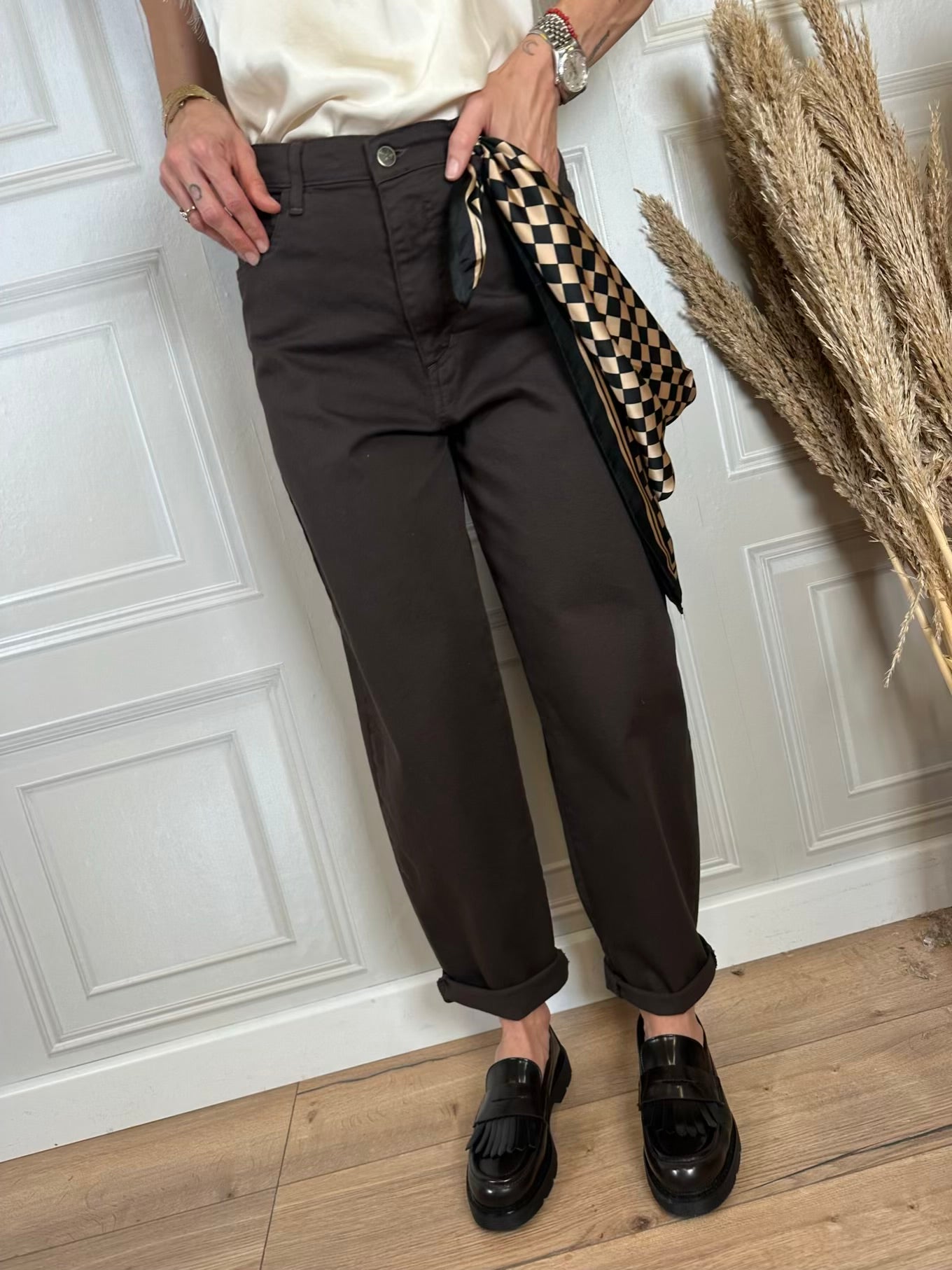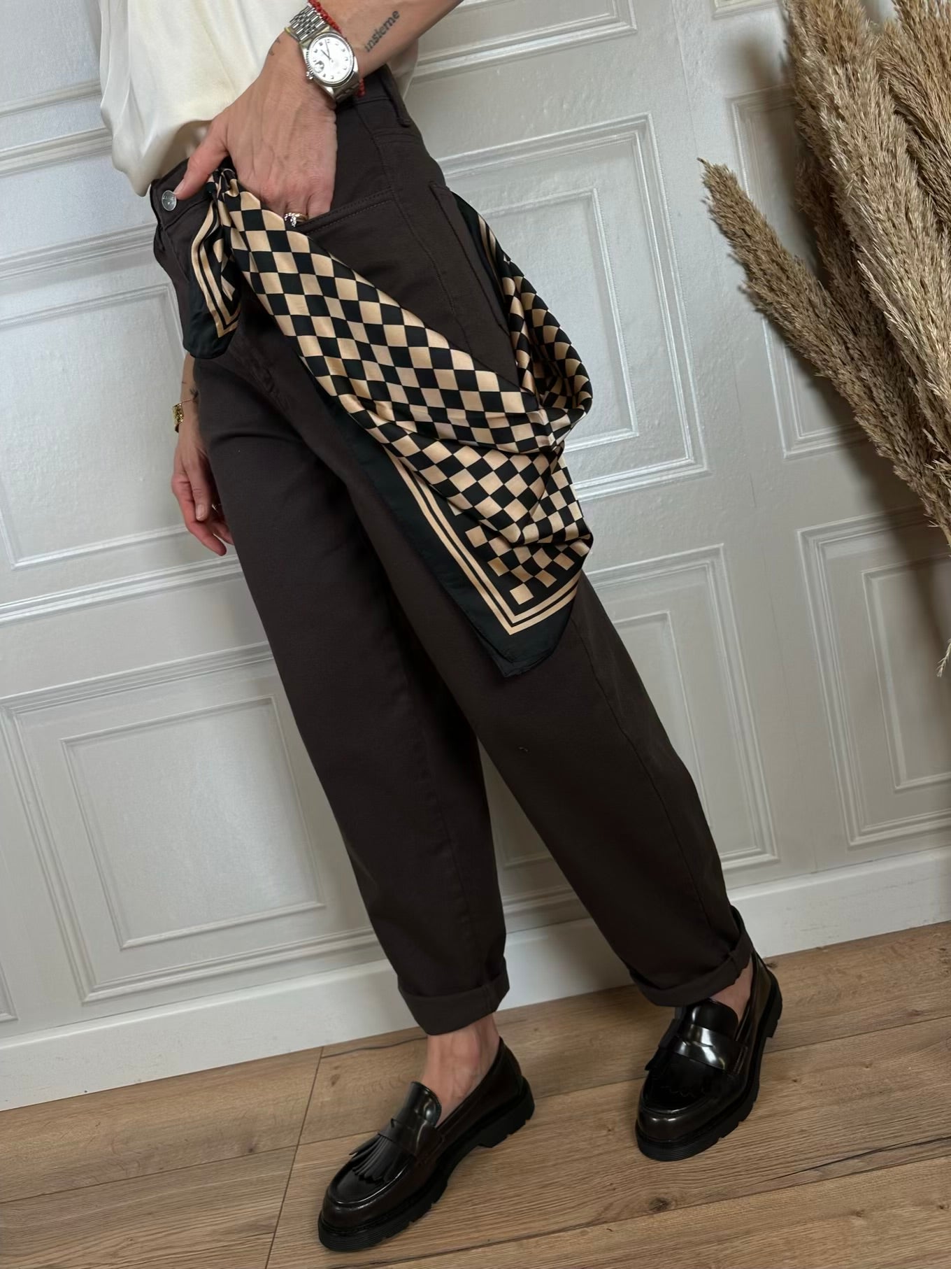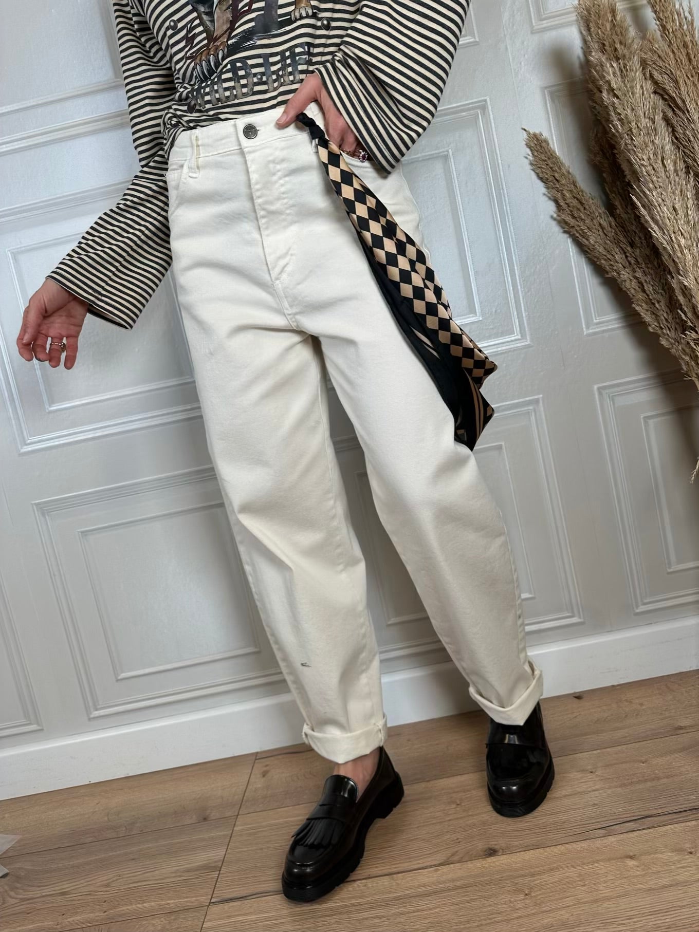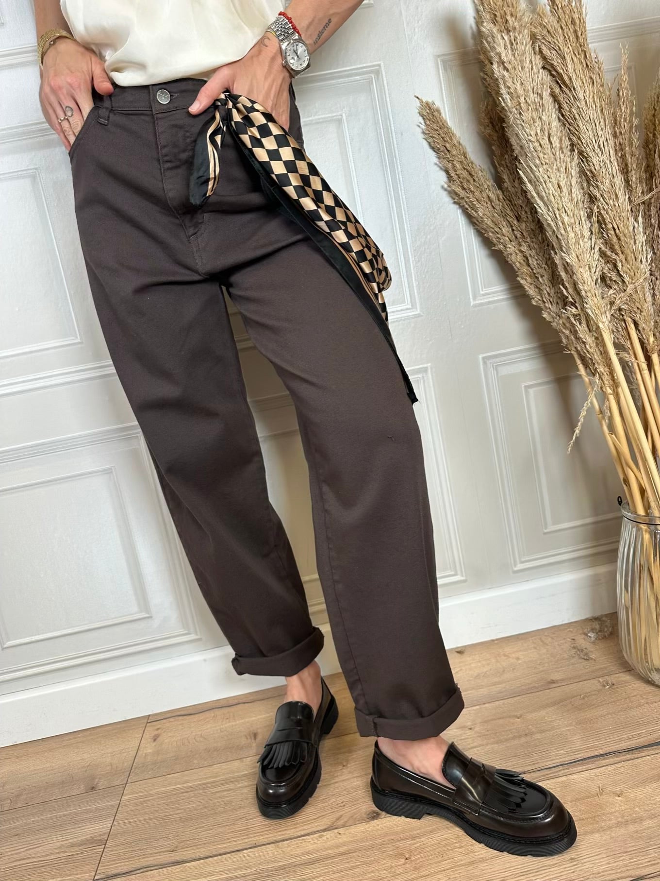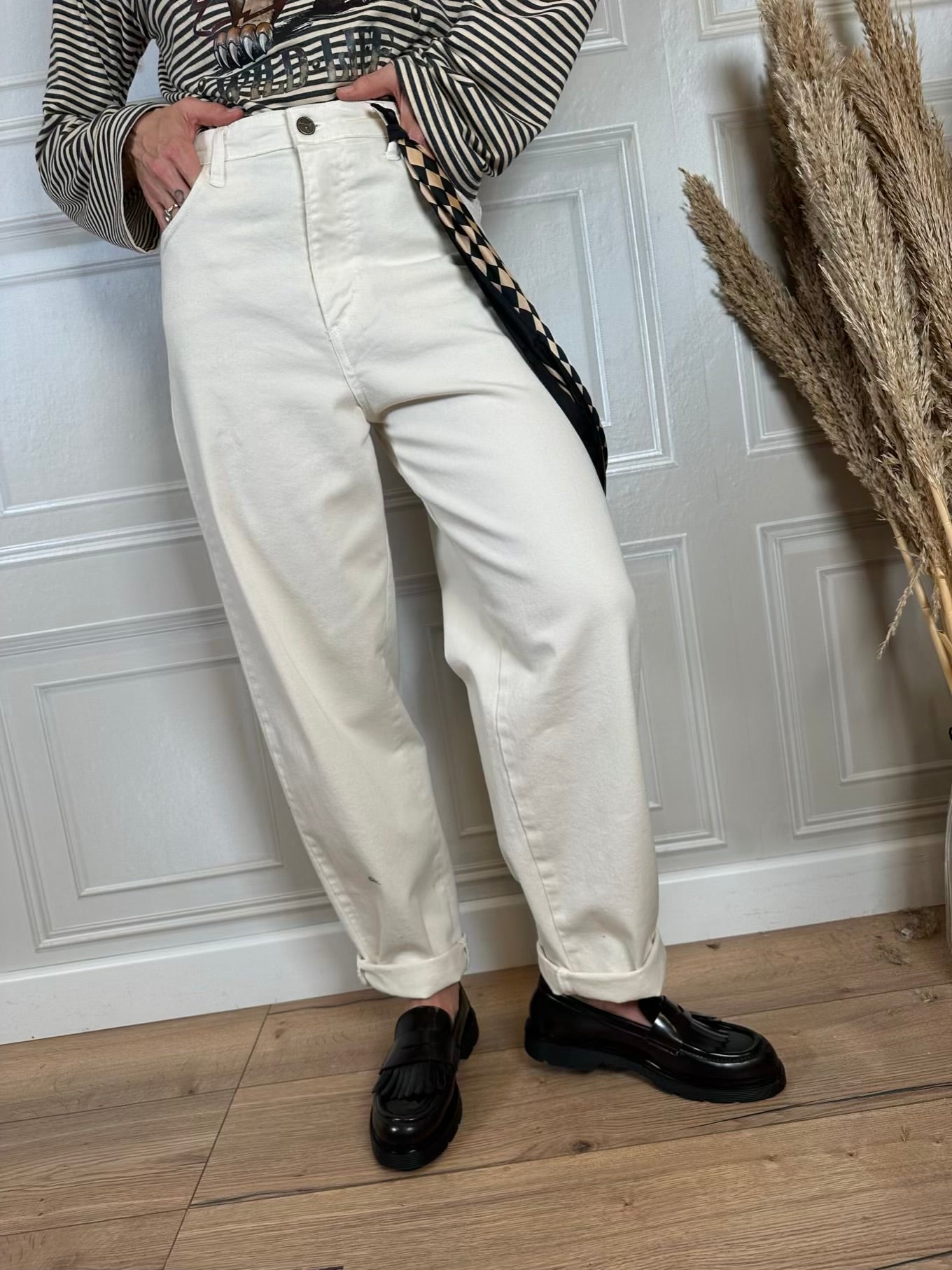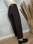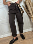 Pantalone in cotone tinto capo, modello carrot gamba ampia e vita medio alta.