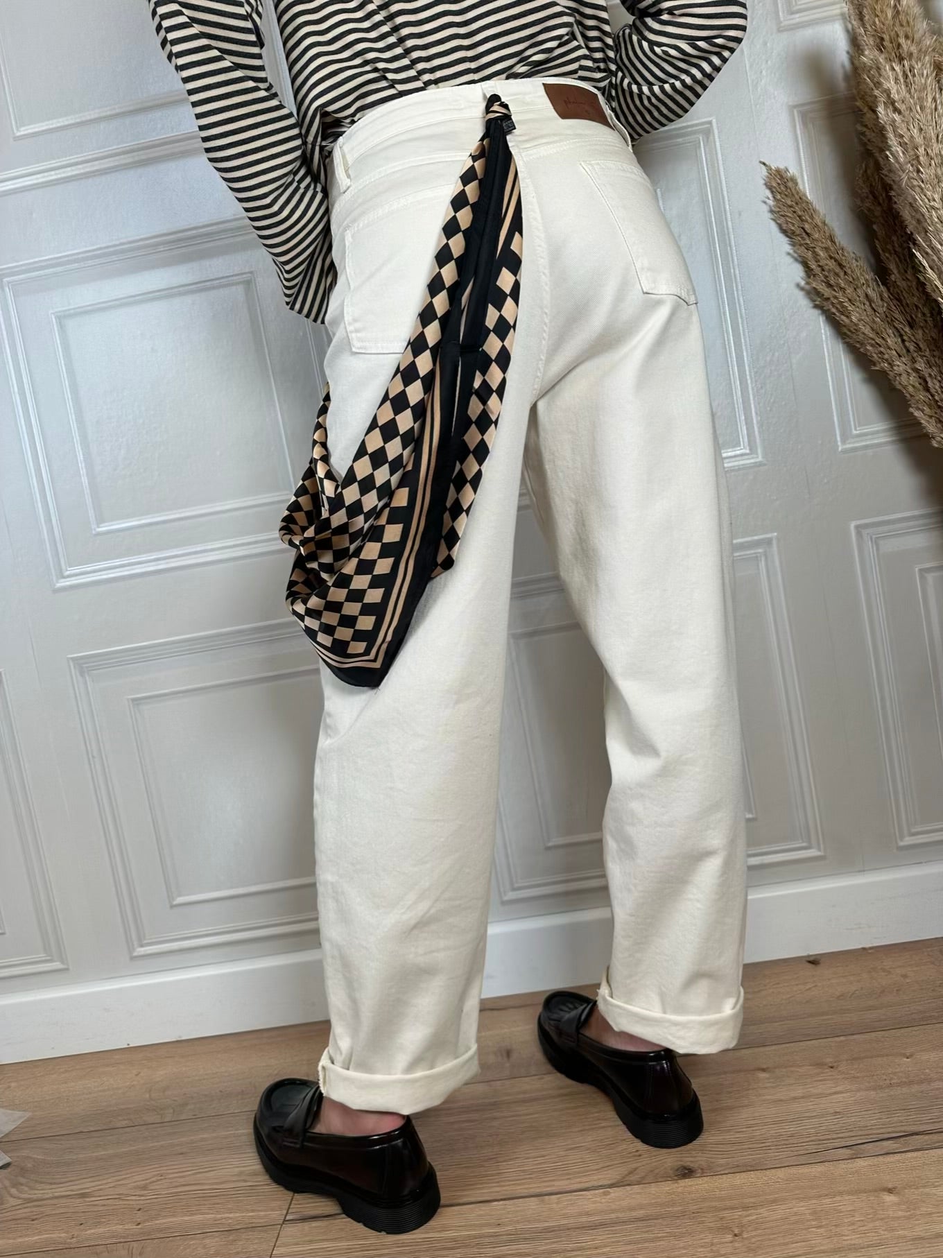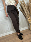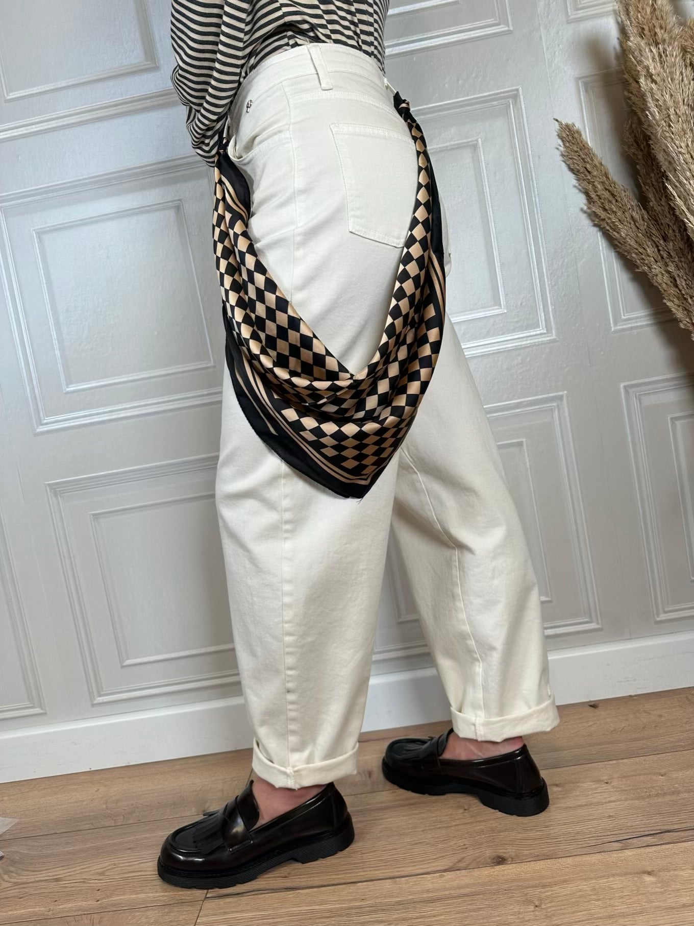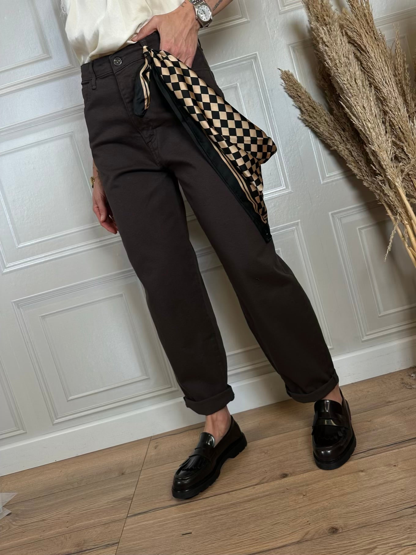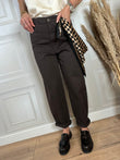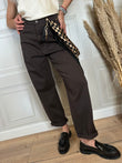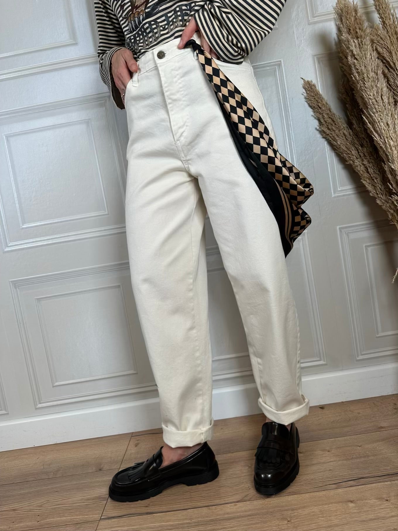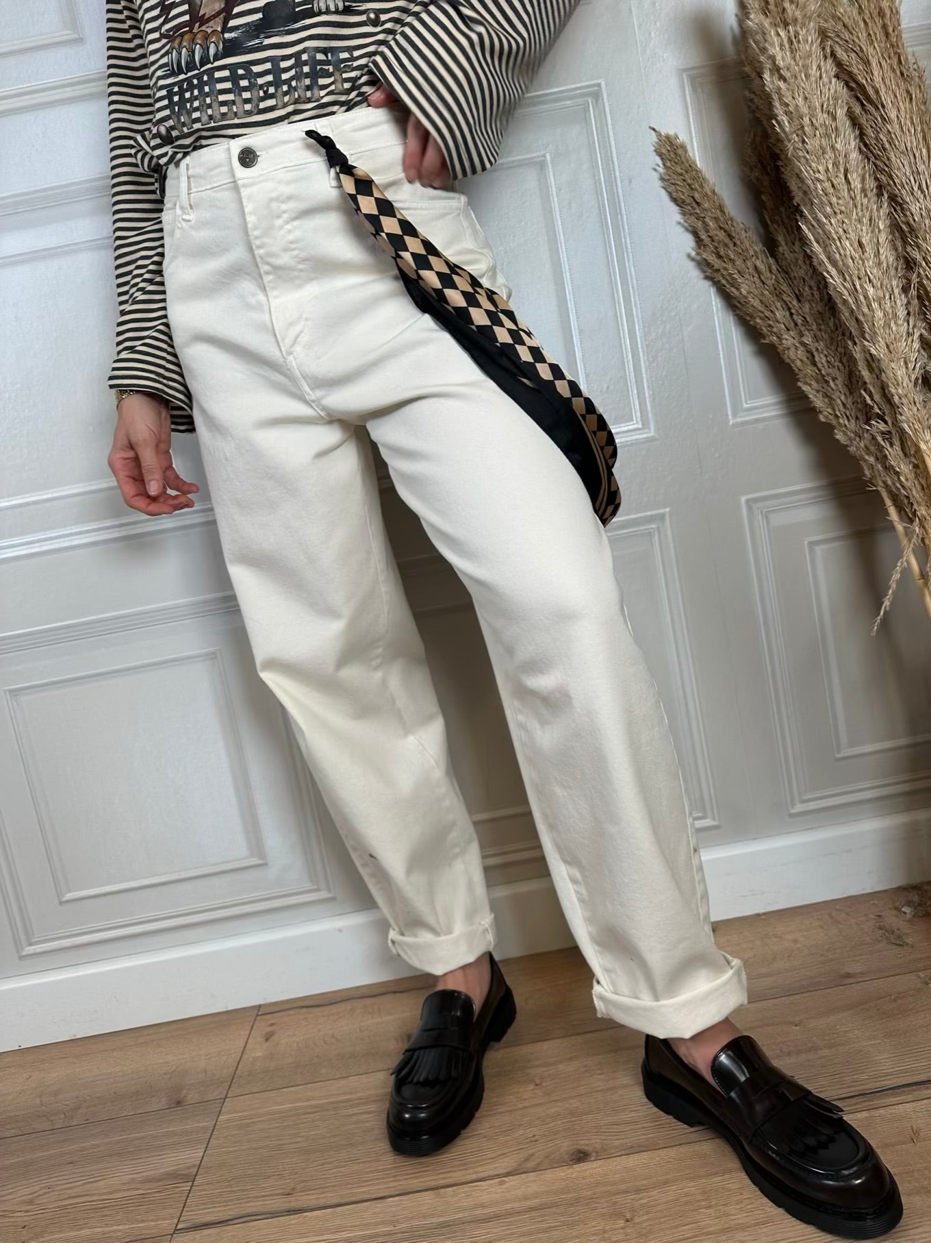 Pantalone in cotone tinto capo, modello carrot gamba ampia e vita medio alta.