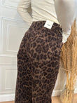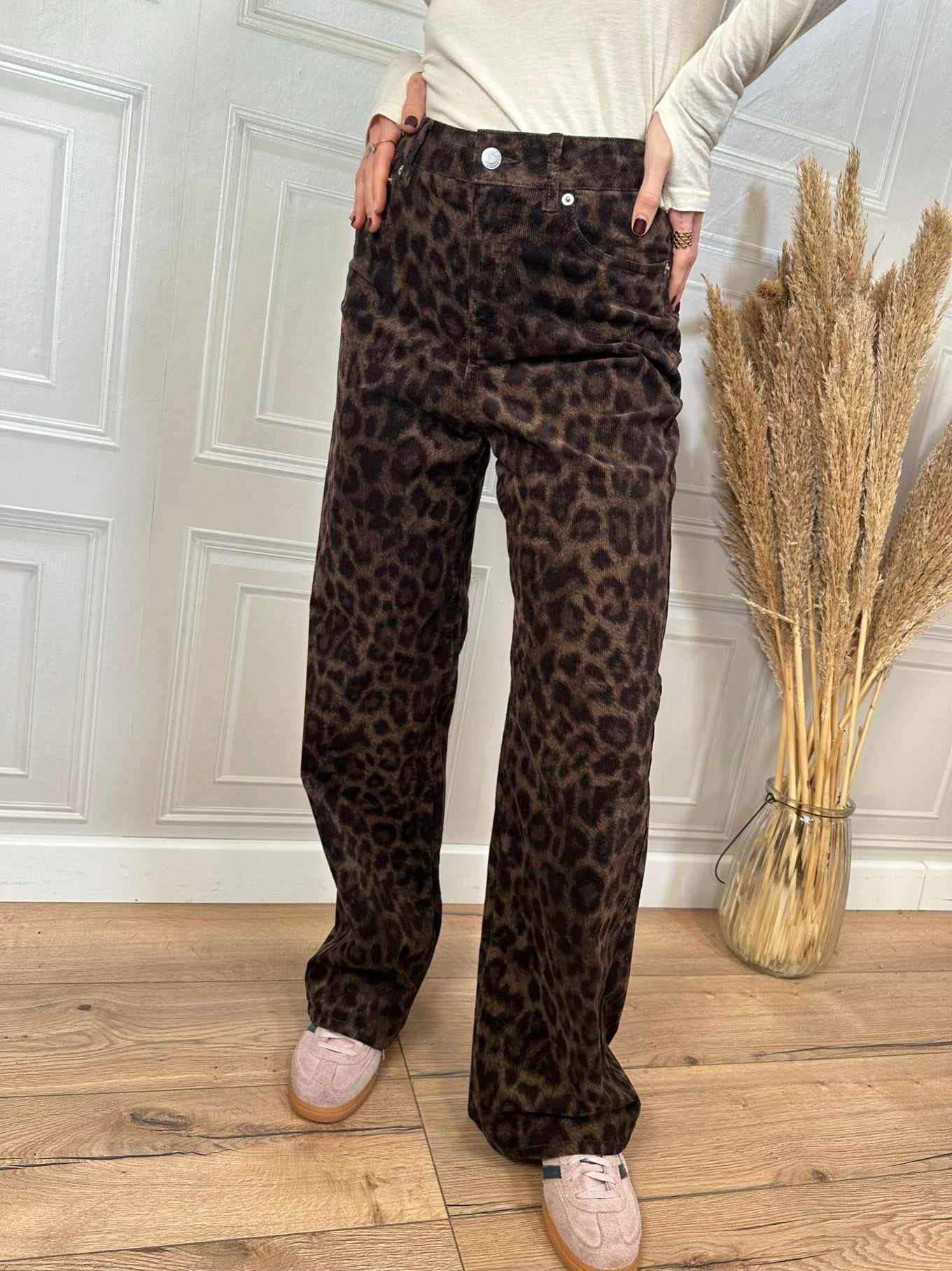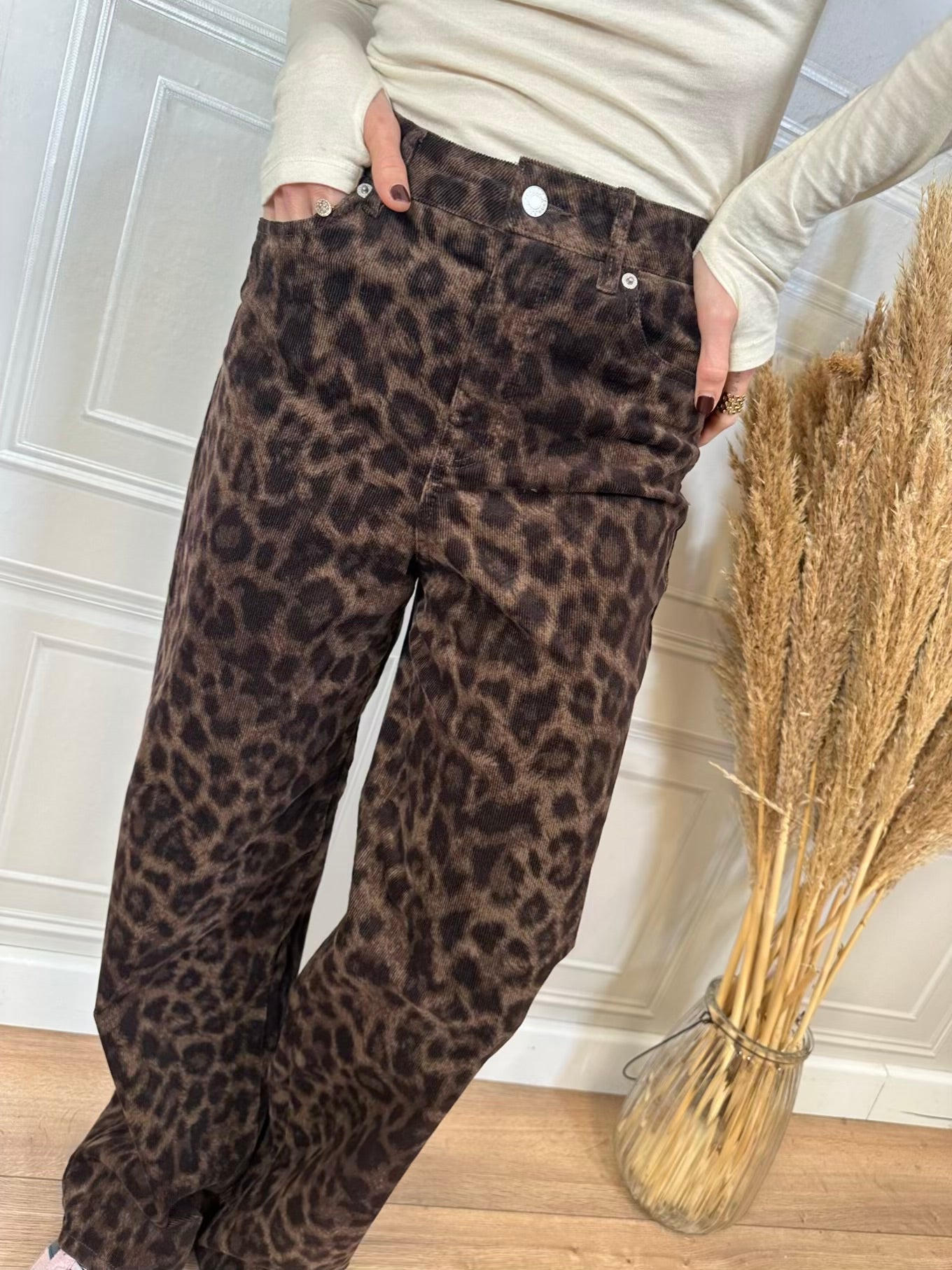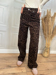 Pantalone velluto a costine fantasia leopardata sui toni del moro e nero.