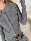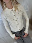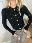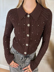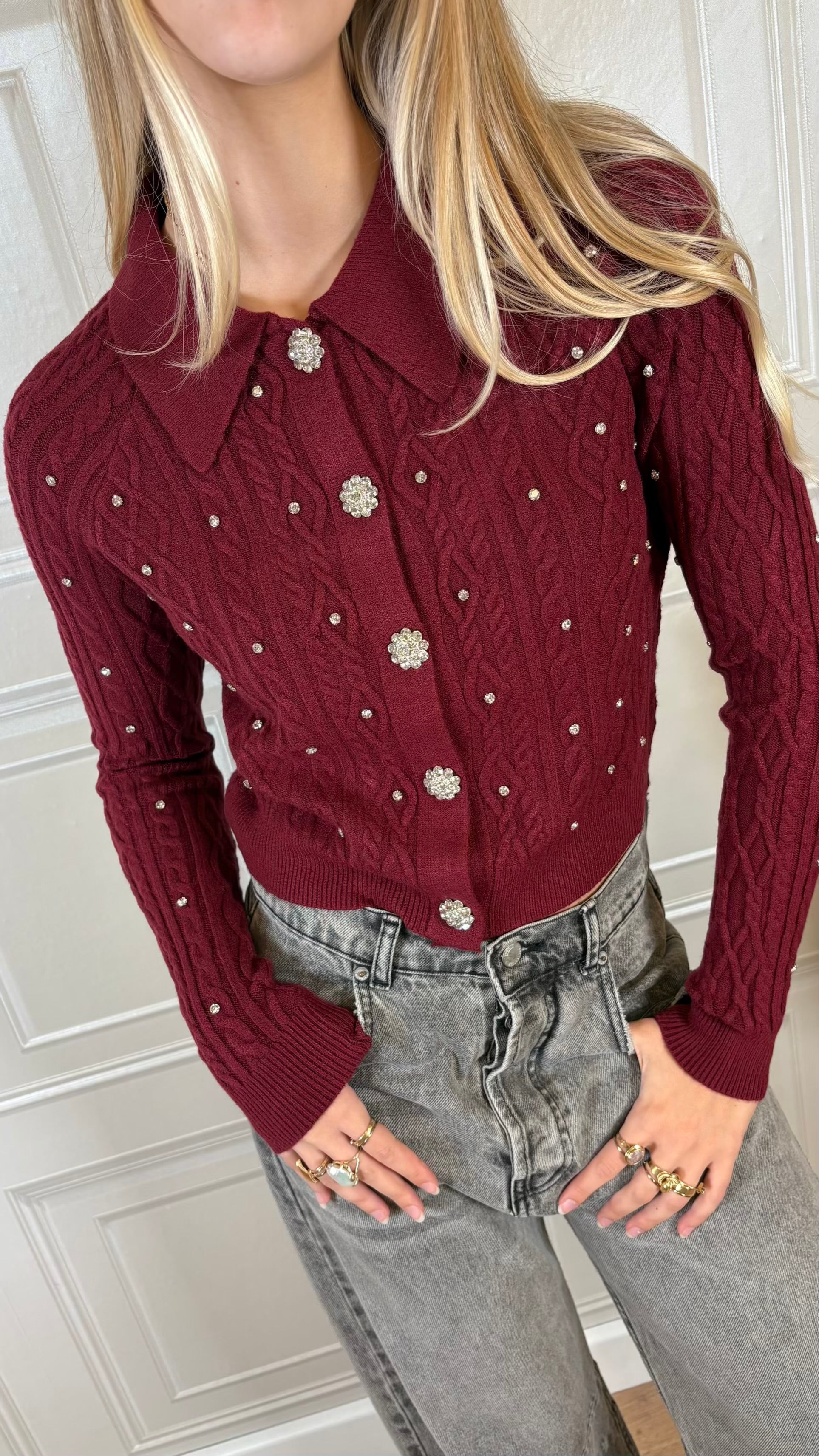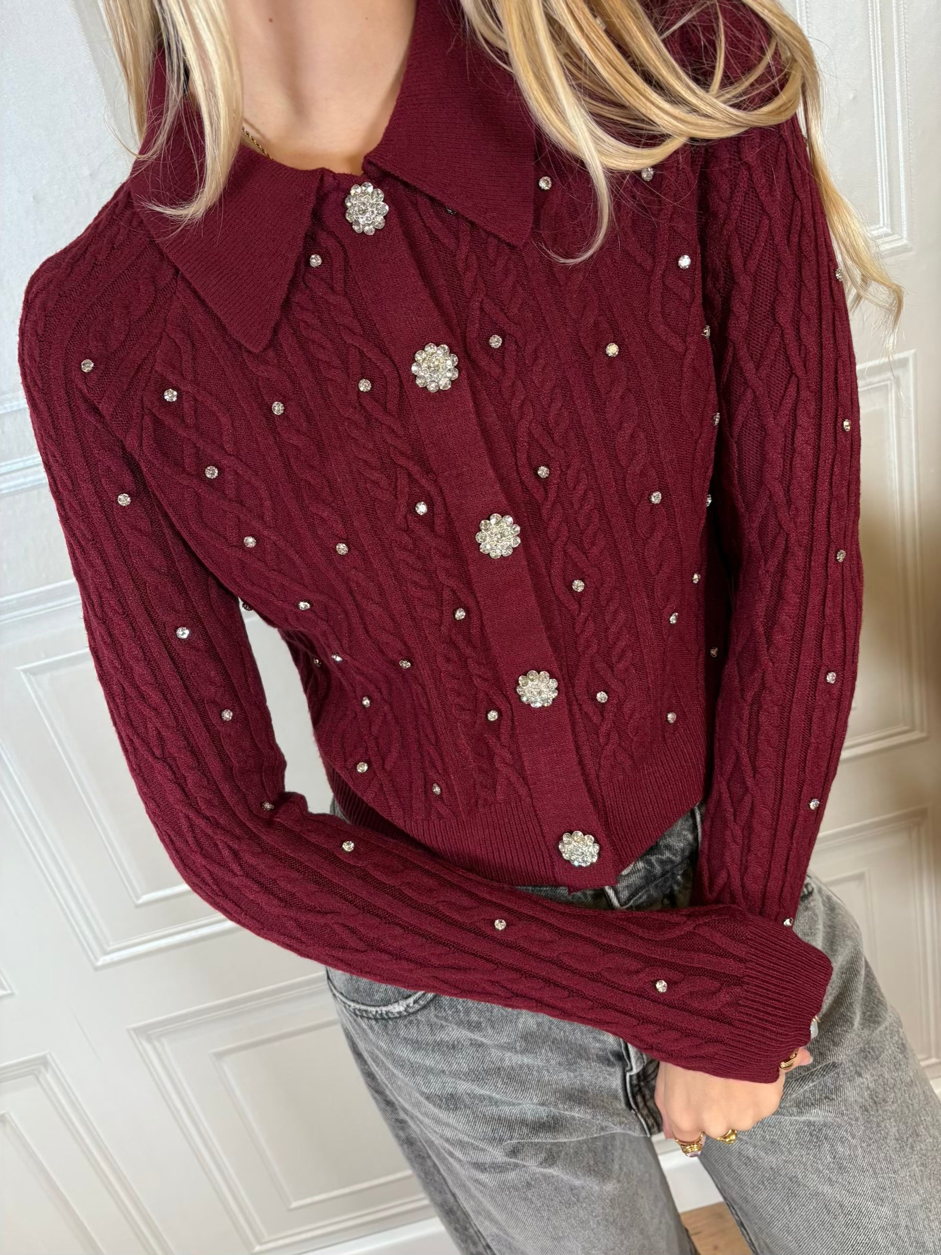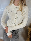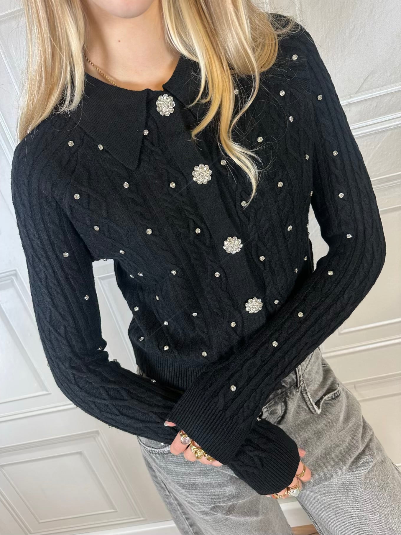 Polo in maglia con trama treccine e applicazione di strass su fronte e maniche. Bottoni gioiello apribili. Taglia unica, vestibilità regolare.