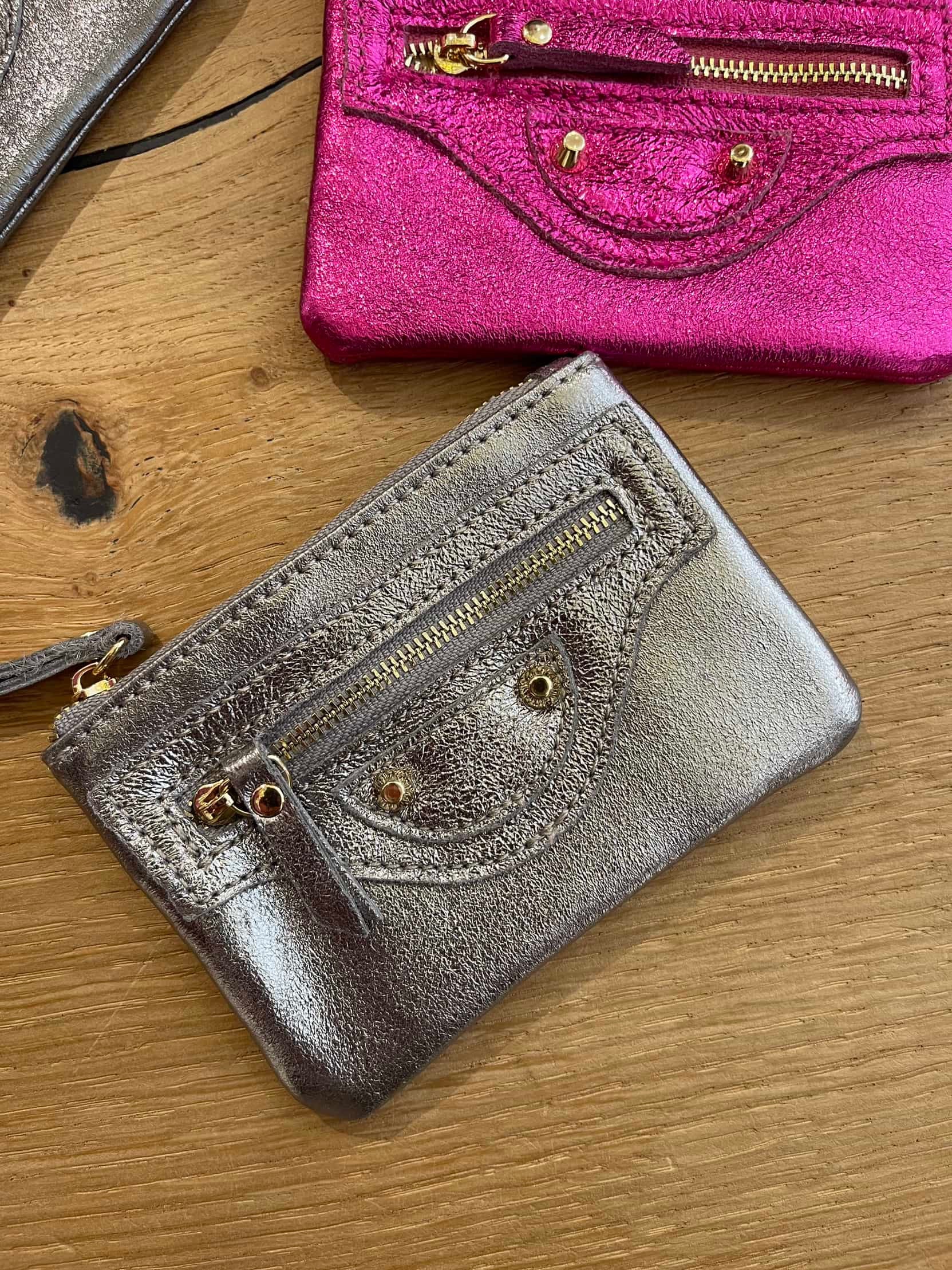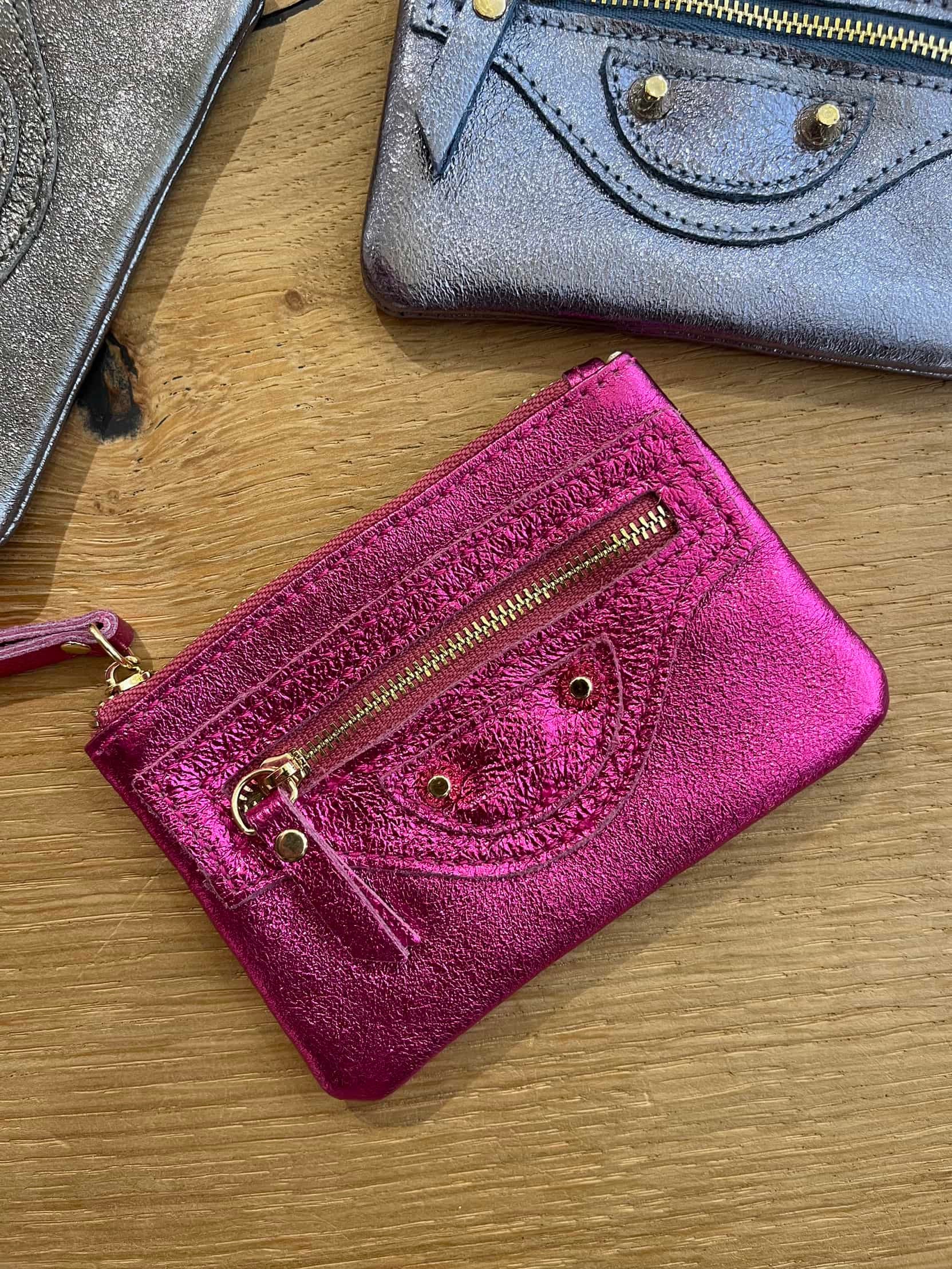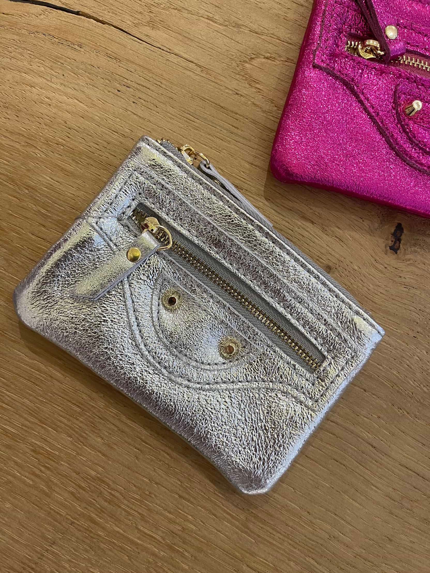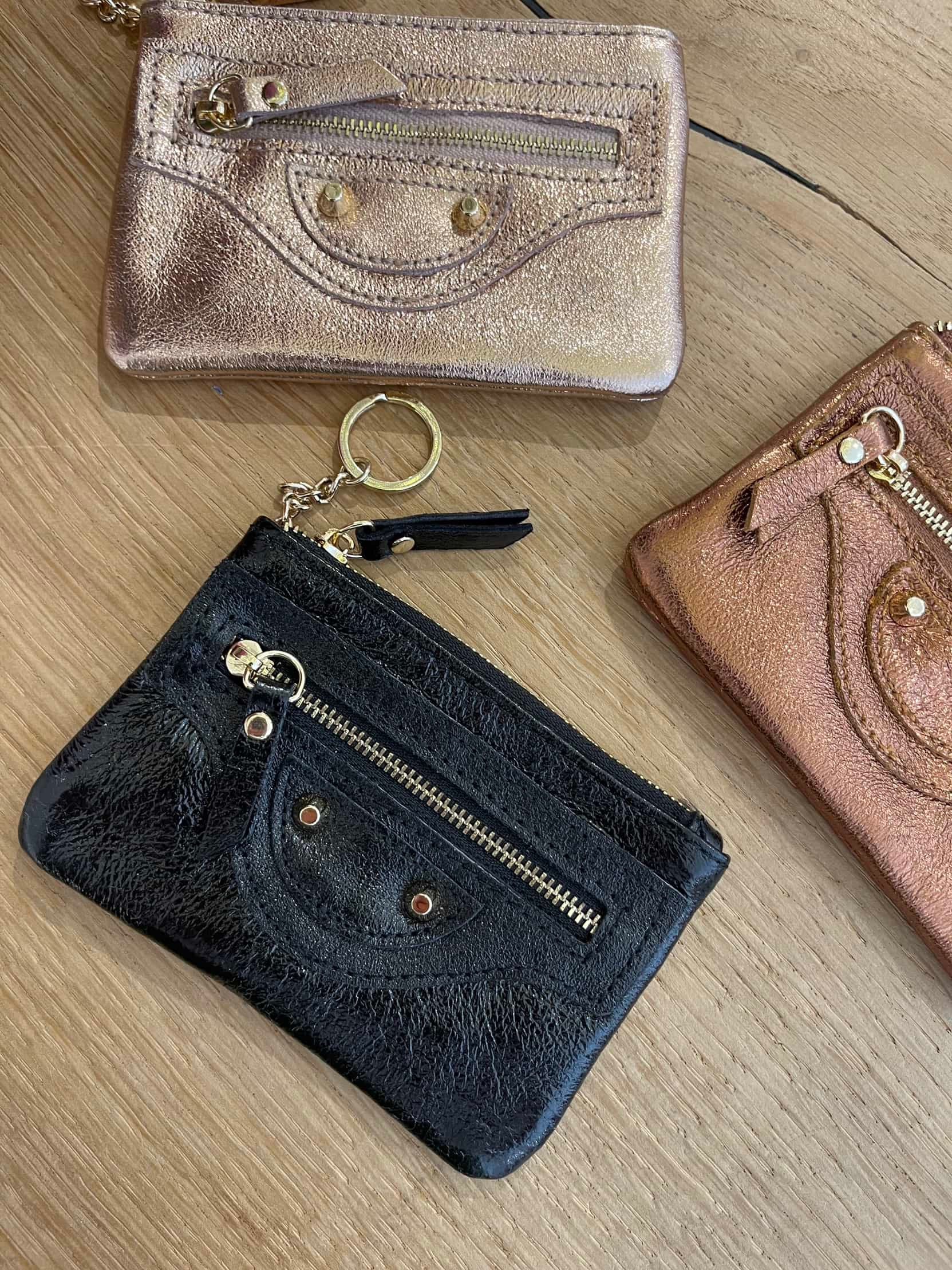 Portafoglio a bustina con cerniera in chiusura, portachiavi interno e tasca frontale.