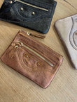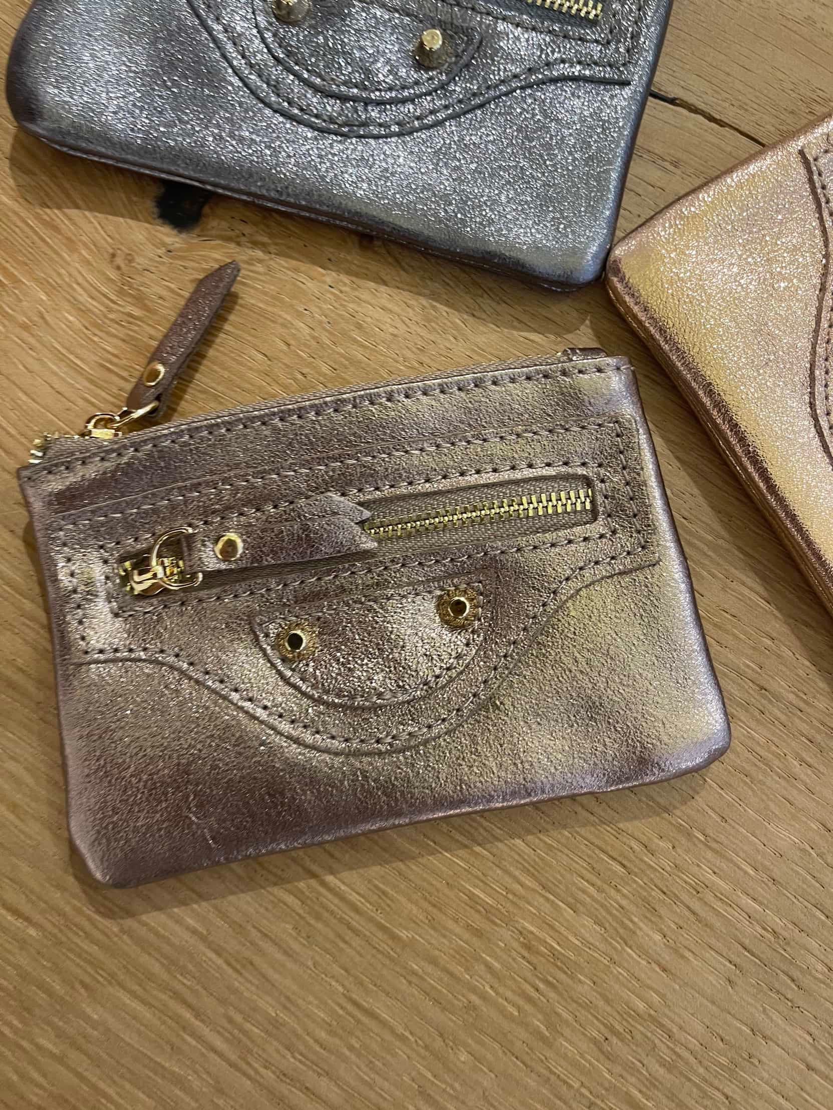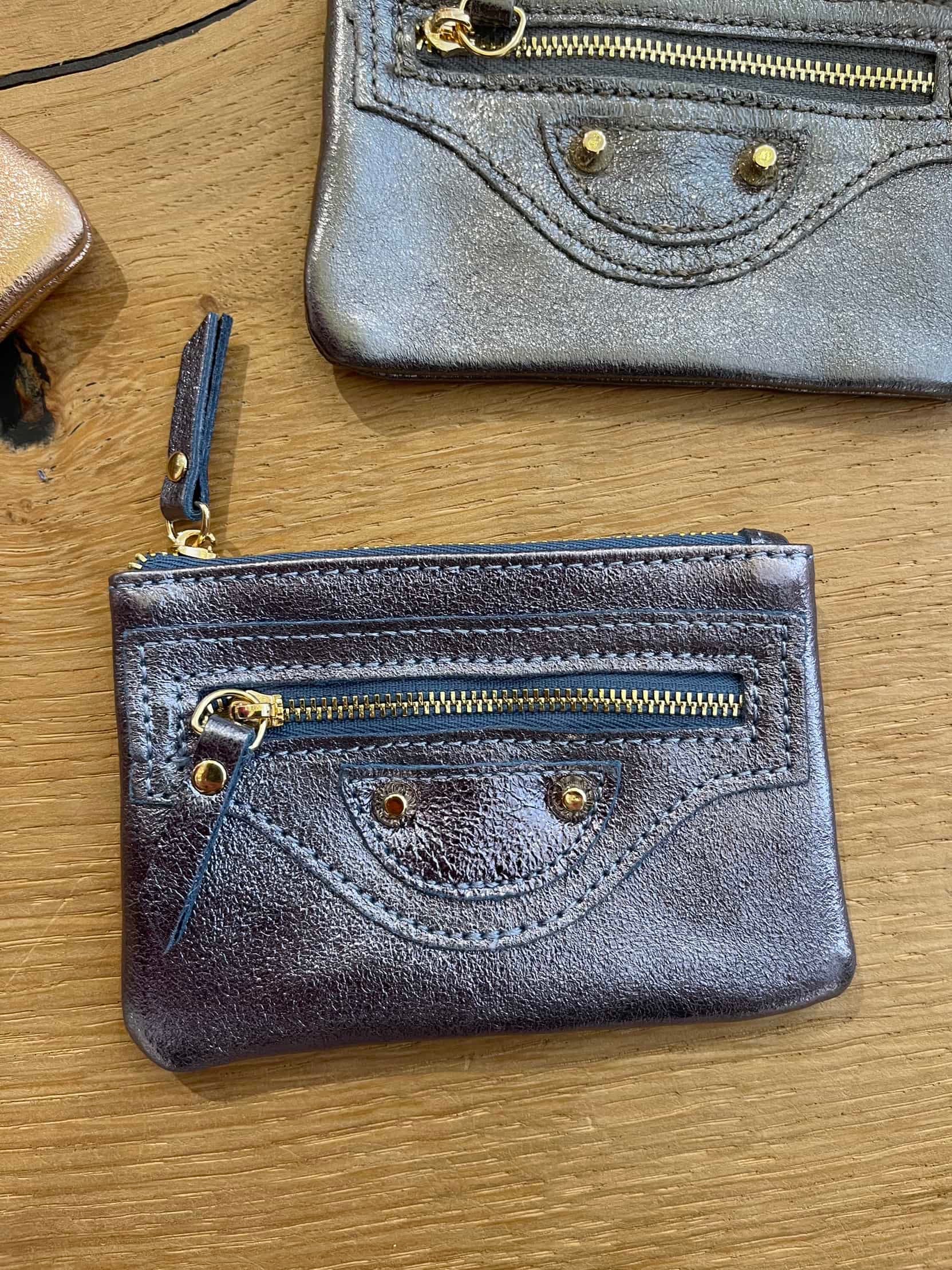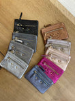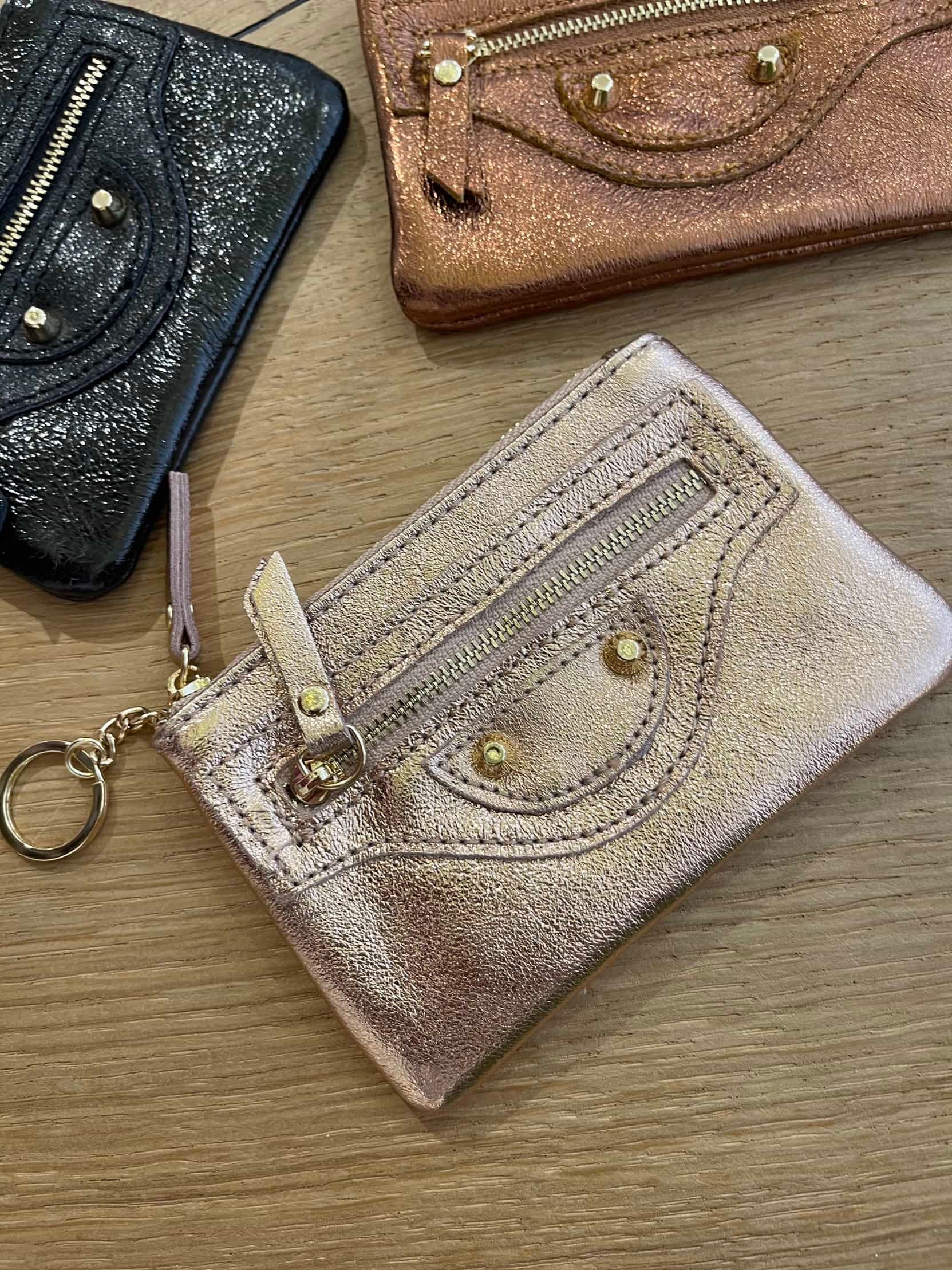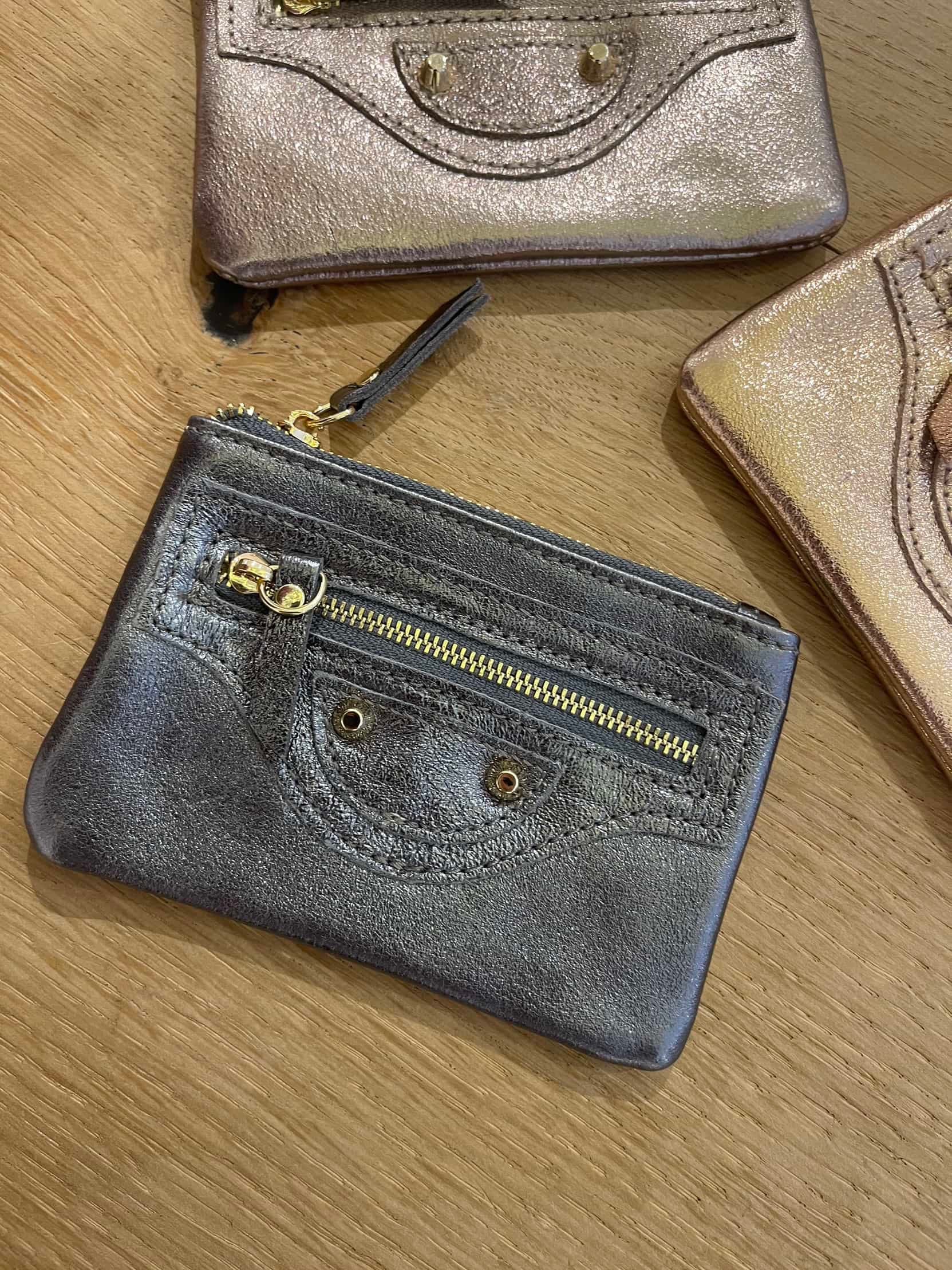 Portafoglio a bustina con cerniera in chiusura, portachiavi interno e tasca frontale.