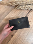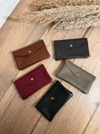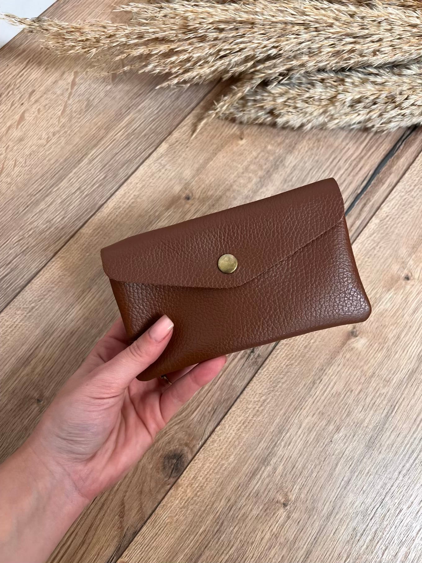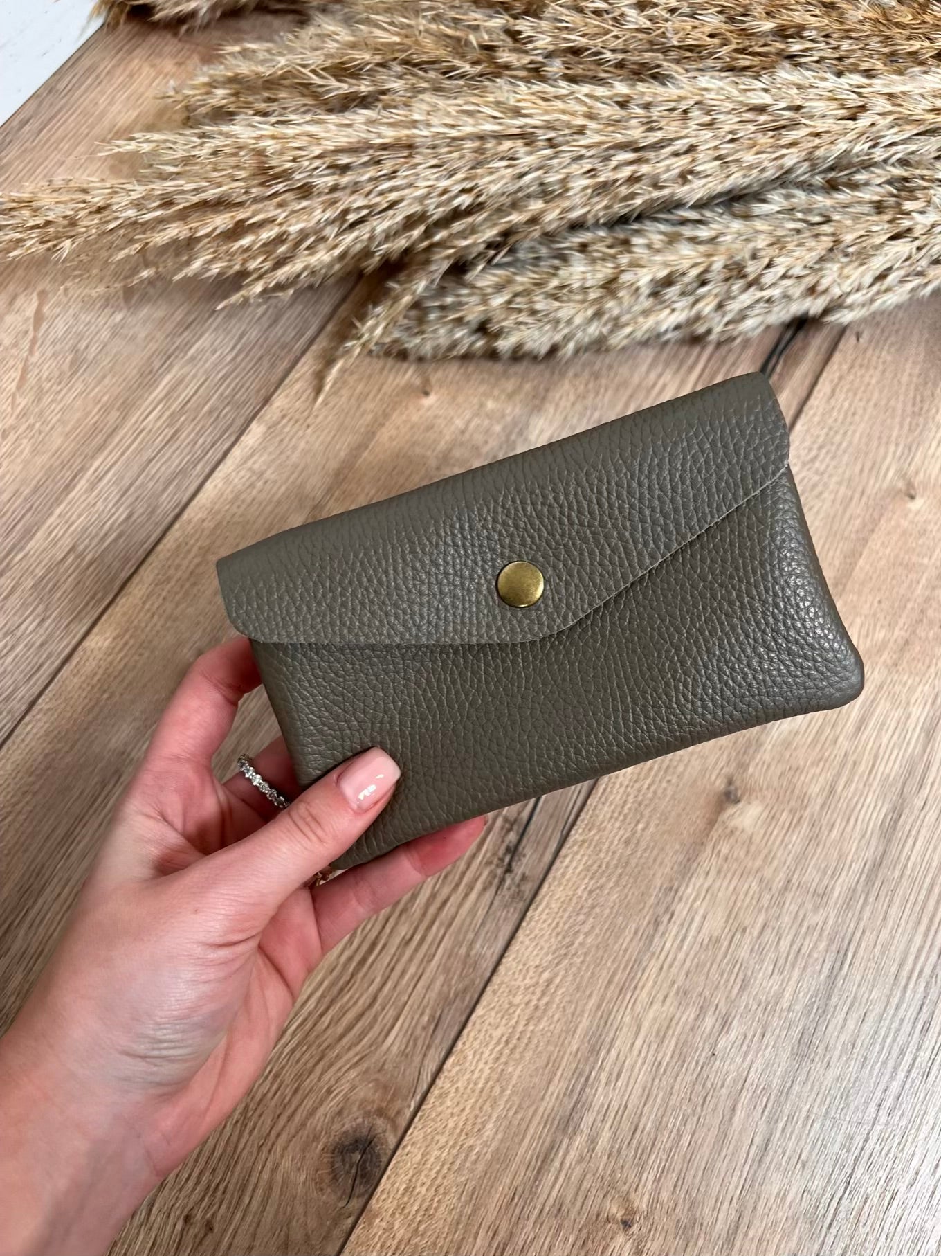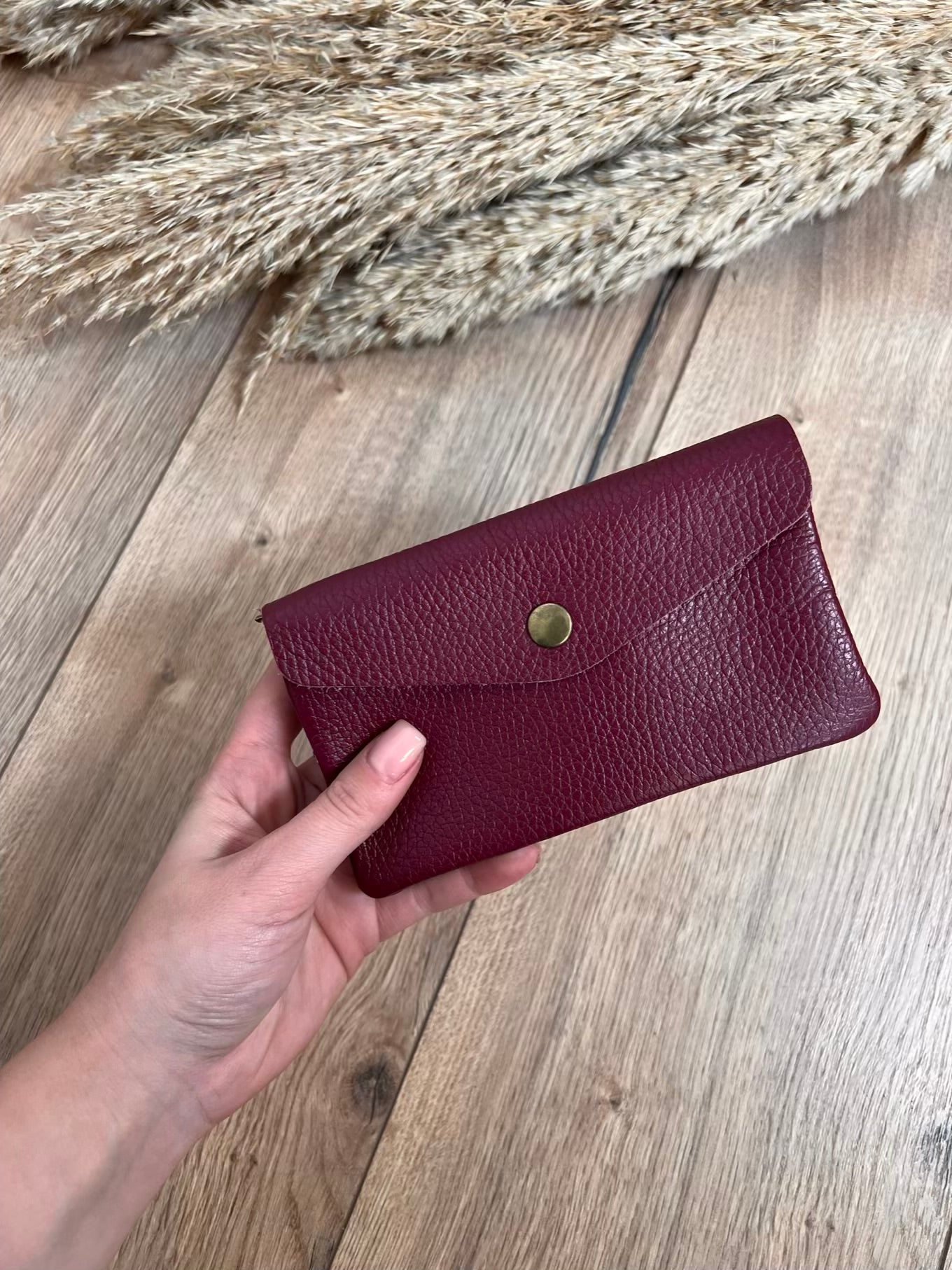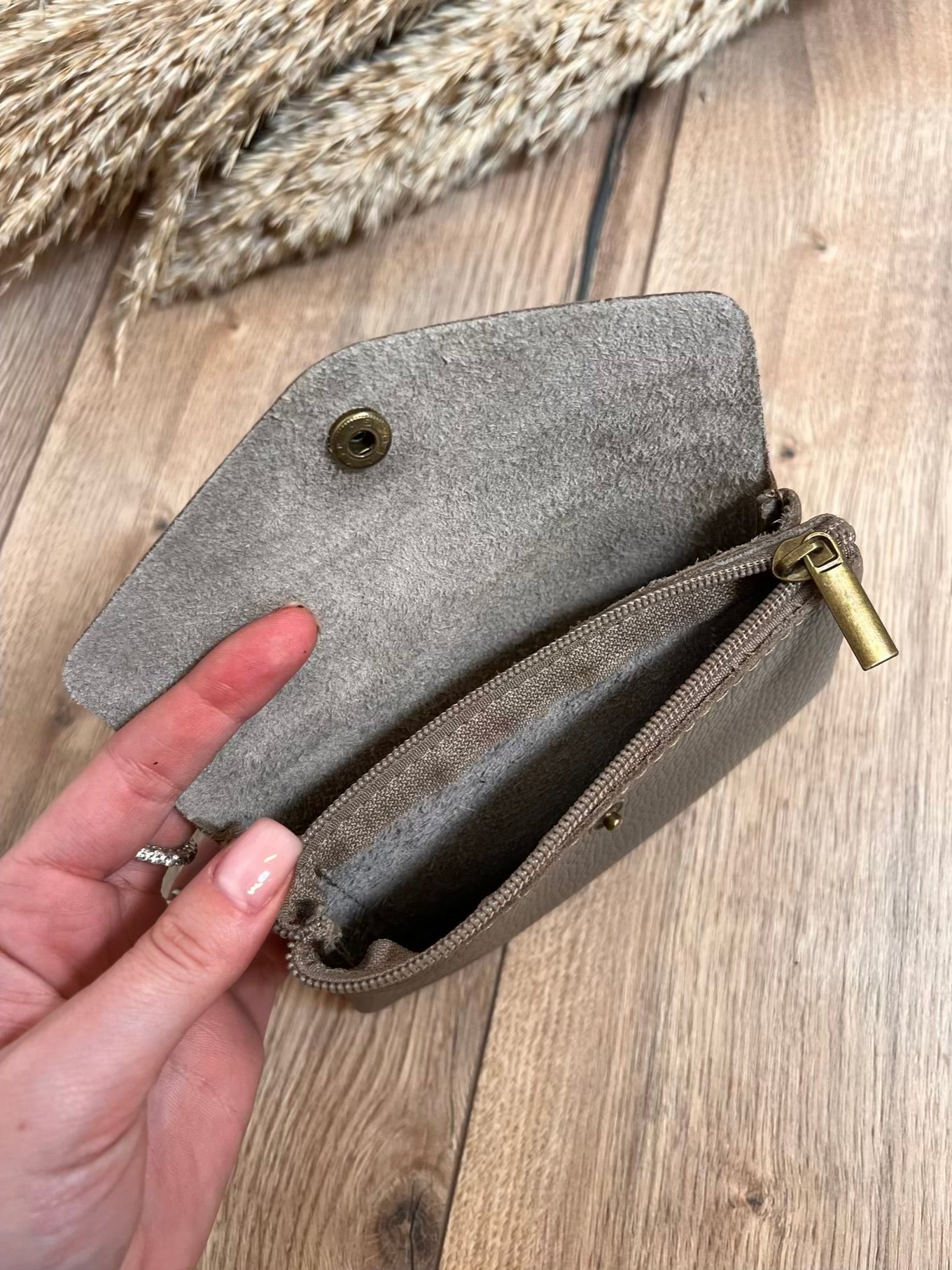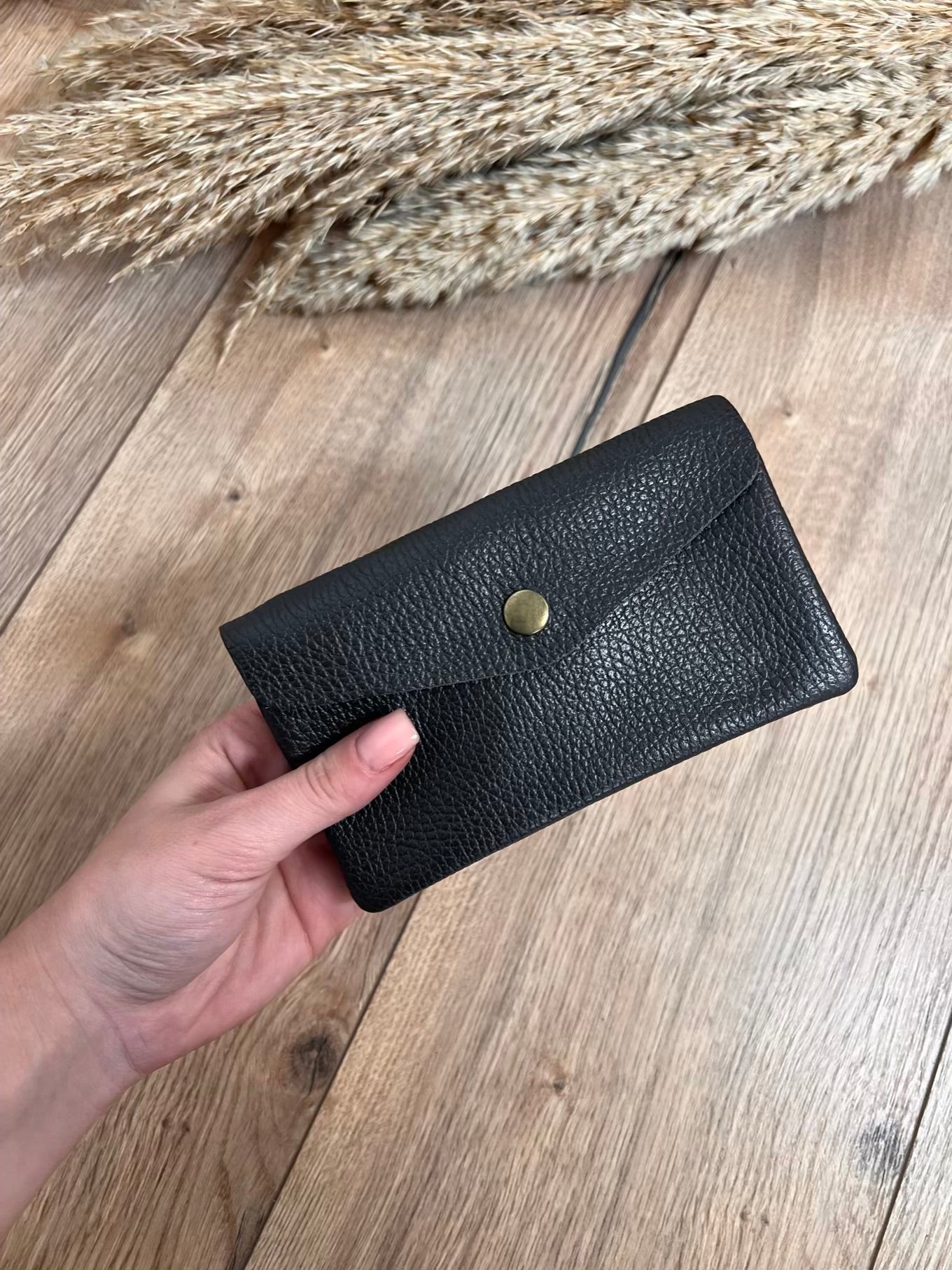 Portafoglio a bustina con chiusura a bottoncino automatico e cerniera interna con 2 scompartimenti.