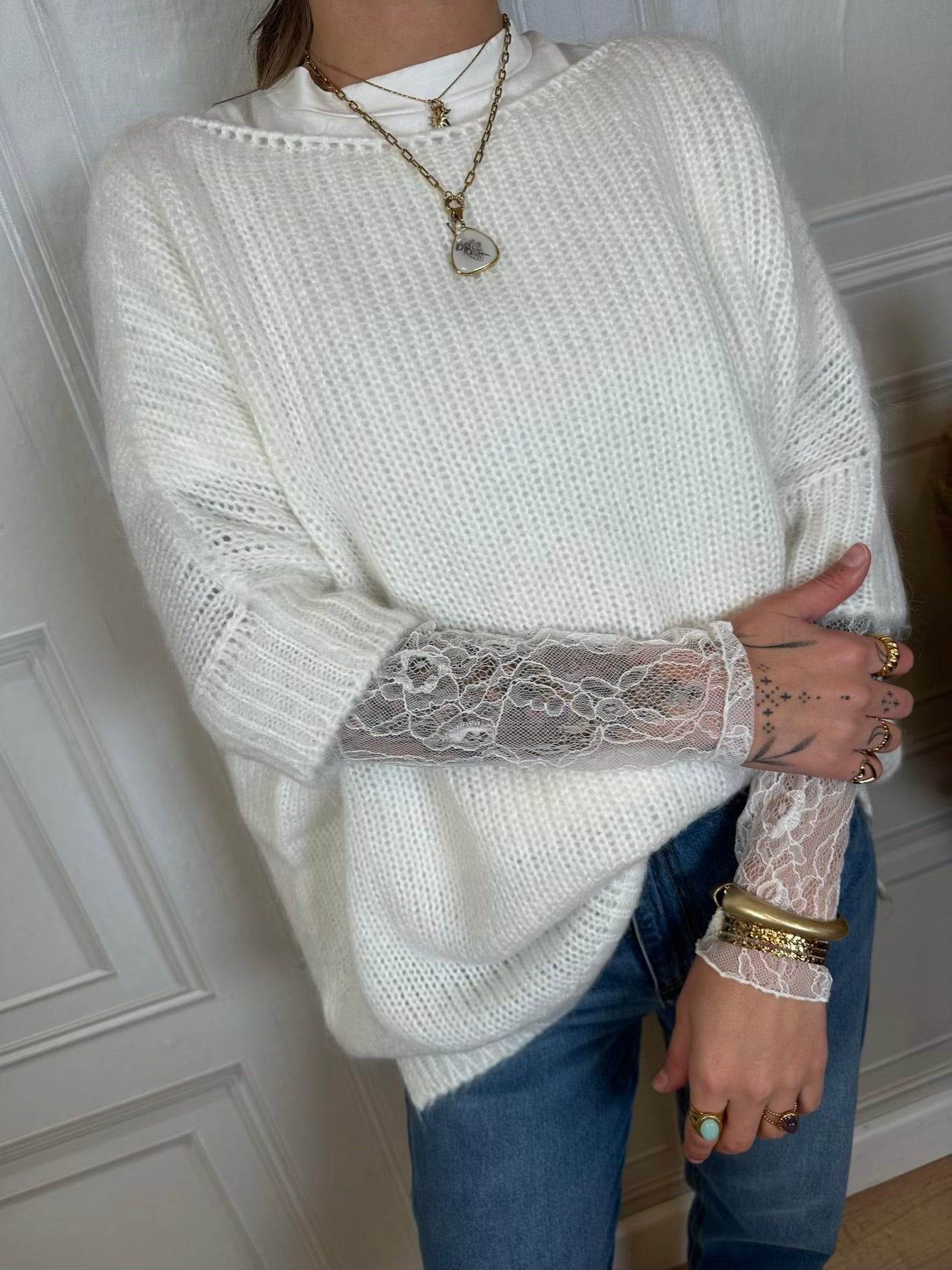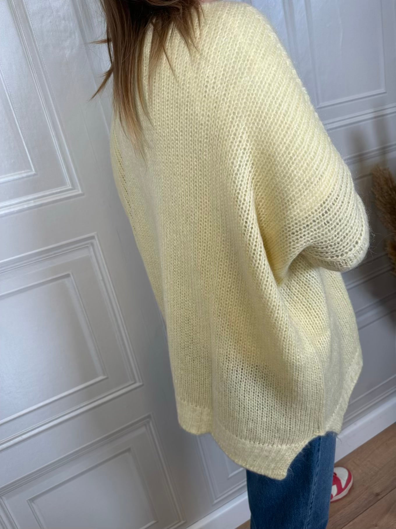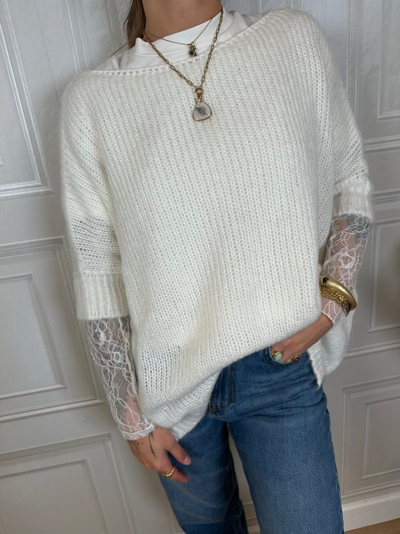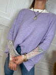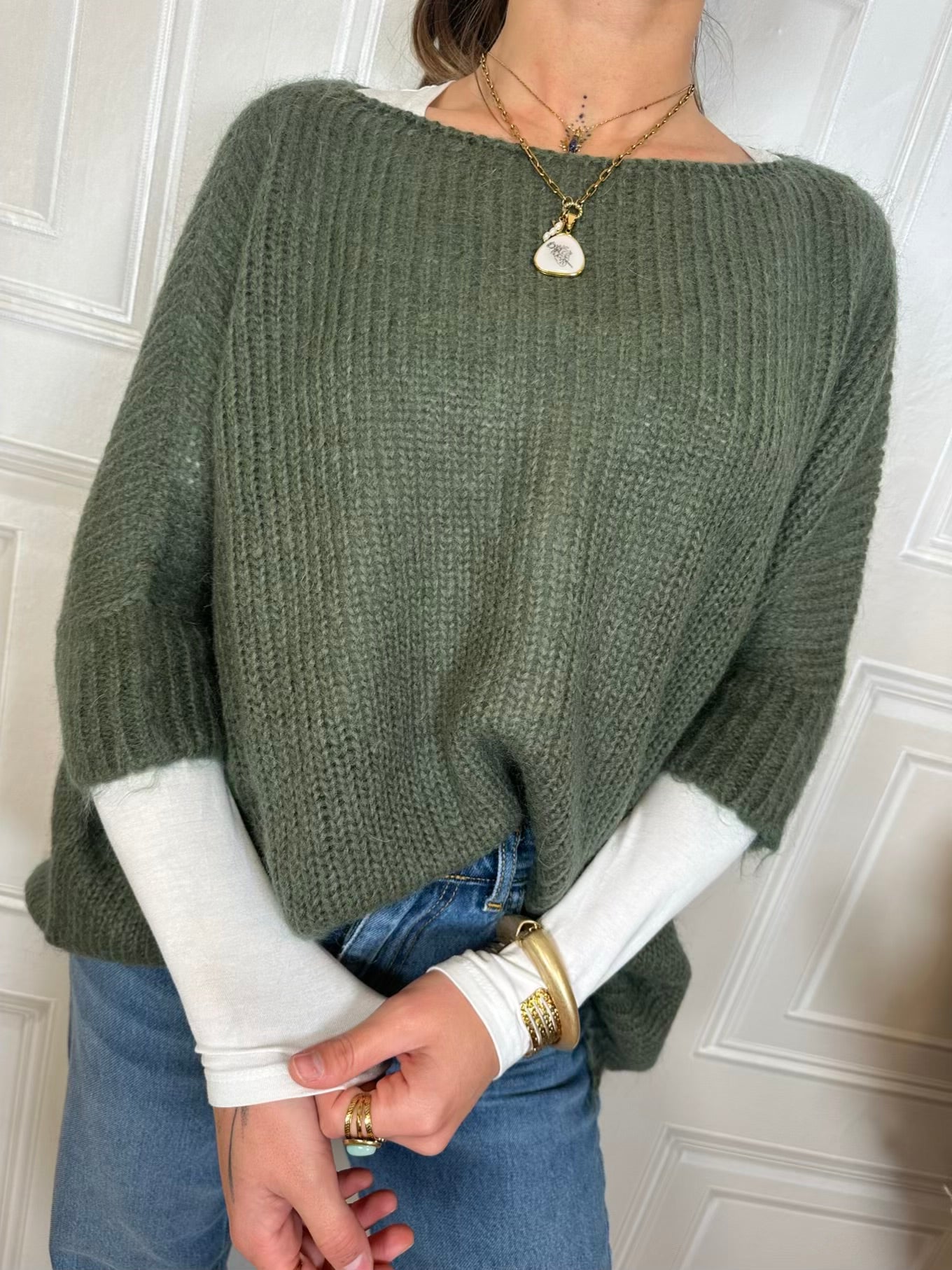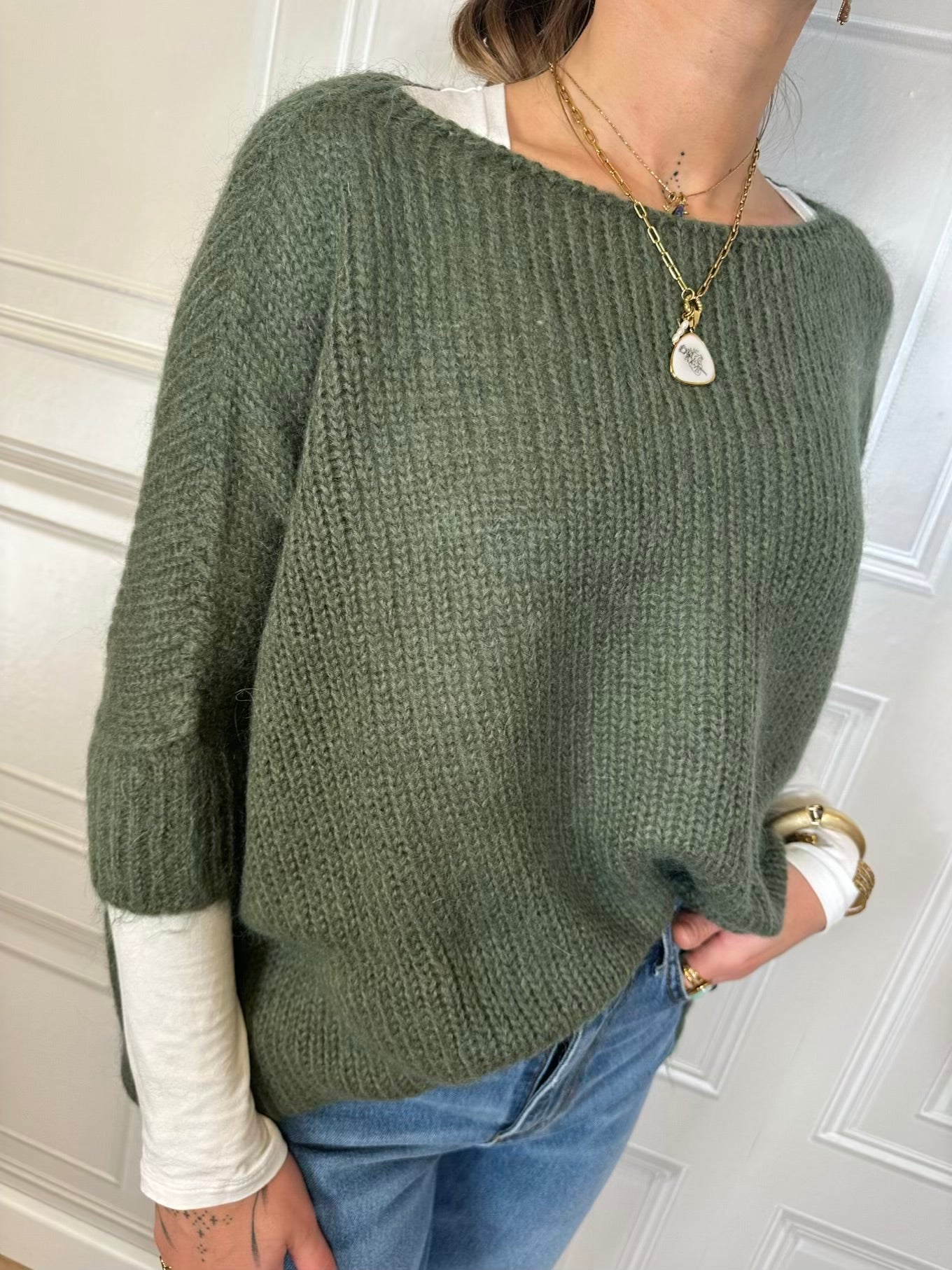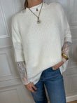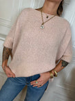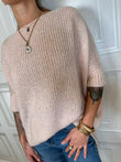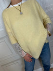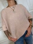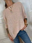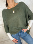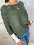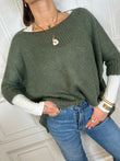 Modello morbido con scollo a barca, spalla scesa con manica 3/4 e polsino a coste. Spacchetti laterali