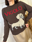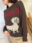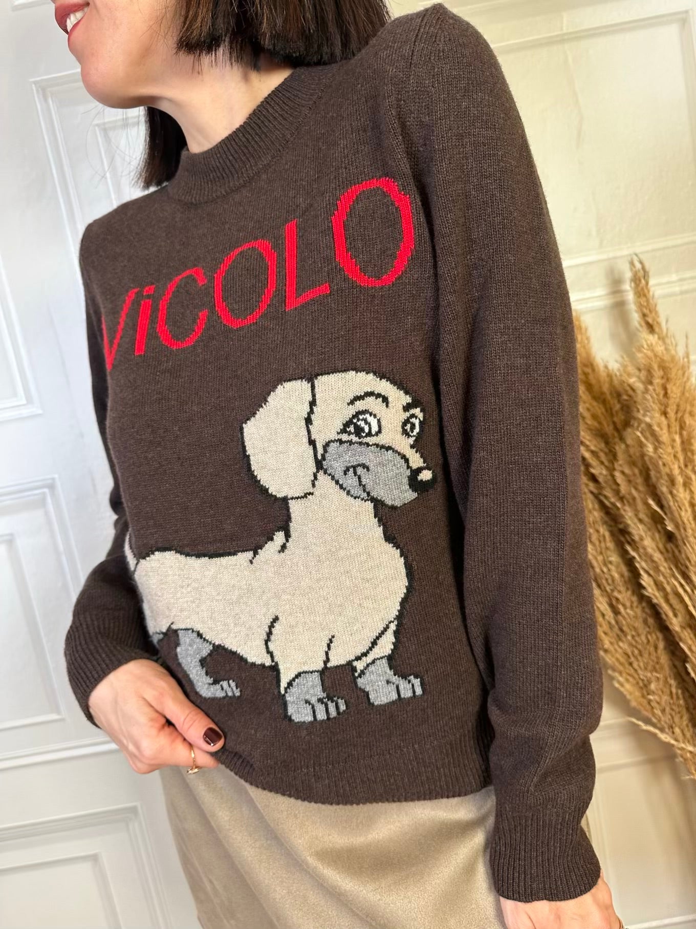 Pull girocollo smacchinato con soggetto bassotto e scritto Vicolo.