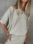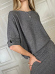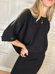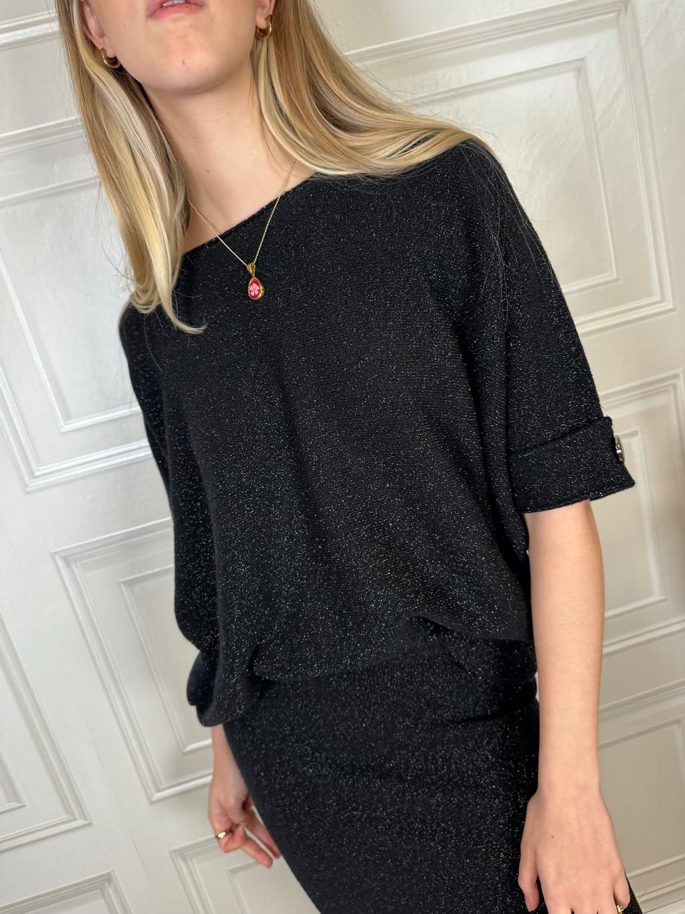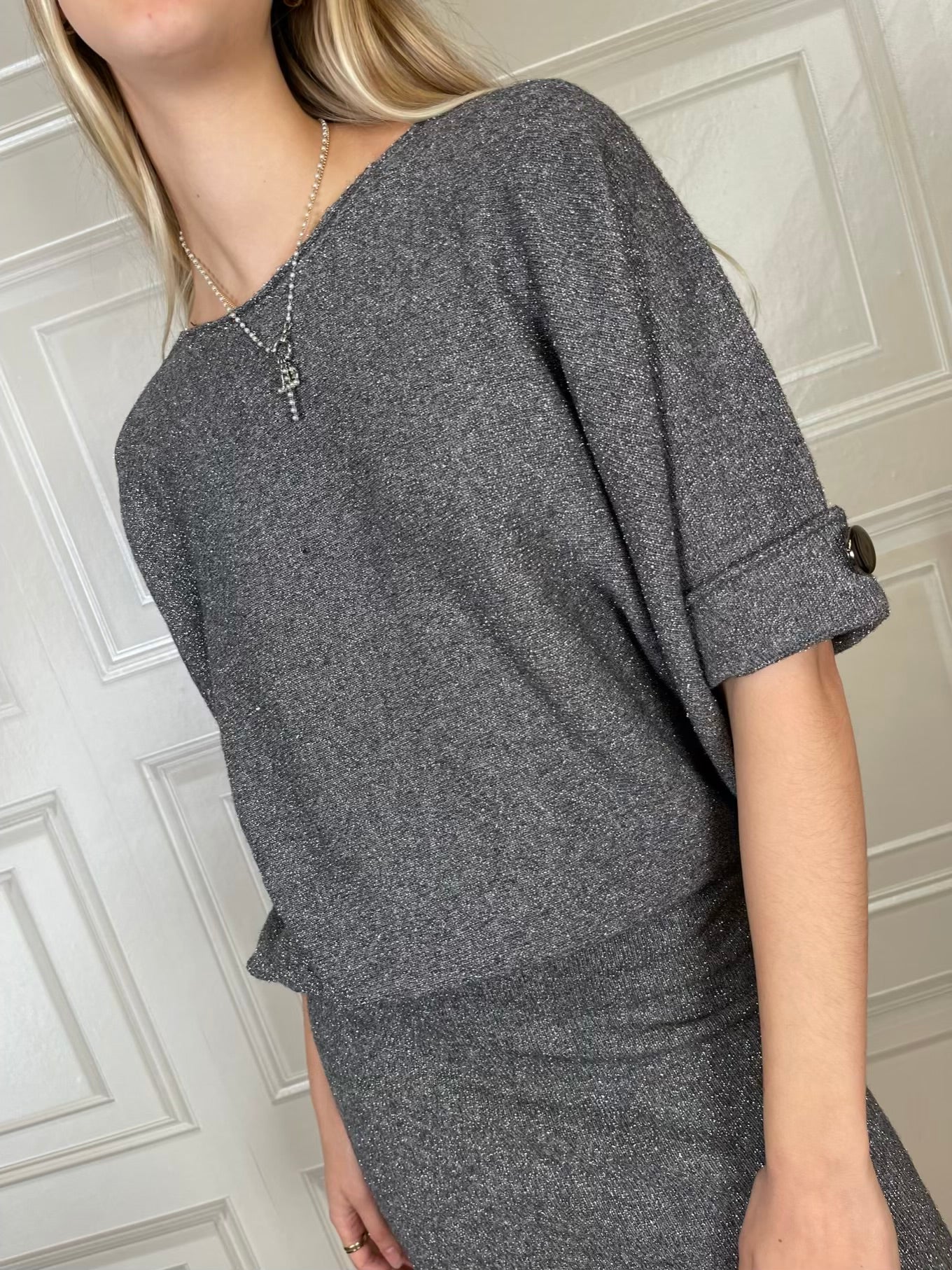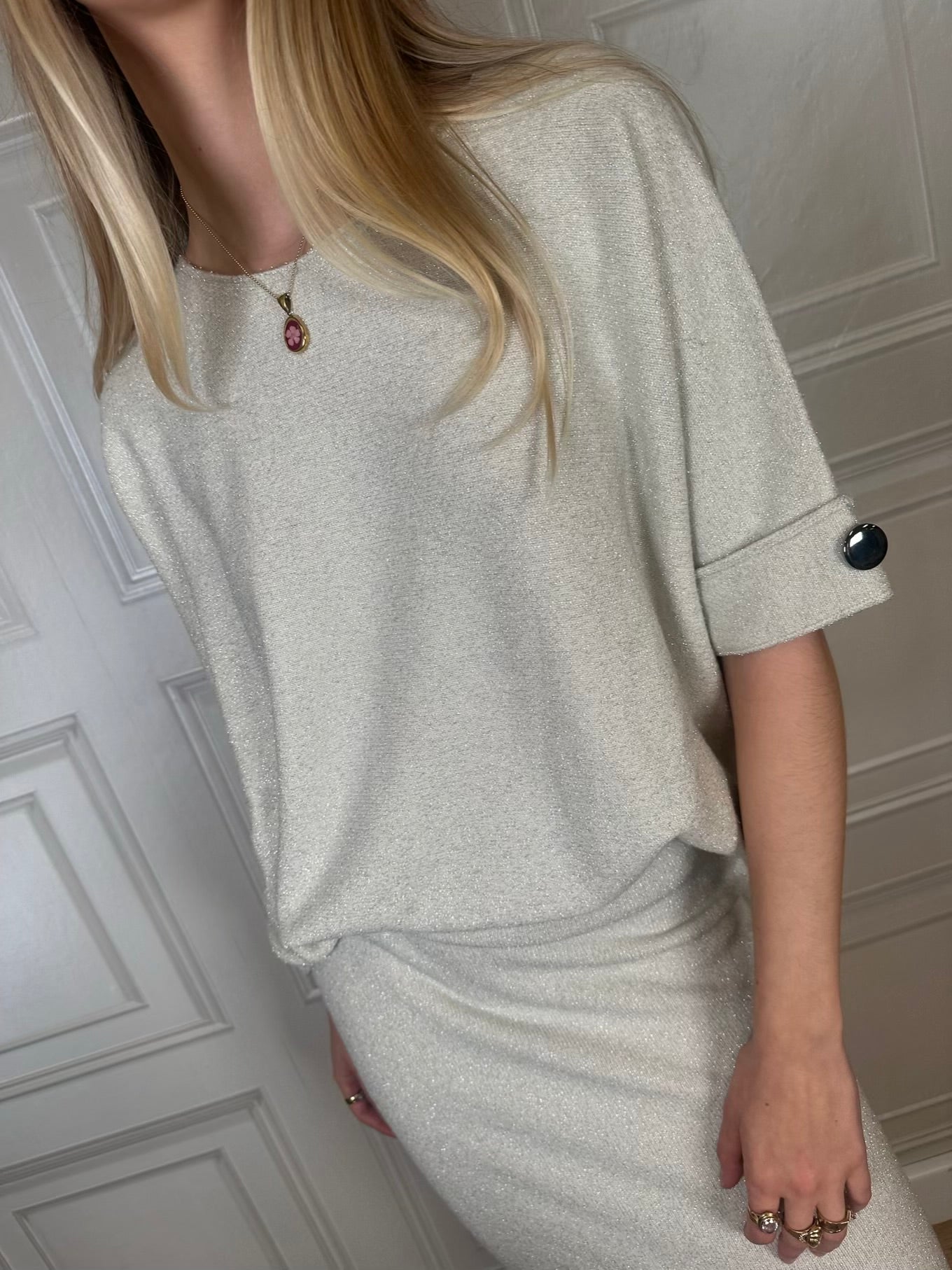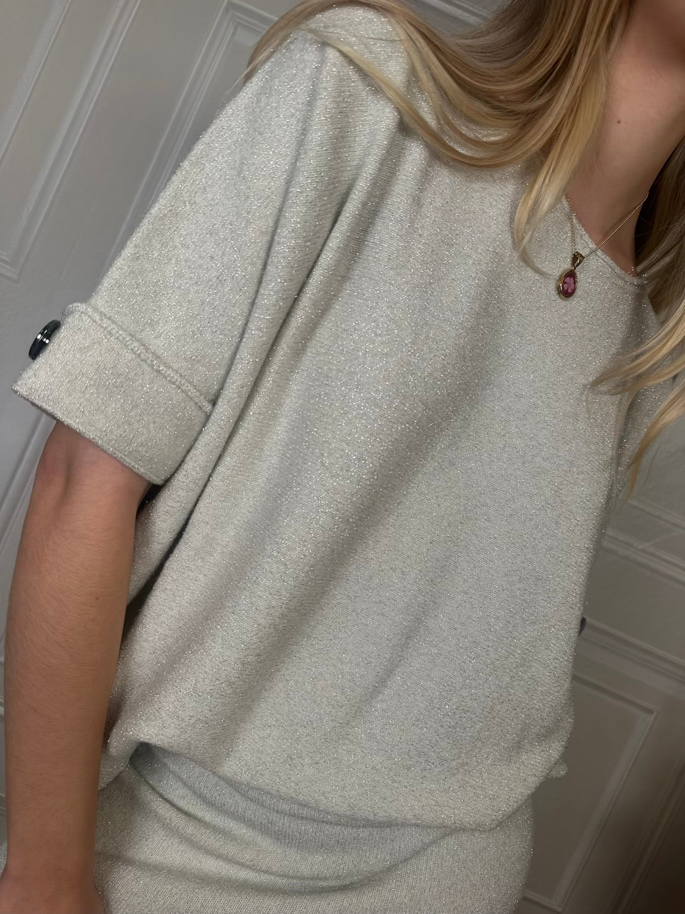 Pull in lurex. Modello over a girocollo, a mezza manica con bottone gioiello sulla manica.