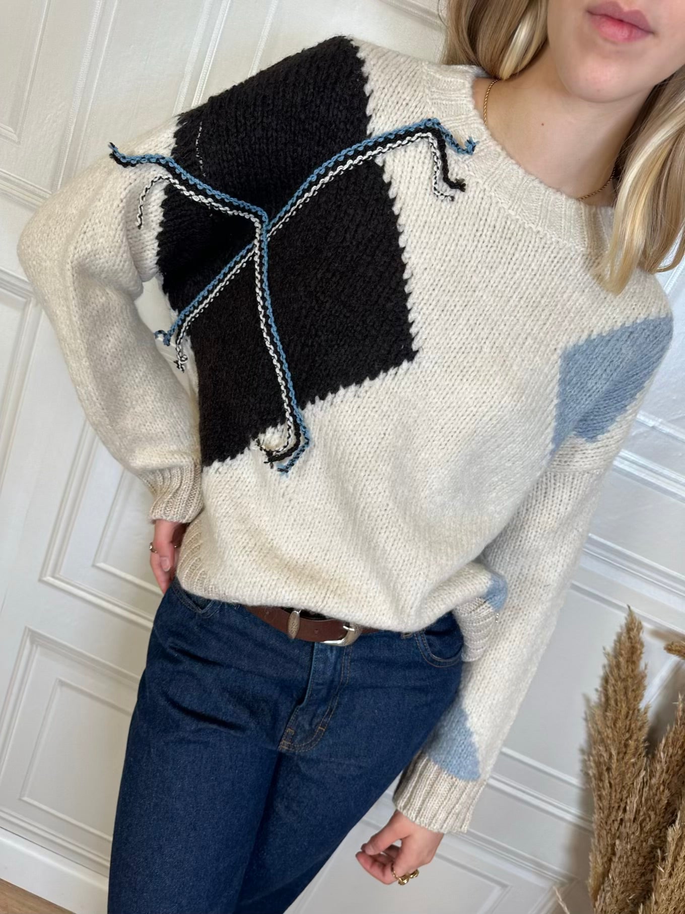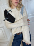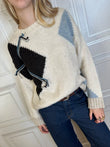 Pull girocollo panna in maglia stile handmade con rombi sui toni del moro e carta da zucchero.