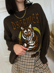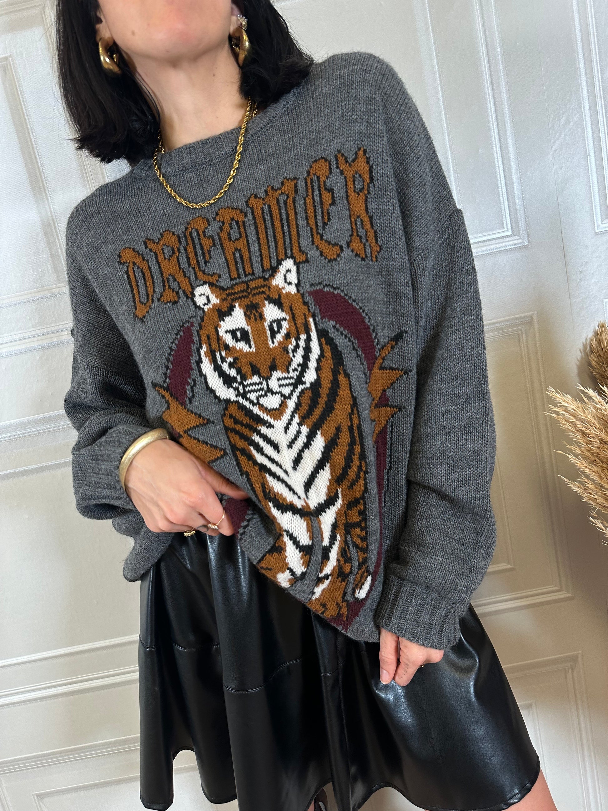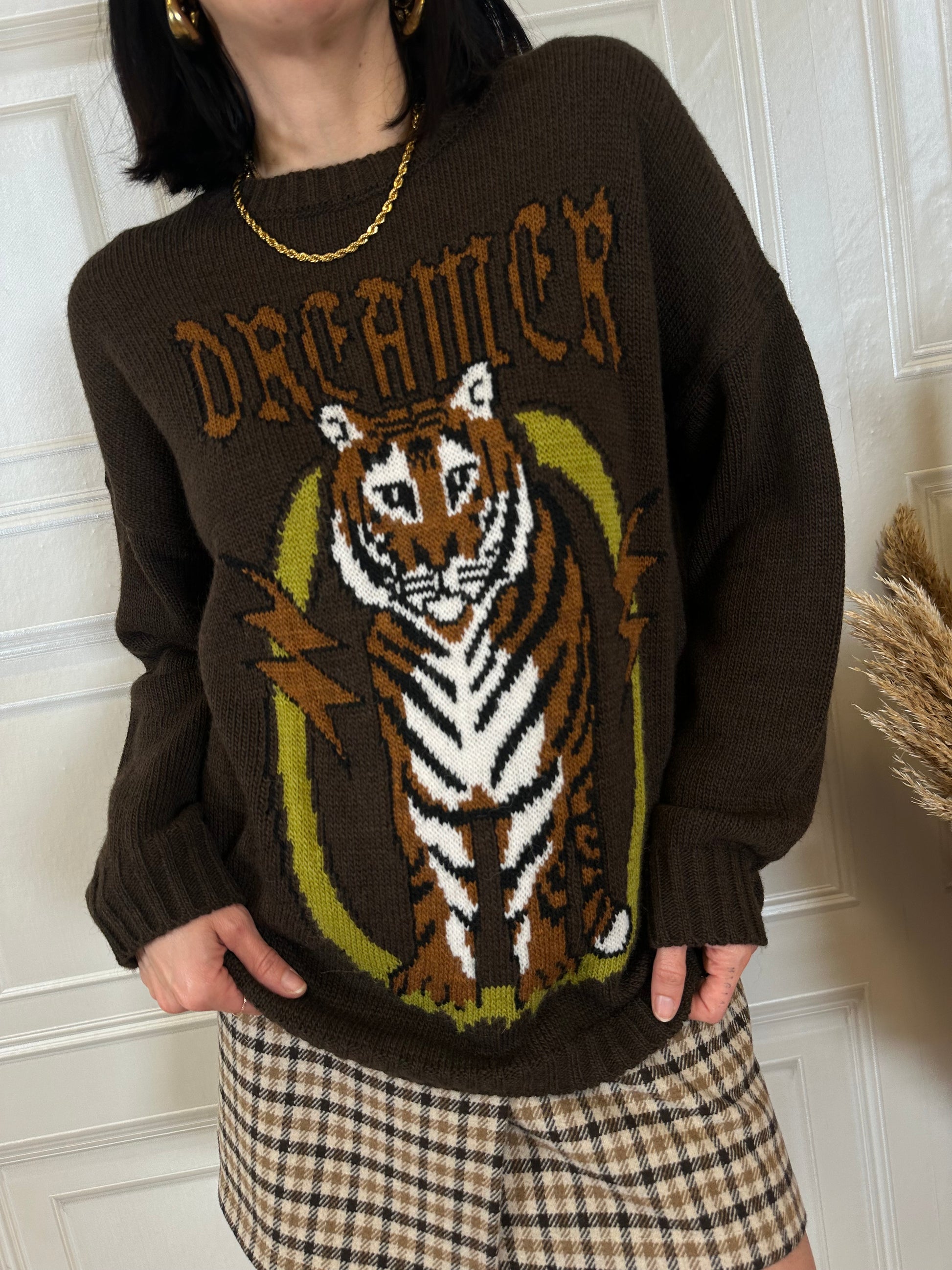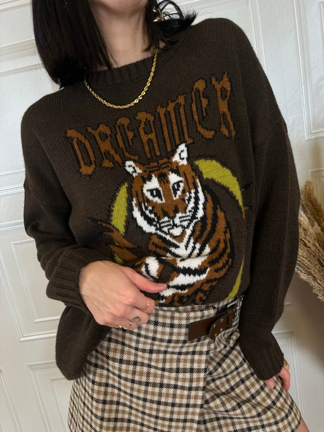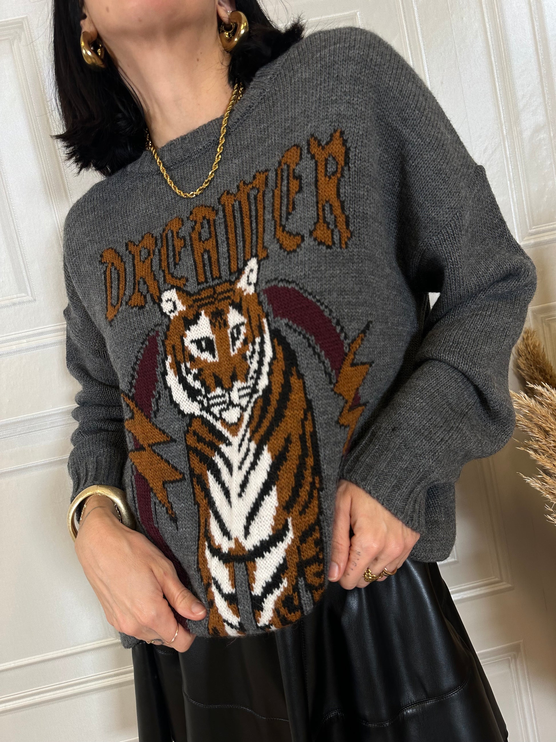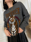 Pull girocollo smacchinato in lana alpaca con intarsio di tigre sul davanti. Fondo a costina. Vestibilità morbida