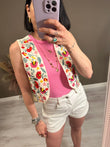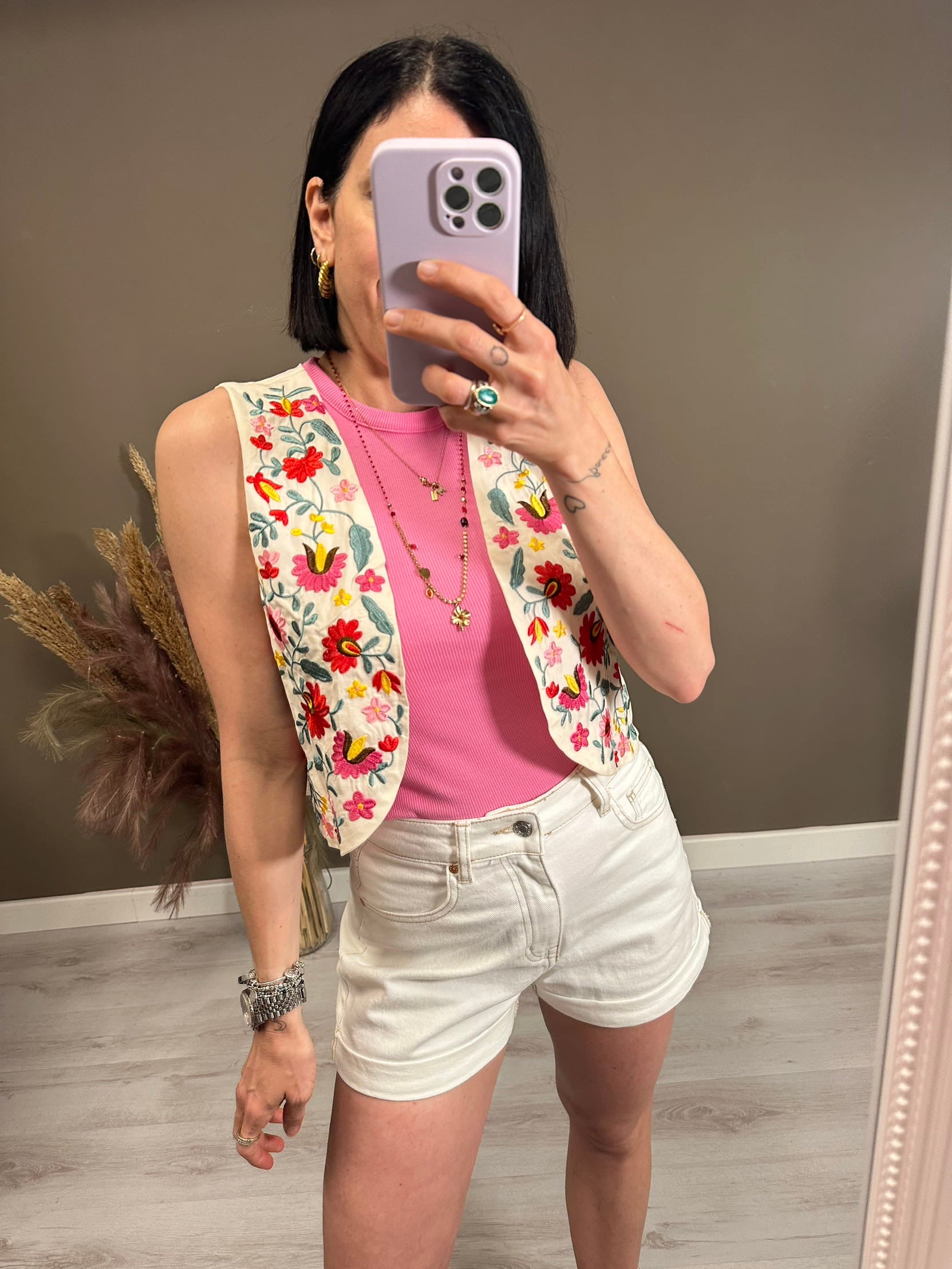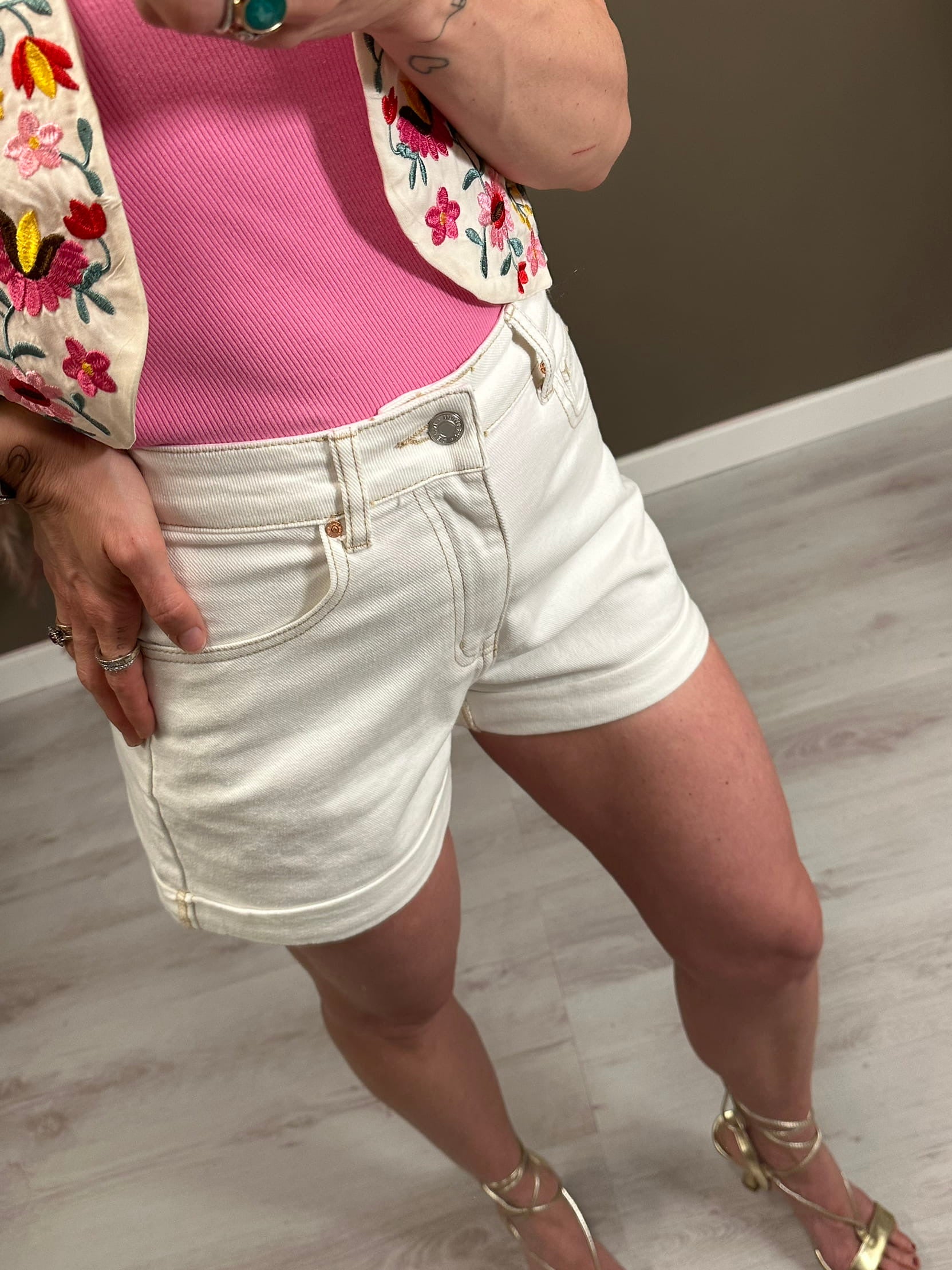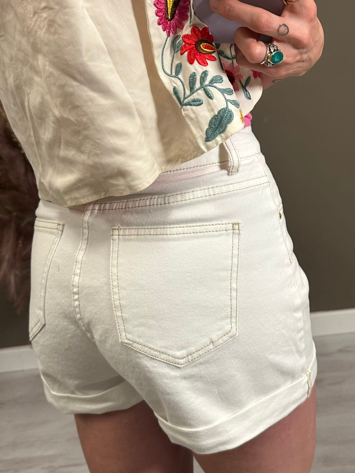 Shorts in denim panna. Modello 5 tasche a vita alta. Risvoltino sul fondo. Chiusura con zip e bottone.