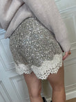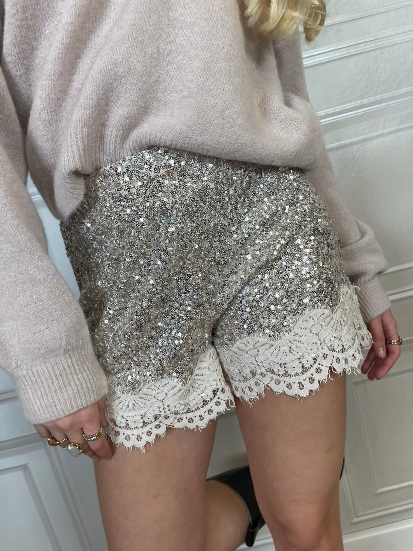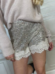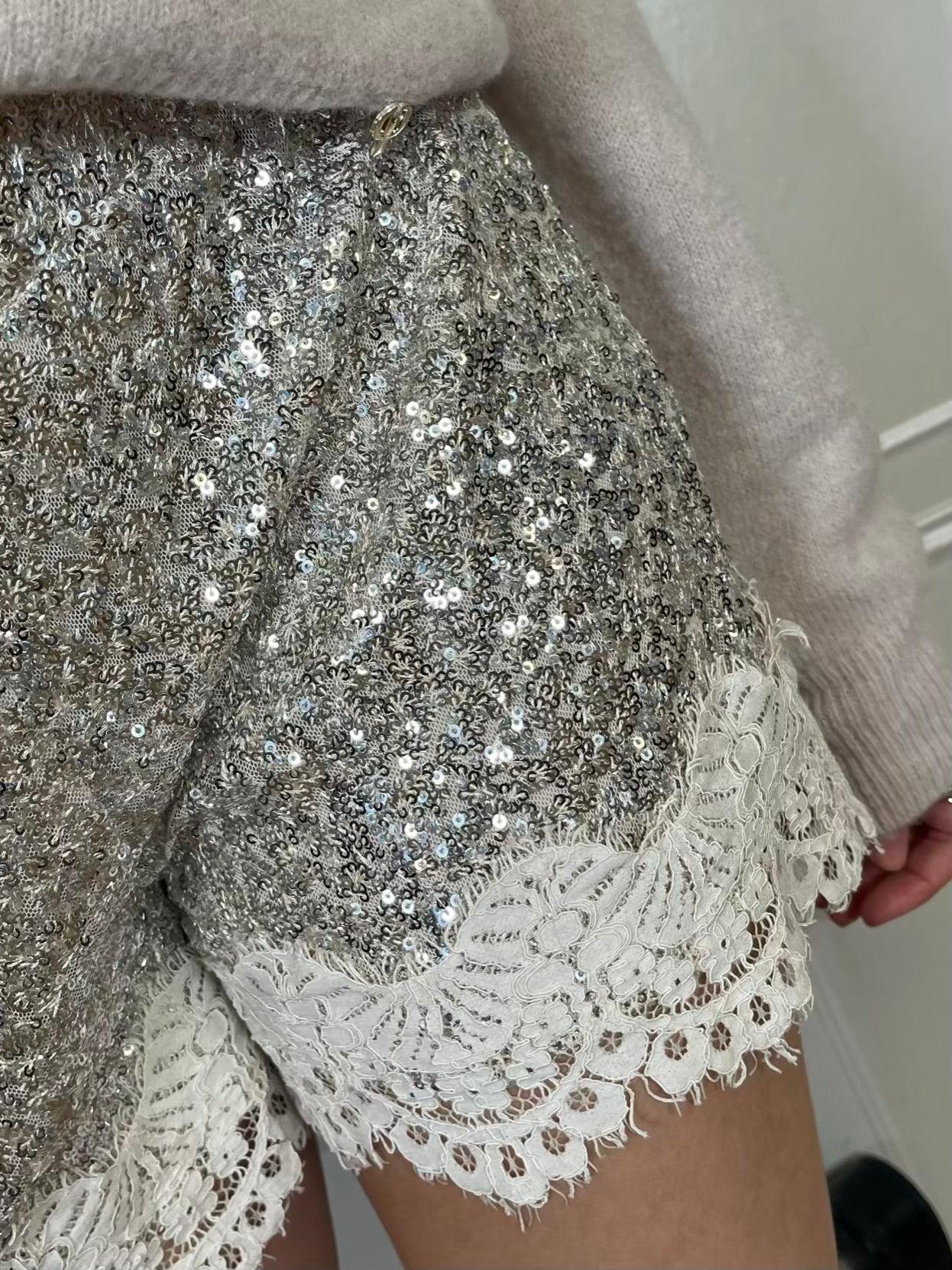 Pantaloncini lingerie con pailettes argento. Dettaglio di pizzo sul fondo. Elastico in vita. Foderati all’interno. In foto taglia S. Vestibilità regolare.
