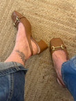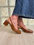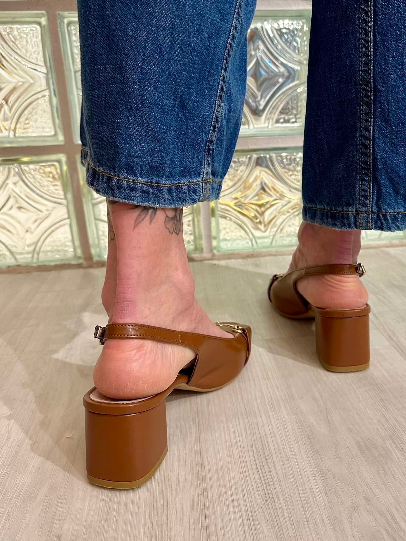 Slingback in pelle cuoio con punta quadrata. Tacco 4.5 cm circa. Calzata regolare.