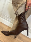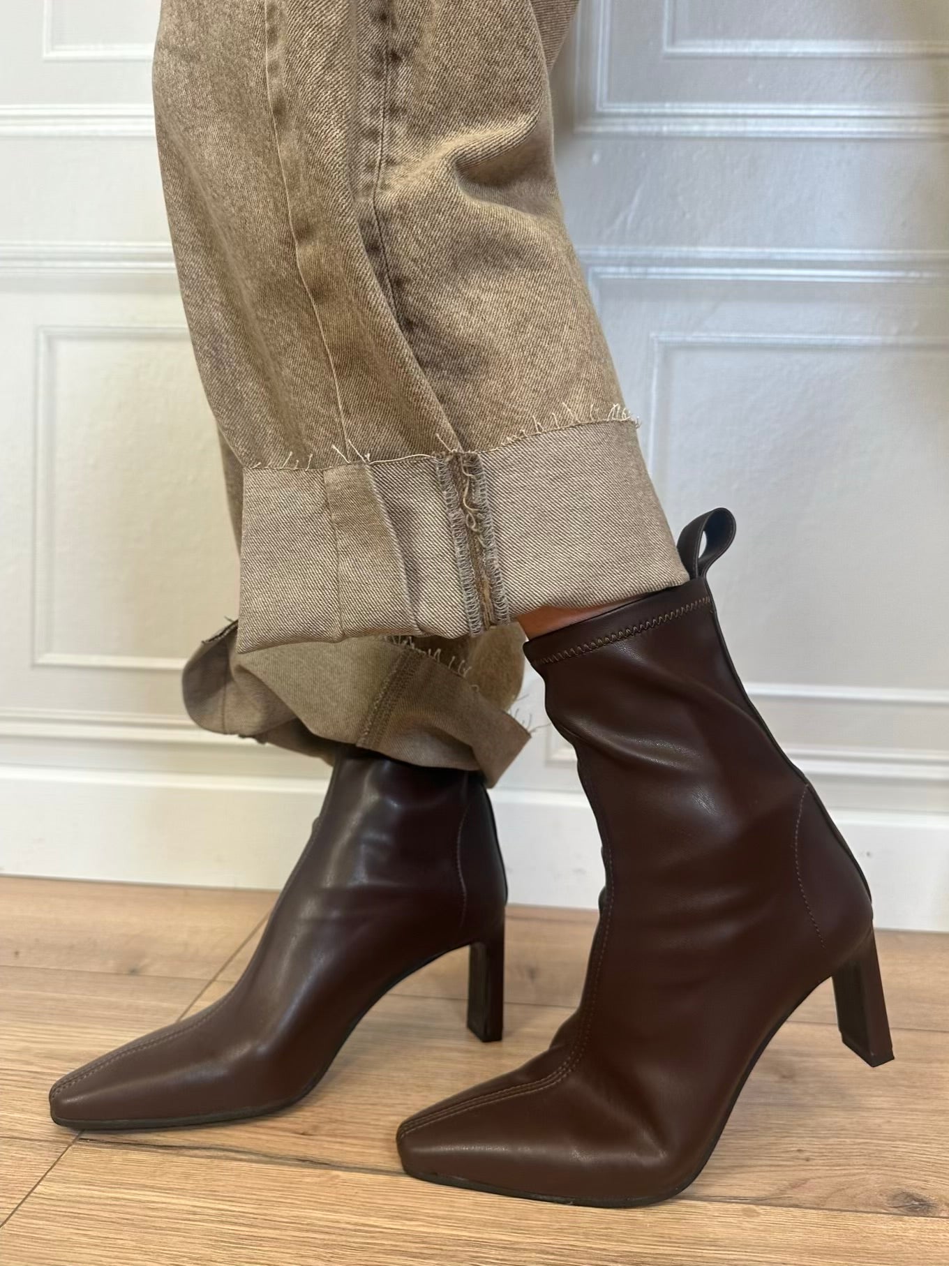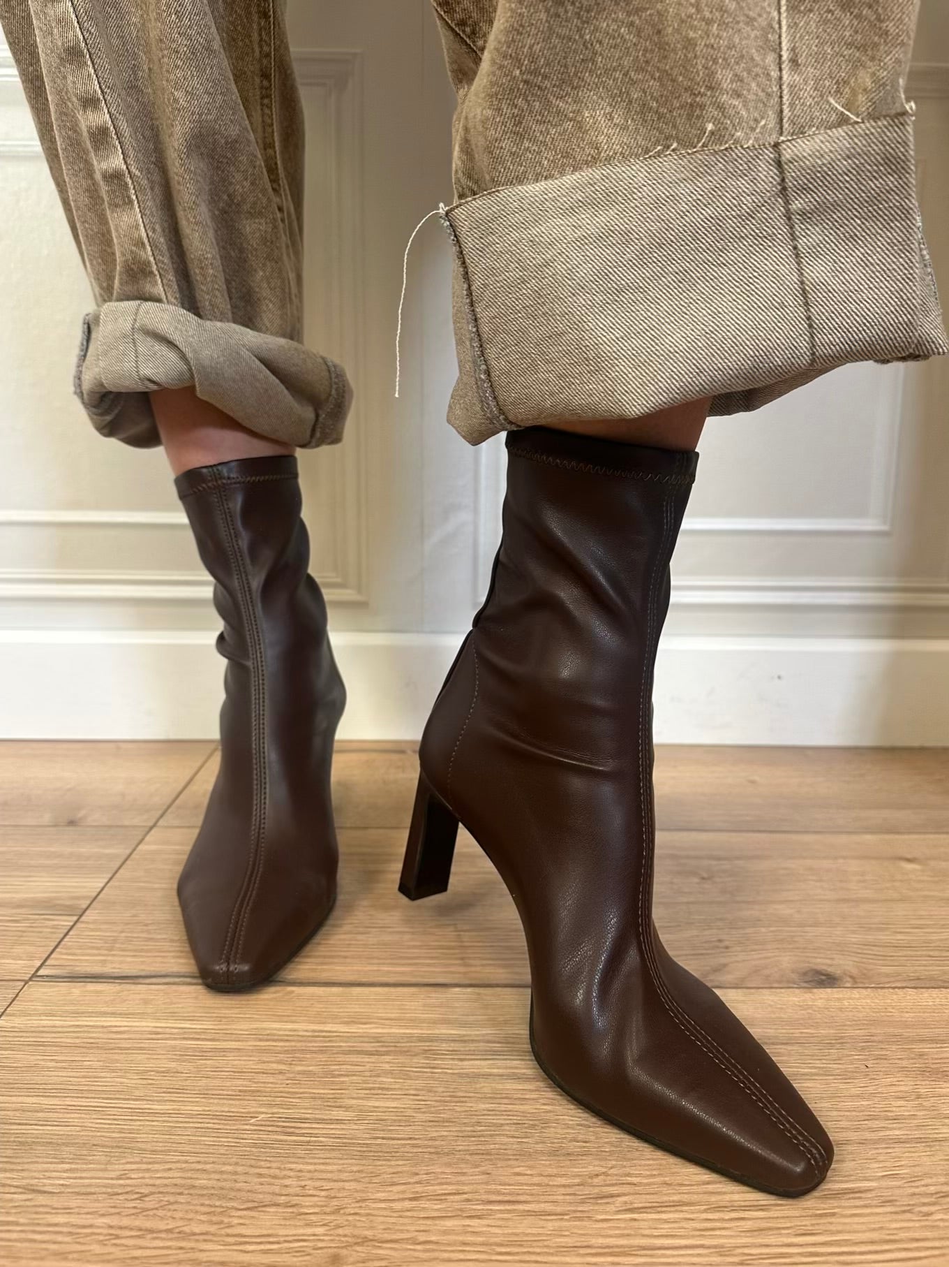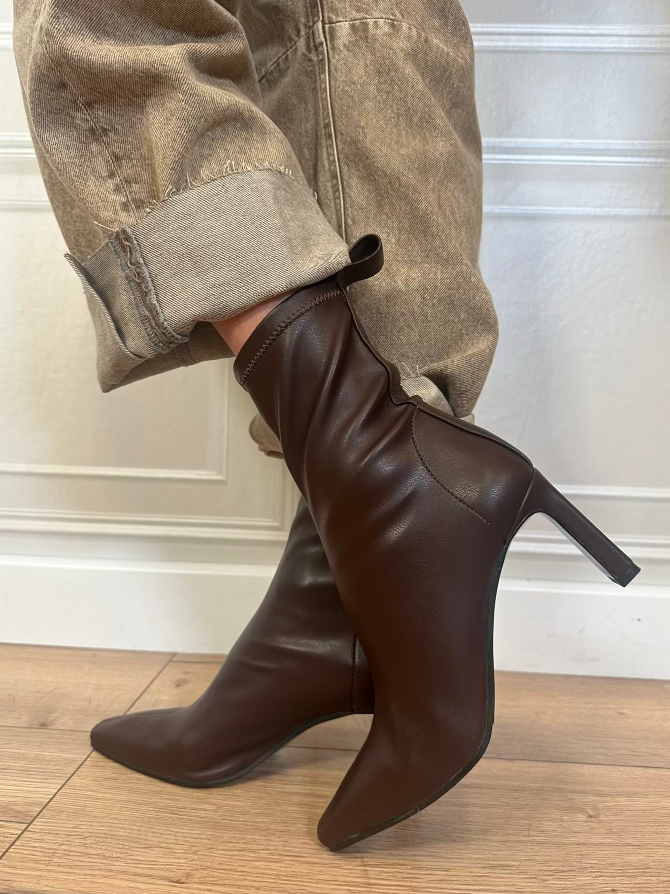 Stivaletto a calzino in pelle moro. Modello a punta.