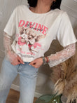 T-shirt girocollo in cotone con stampa e manica in pizzo.