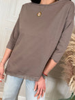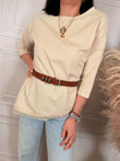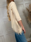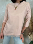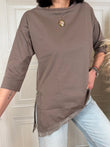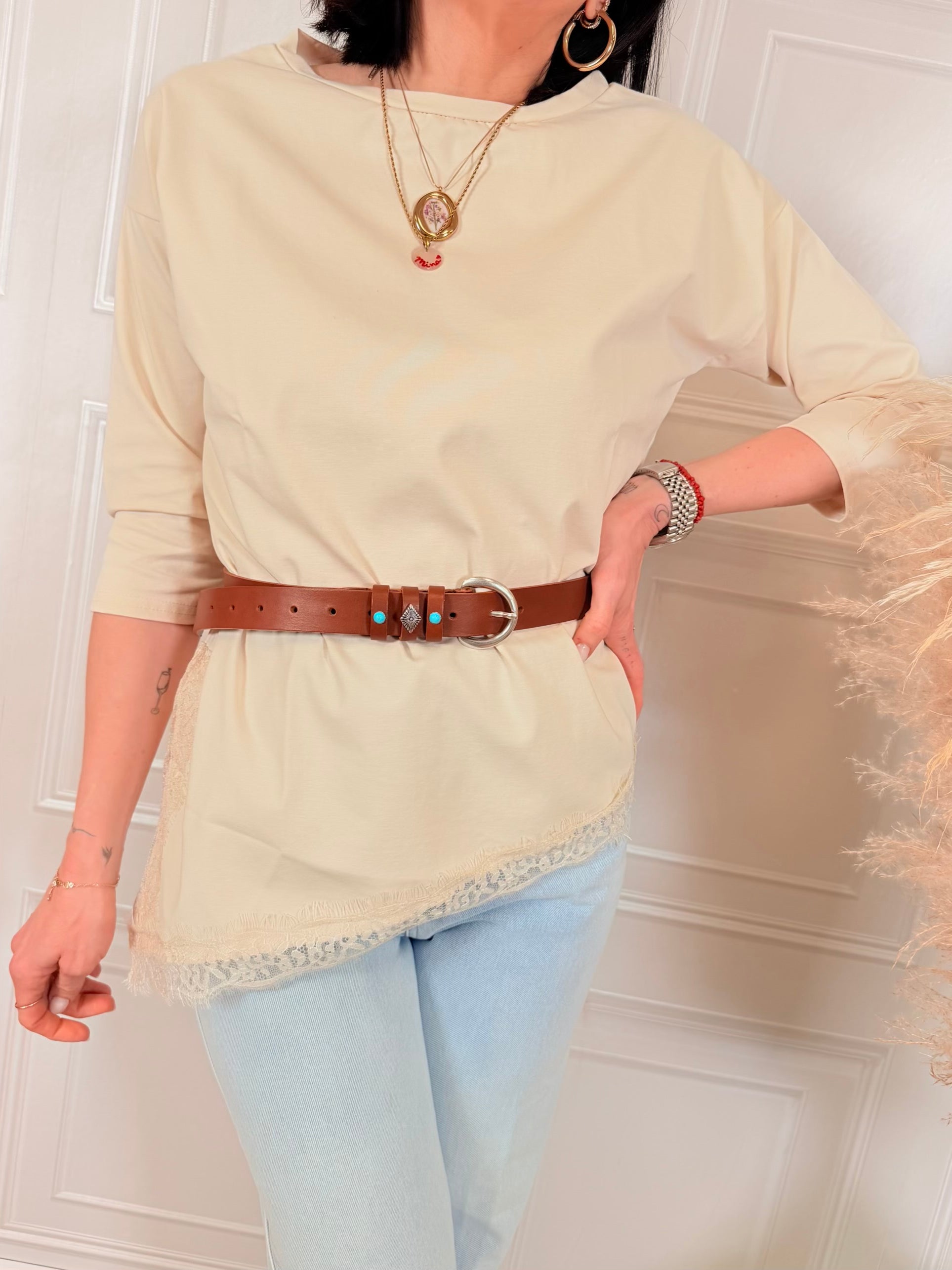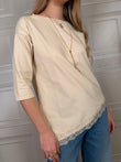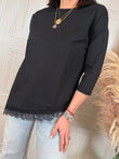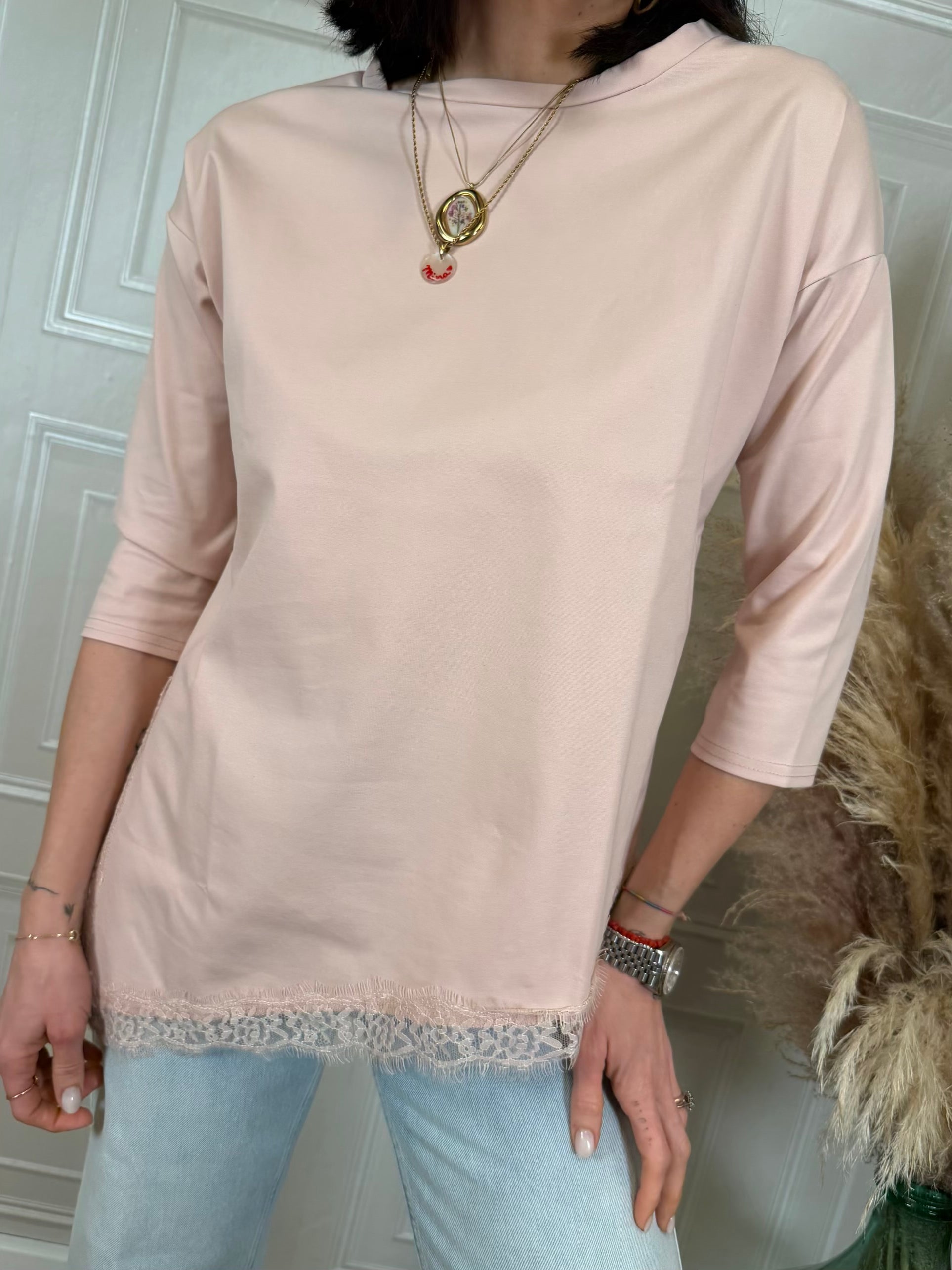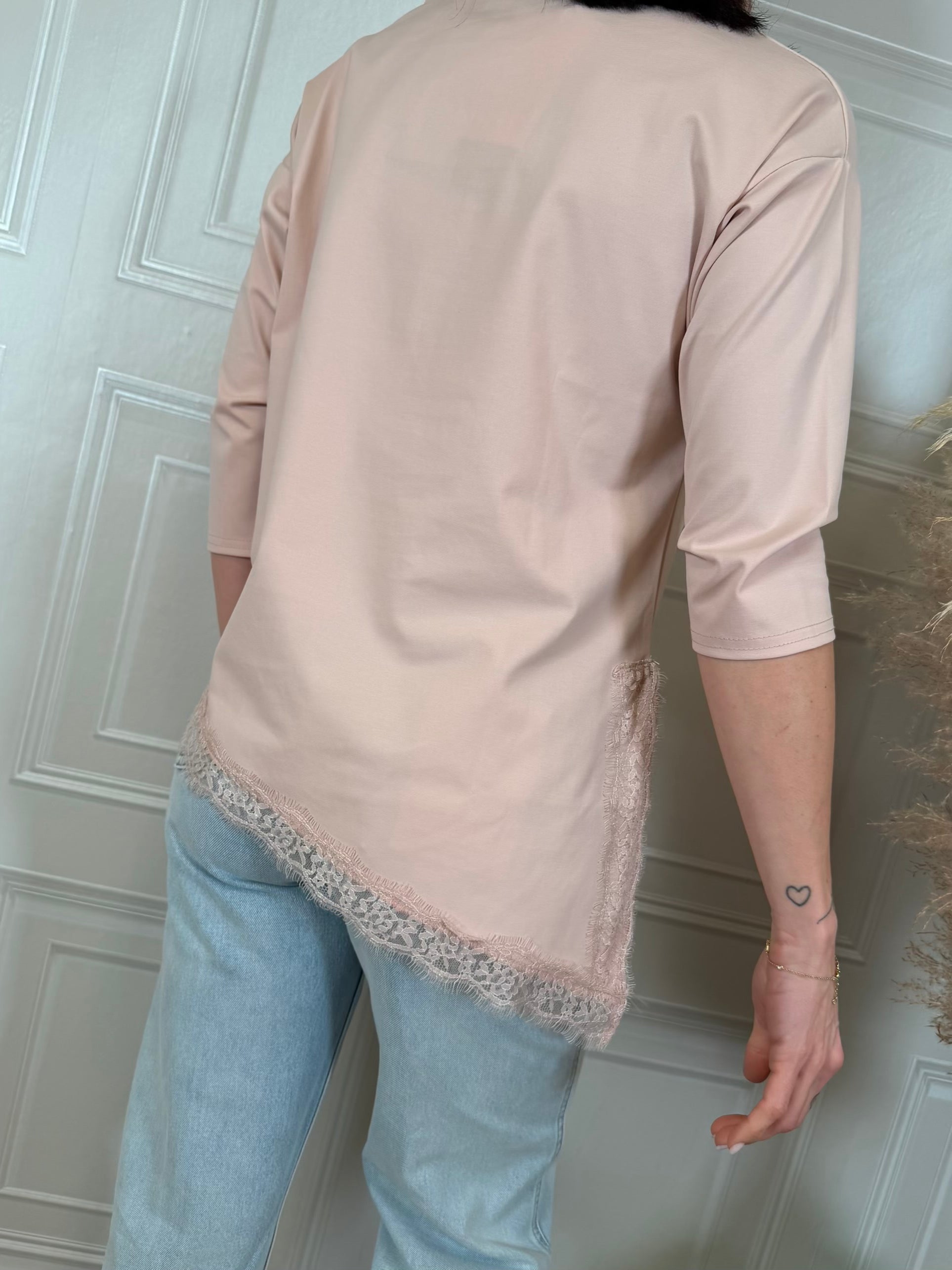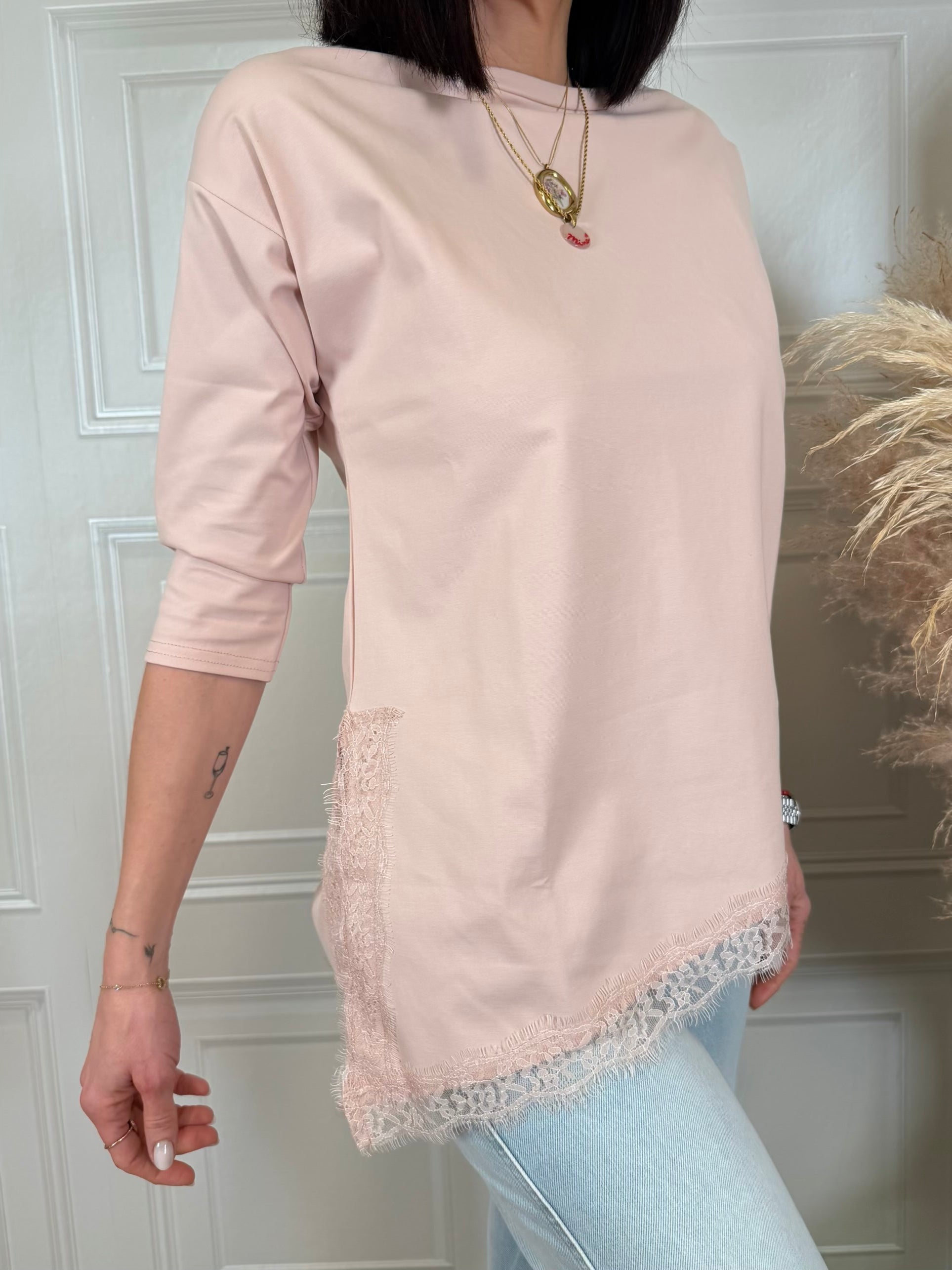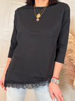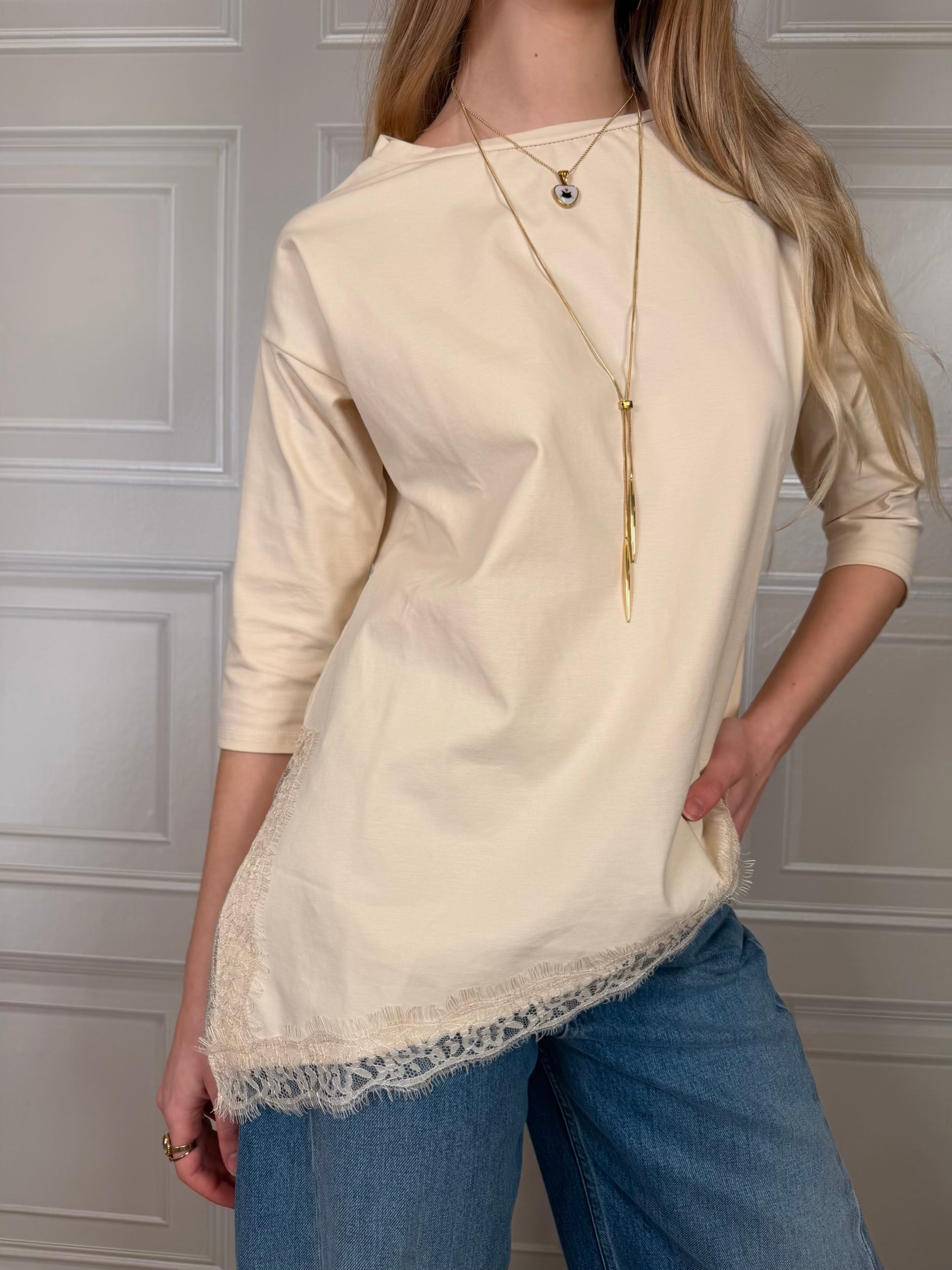 T-shirt girocollo con manica a 3/4. Fondo asimmetrico con dettaglio di pizzo e spacchetto laterale.