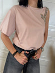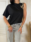 T-shirt asimmetrica. Modello man fit a girocollo. Maniche asimmetriche con dettaglio di ricamo a strass e cabochon sul davanti e sul dietro.