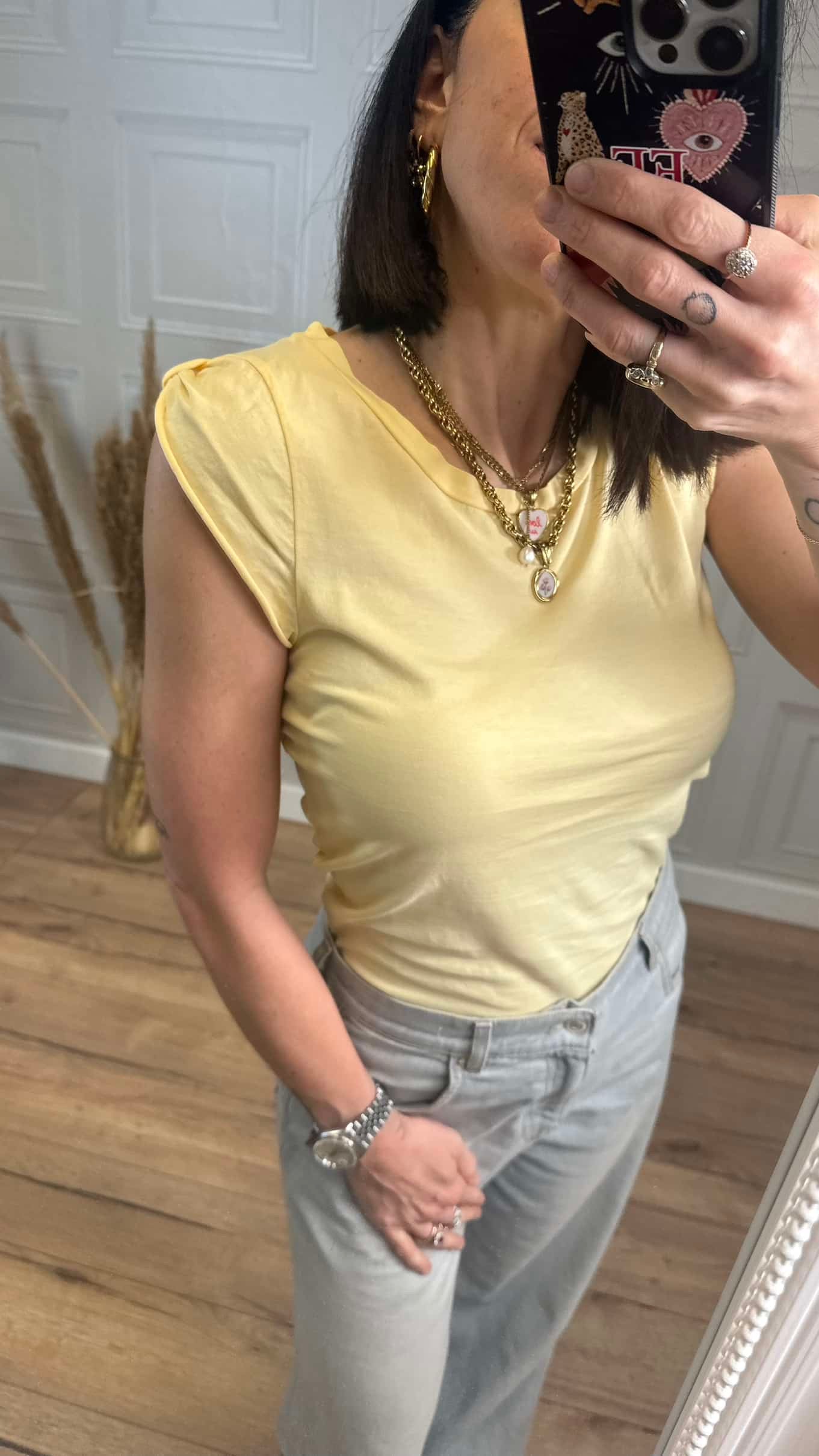 T-shirt girocollo in cotone con ripresine sulla spalla.