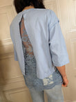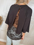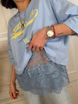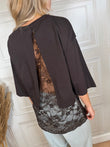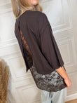 T-Shirt sui toni del moro e giallo. Modello over con manica 3/4. Dettaglio di pizzo e apertura sul retro.