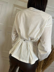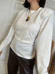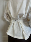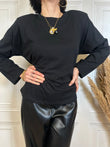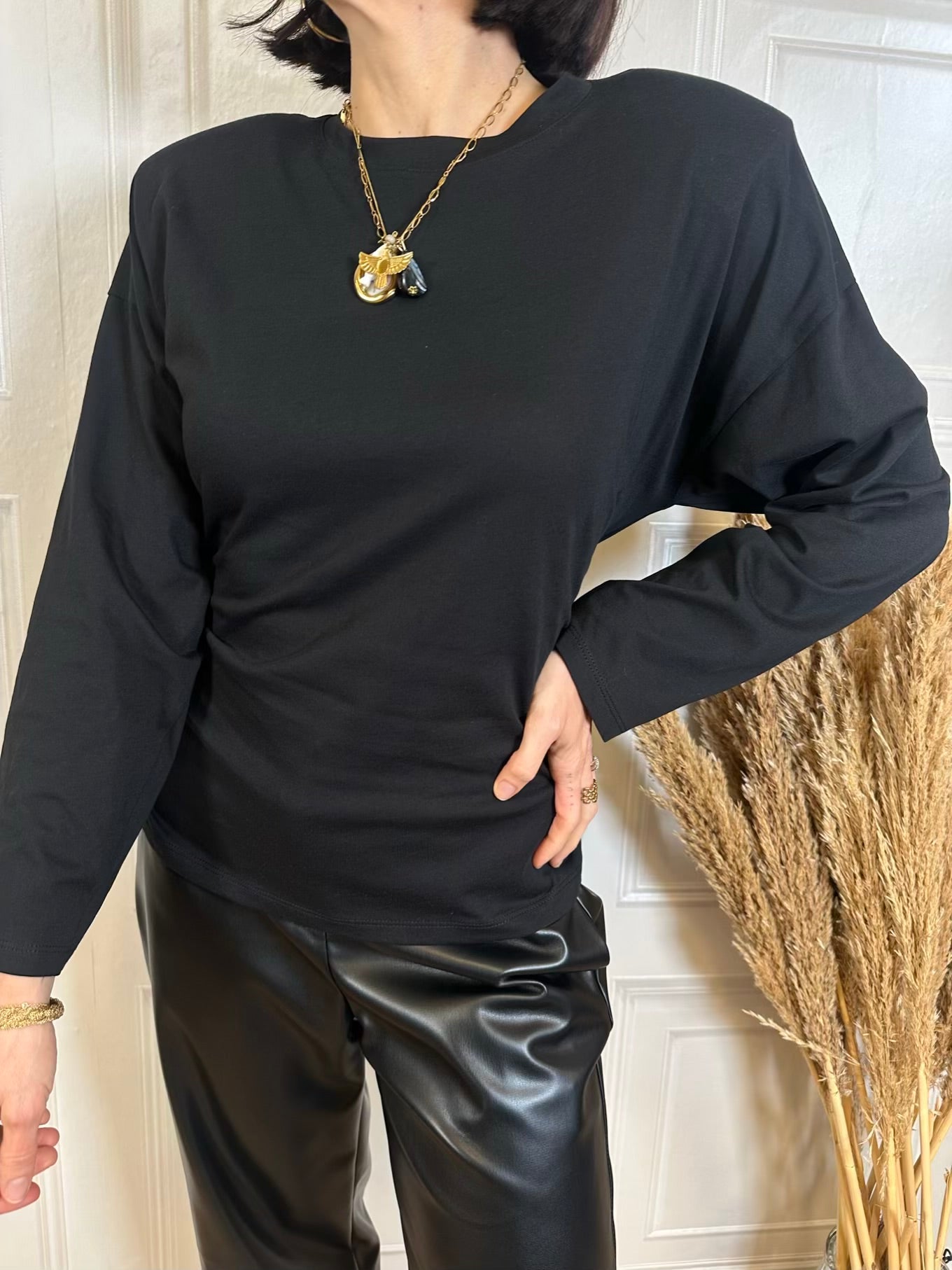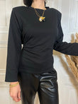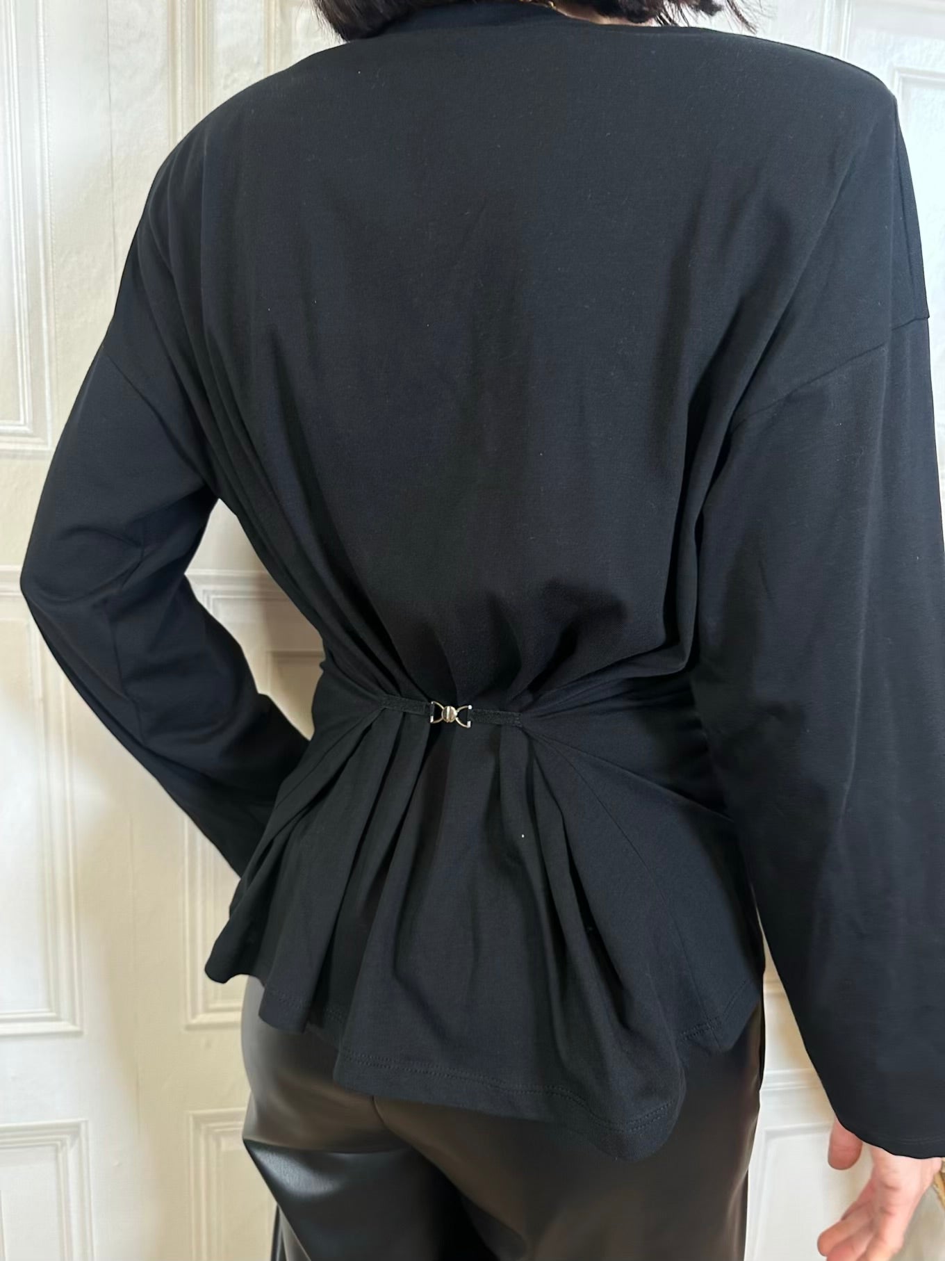 Modello over con manica lunga e, spalla imbottita, dettaglio sul retro con gancetto.