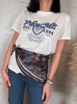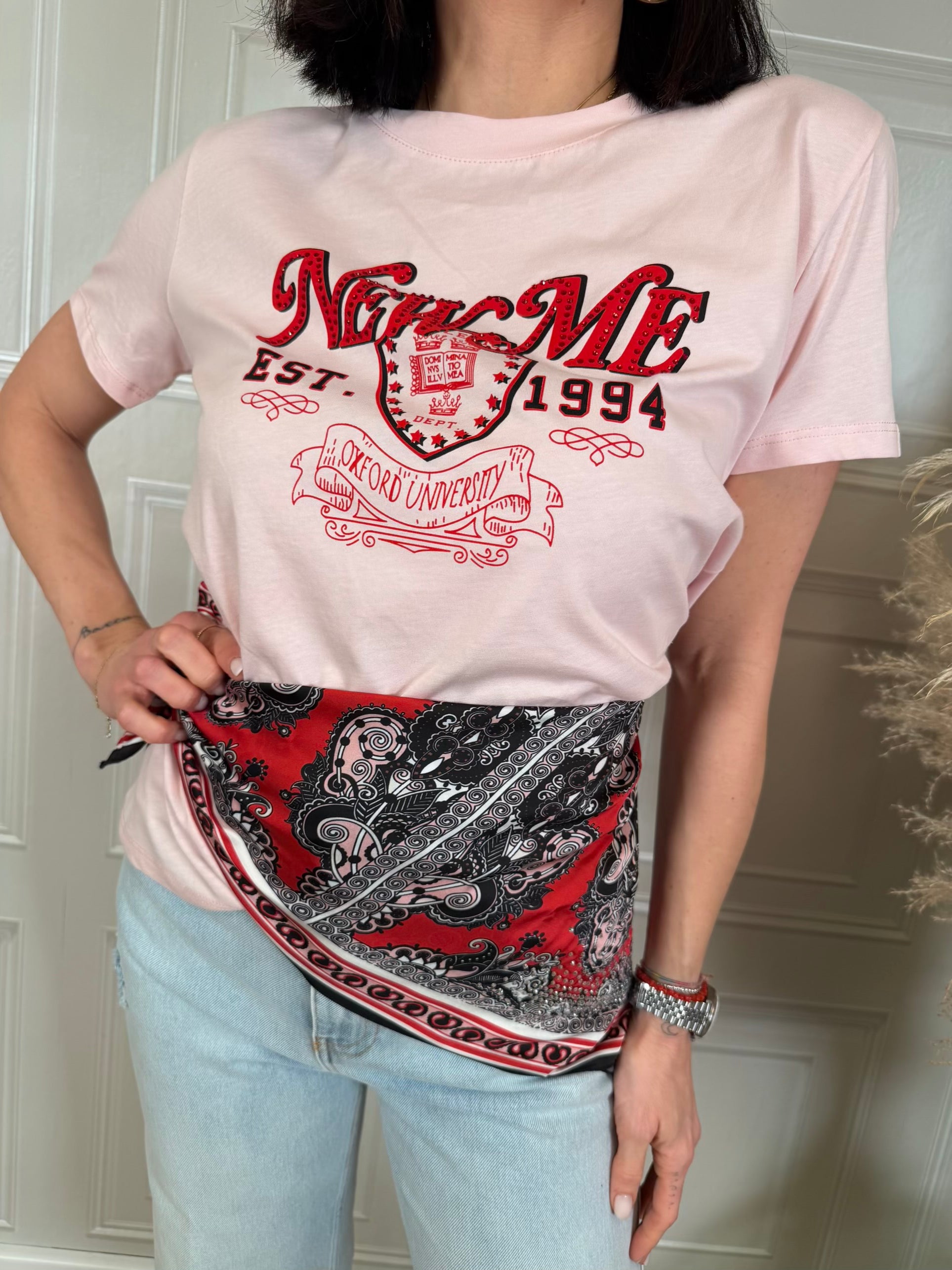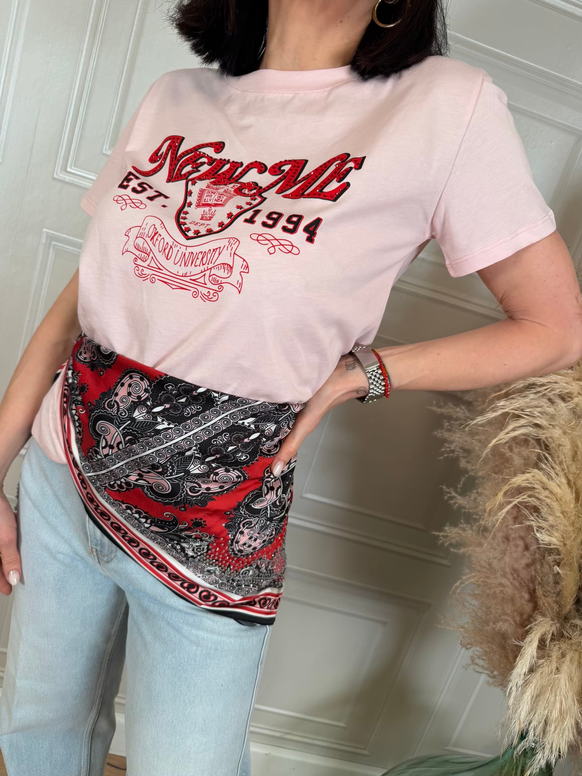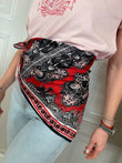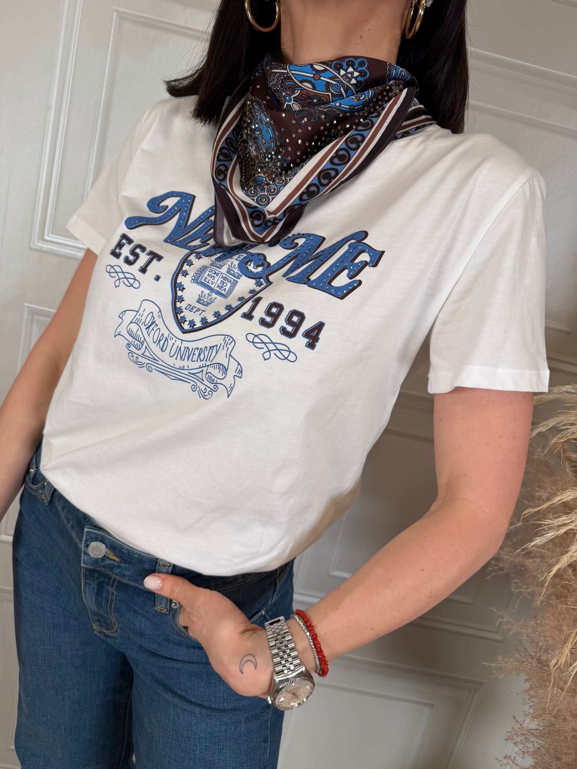 T-shirt girocollo in cotone con stampa e strass. Bandana a fantasia con strass inclusa.