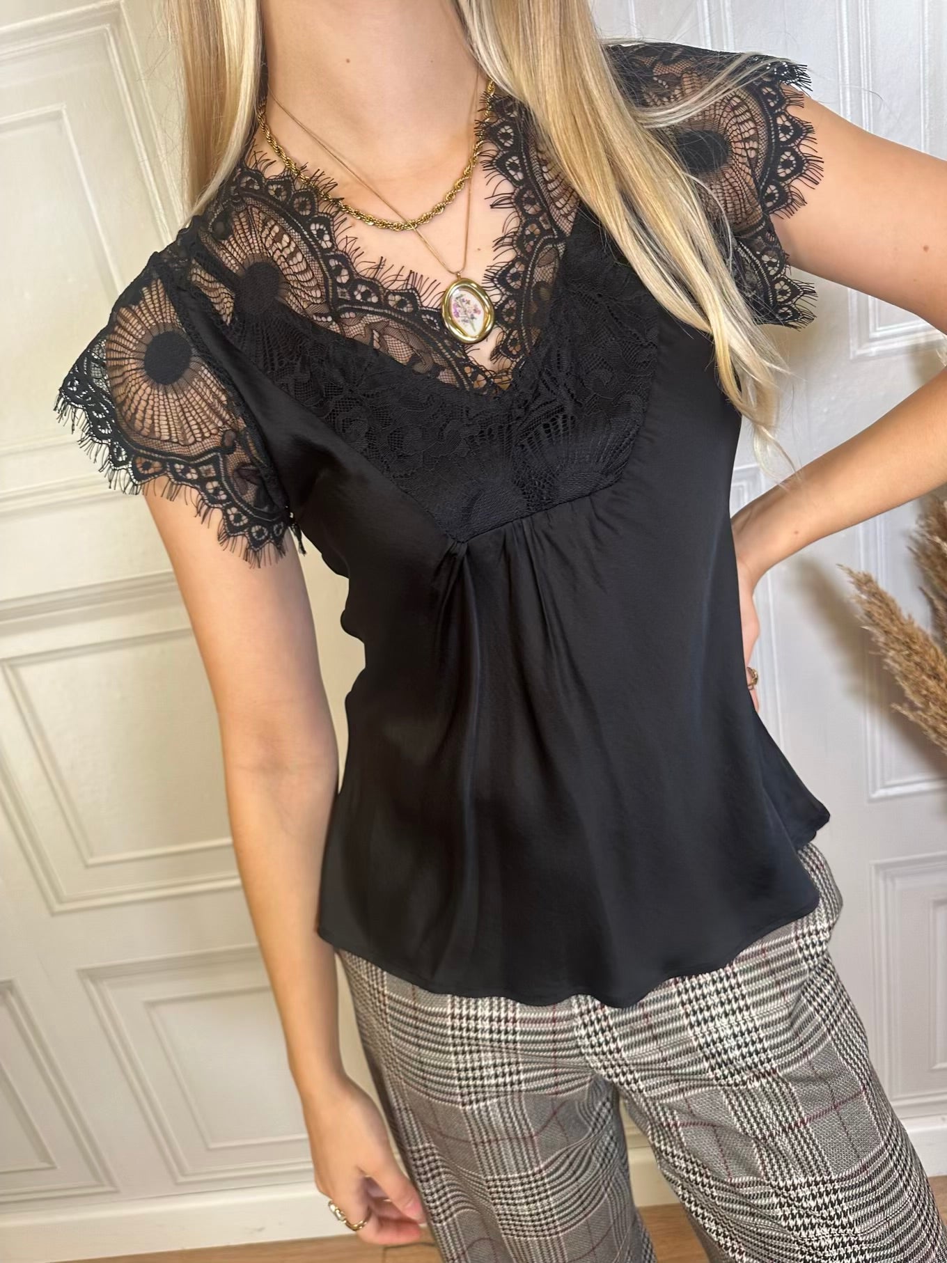 Blusa in satin di viscosa, con pizzo su scollatura e maniche. Scollo a V. Come dettaglio, un leggero arriccio sotto la scollatura che le conferisce movimento.
