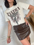 T-shirt color latte, stampa scritta tantra color moro ed angelo con sfumature di verde scuro e chiaro.