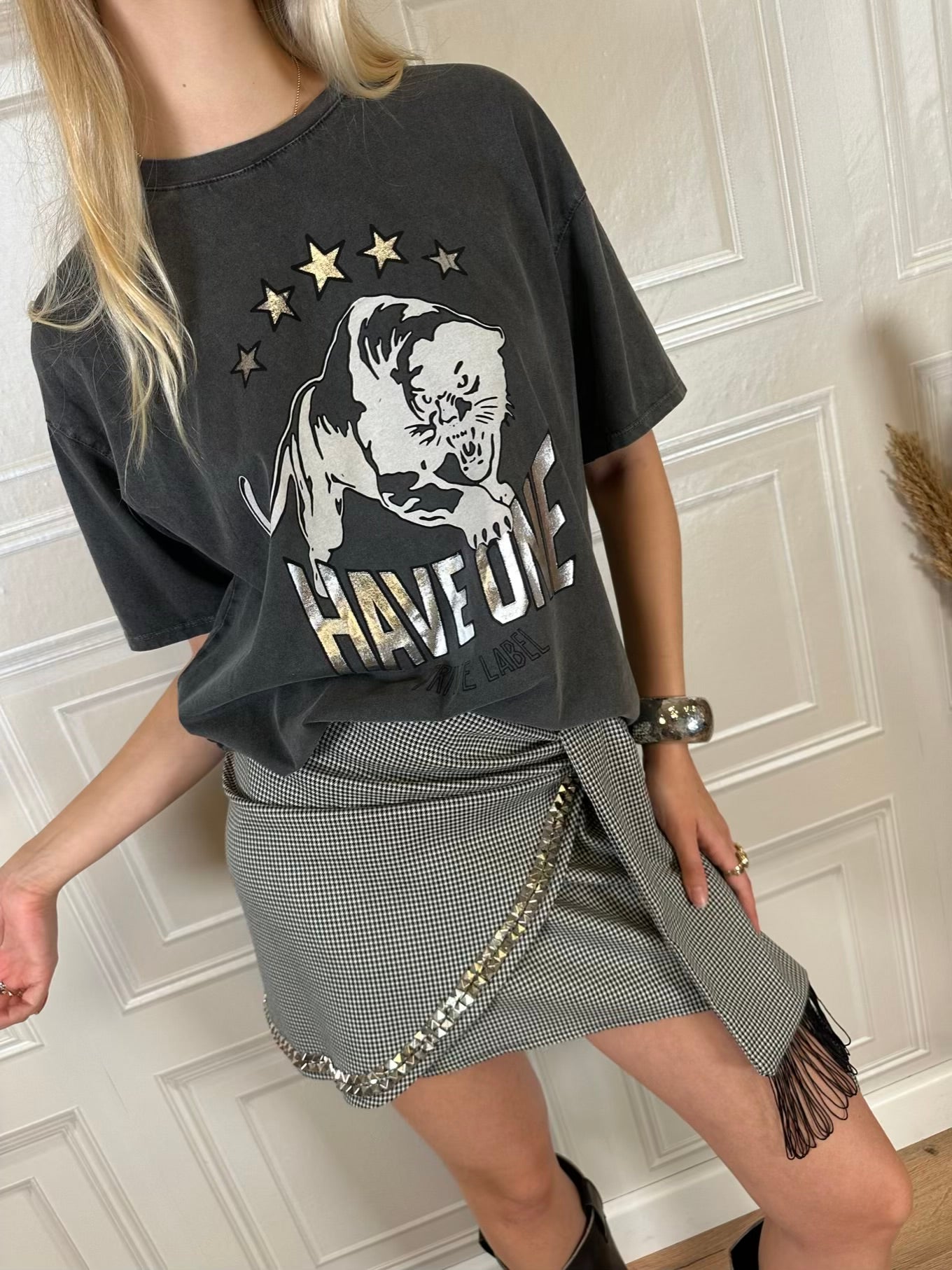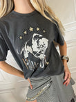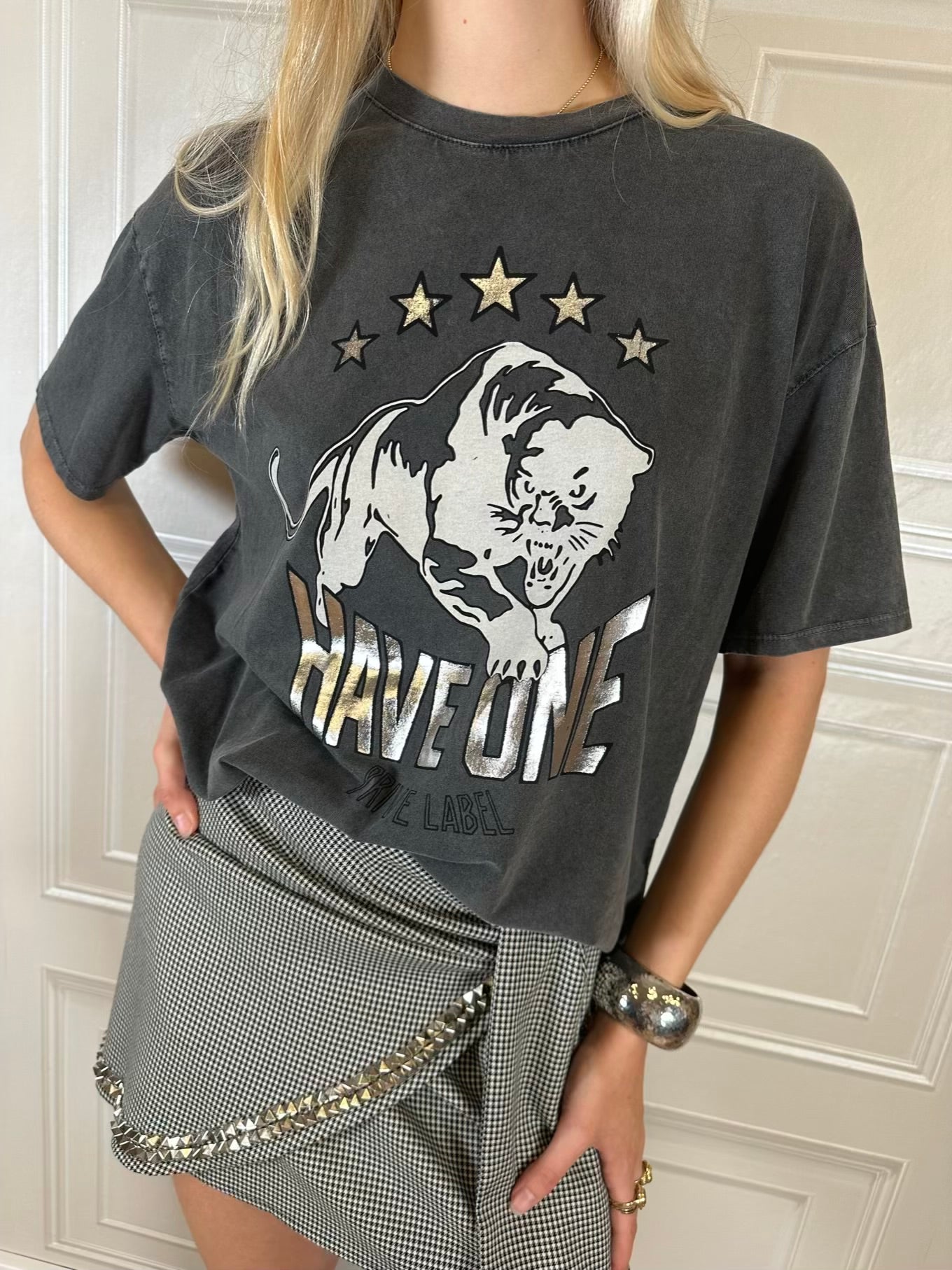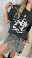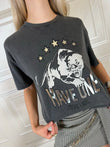 T-shirt vintage delave’ girocollo in cotone con stampa. Taglia unica, modello oversize con spalla scesa.