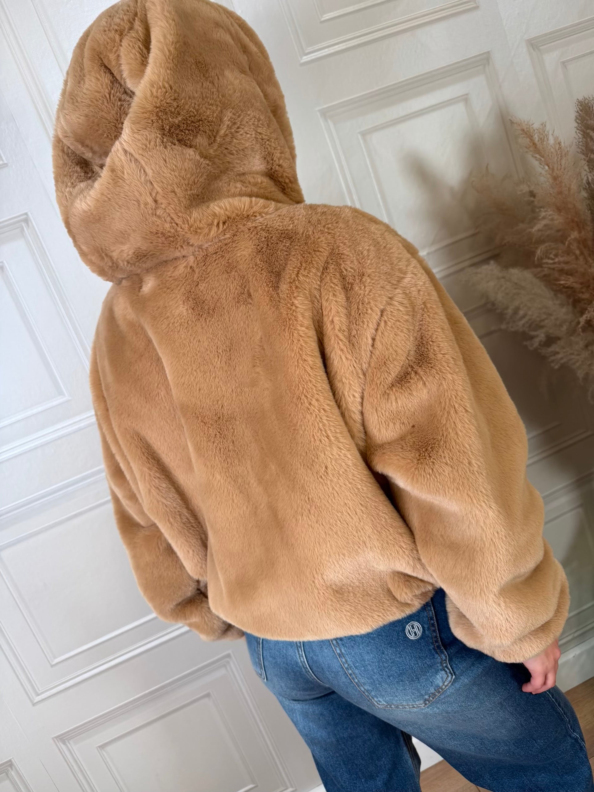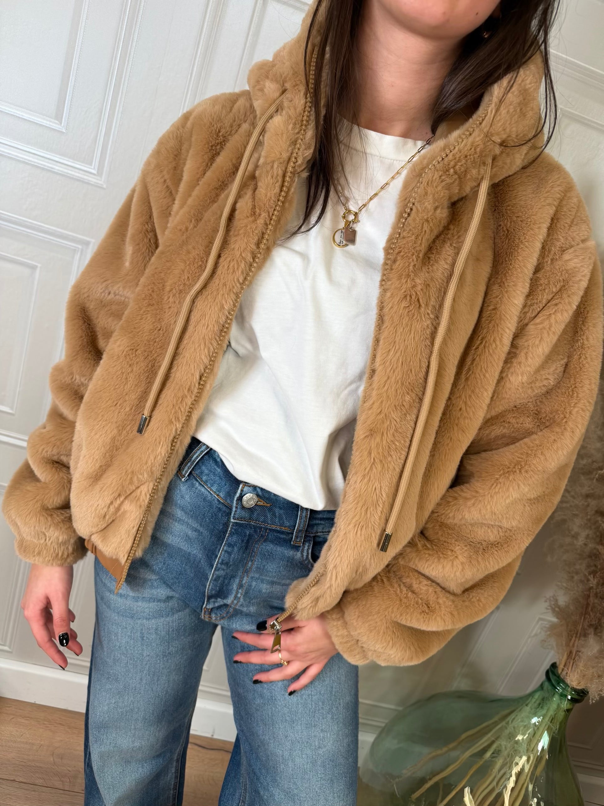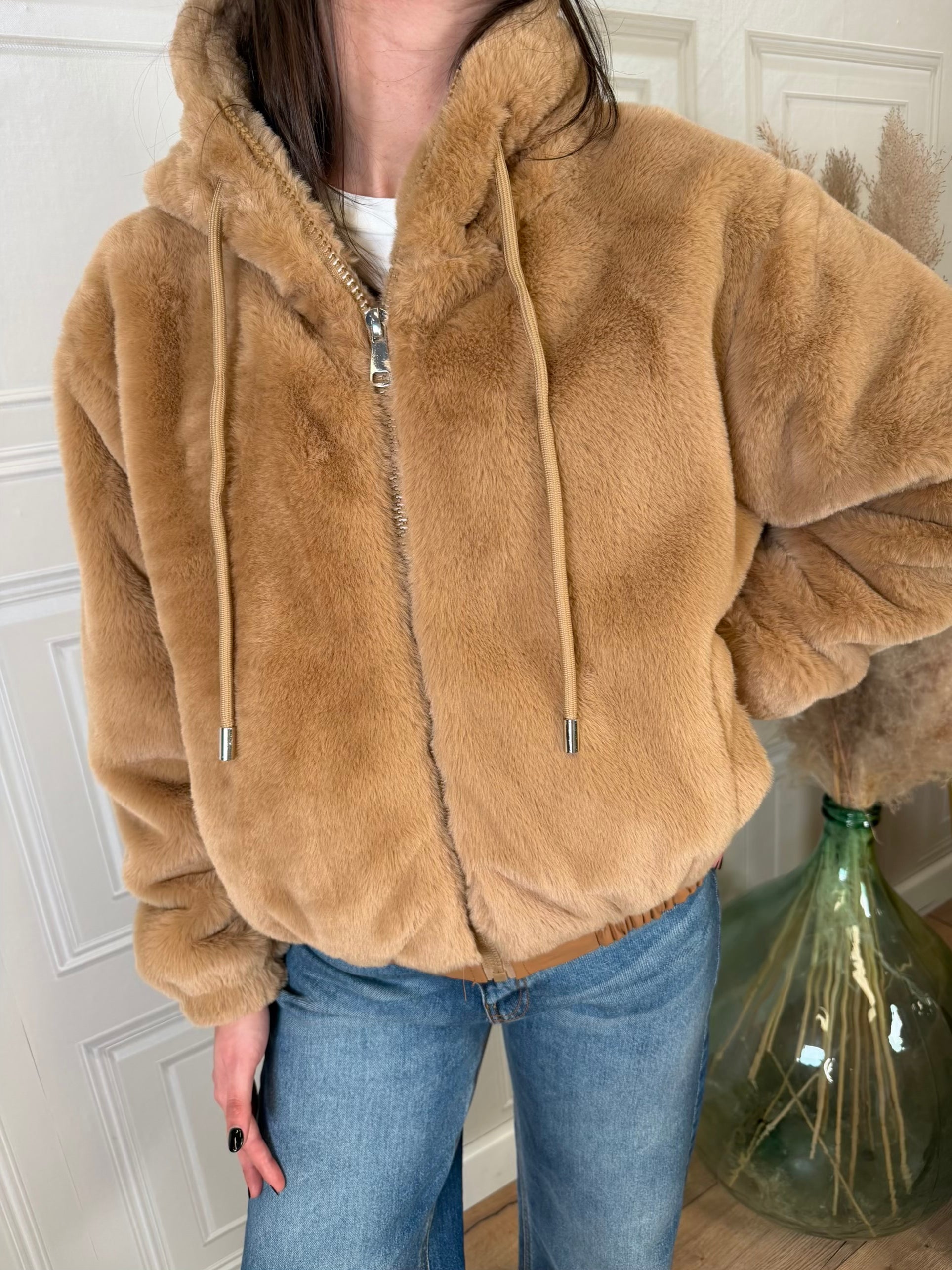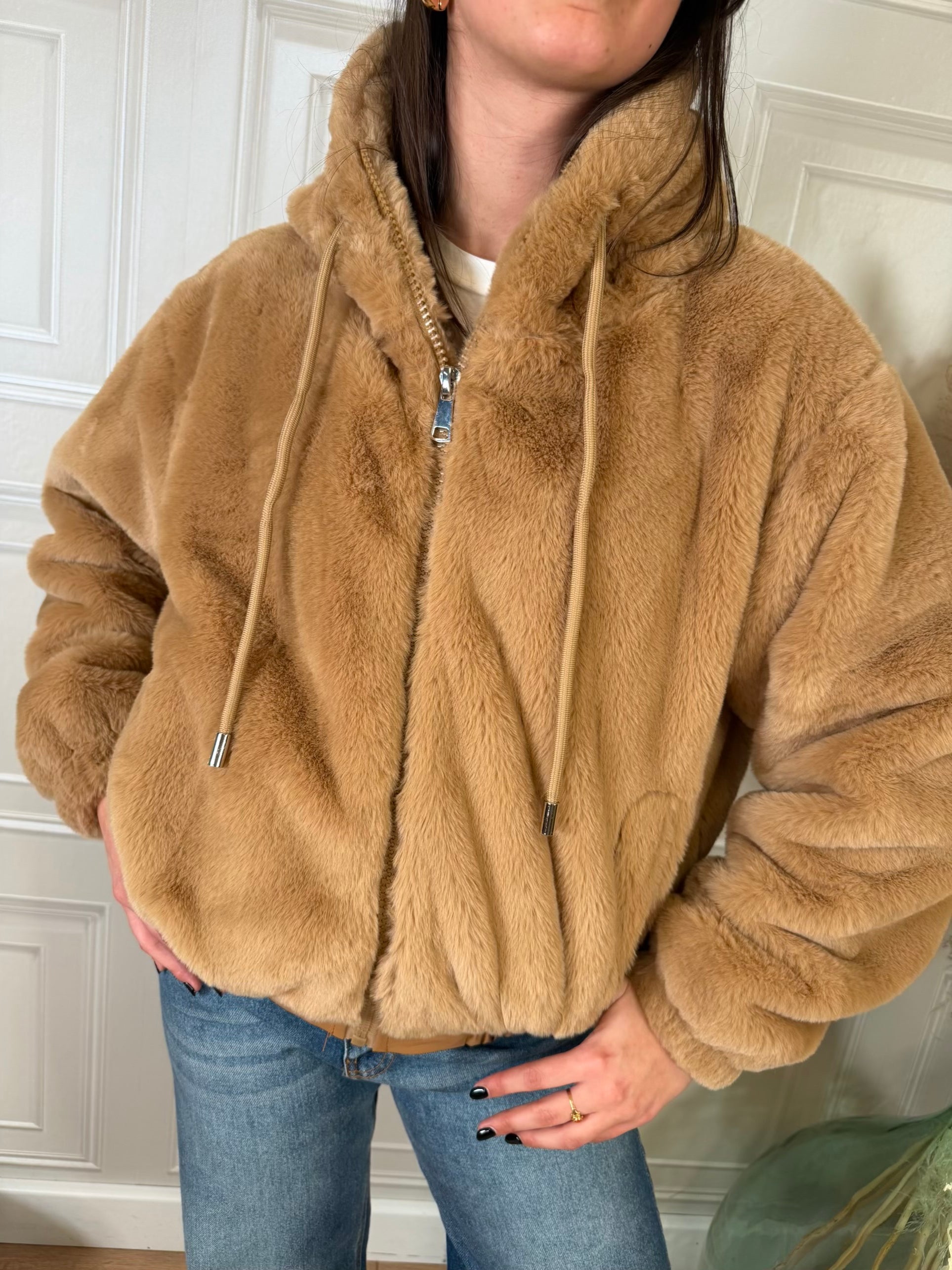 Eco pelliccia a pelo corto. Modello bomber con cappuccio è chiusura con zip sul fronte.
